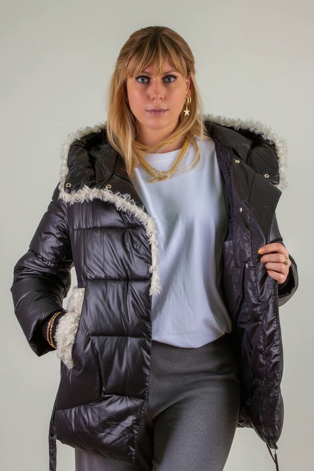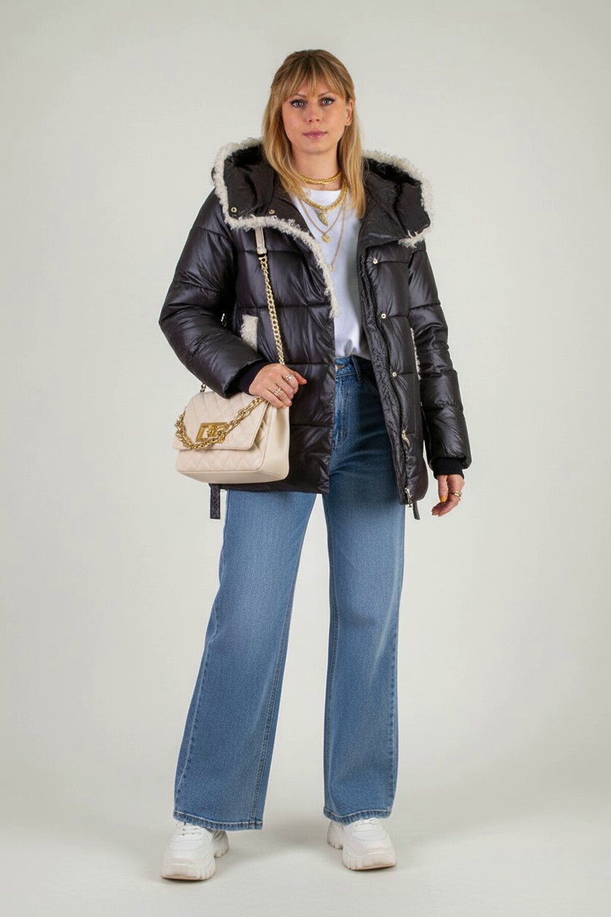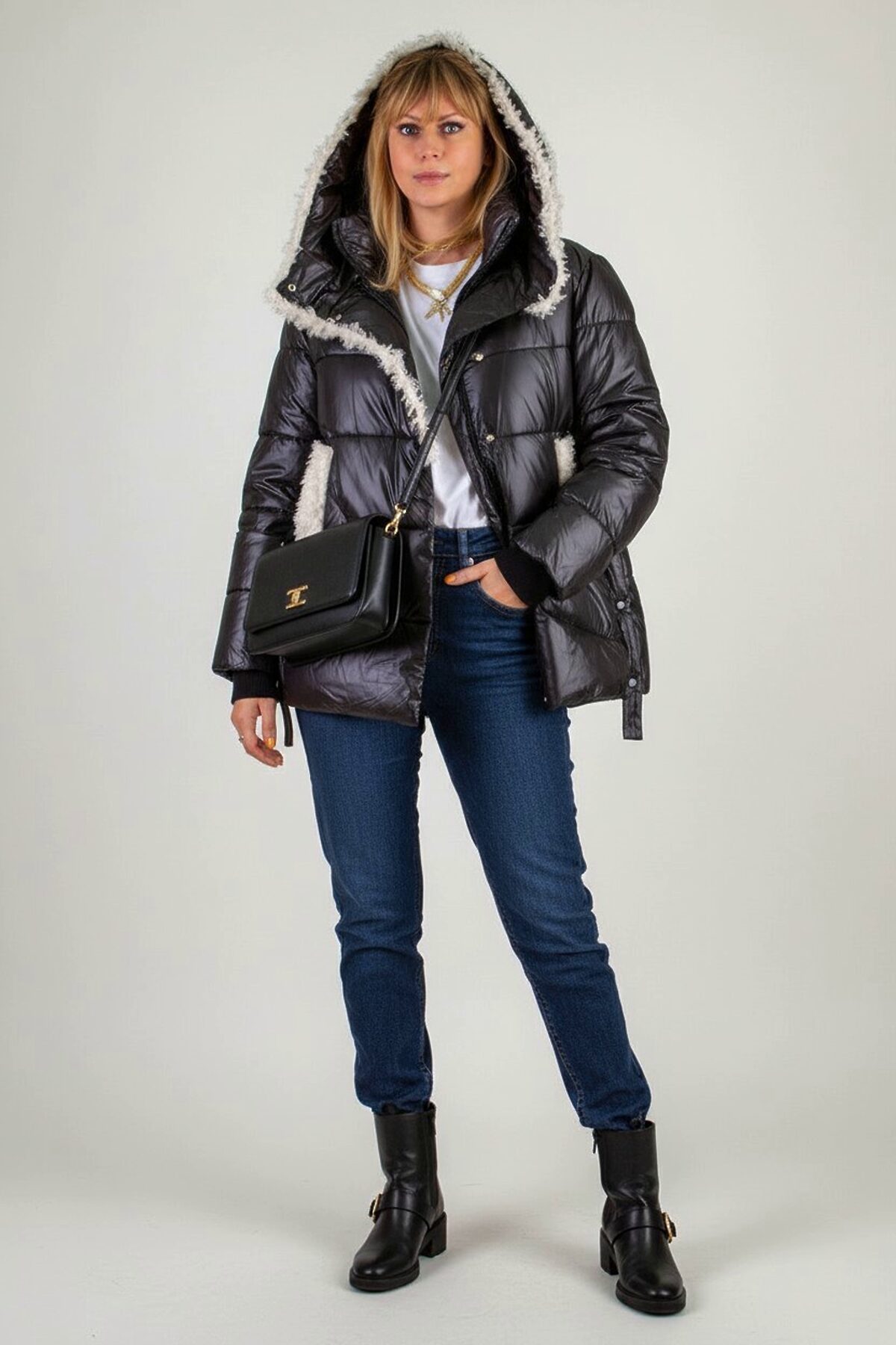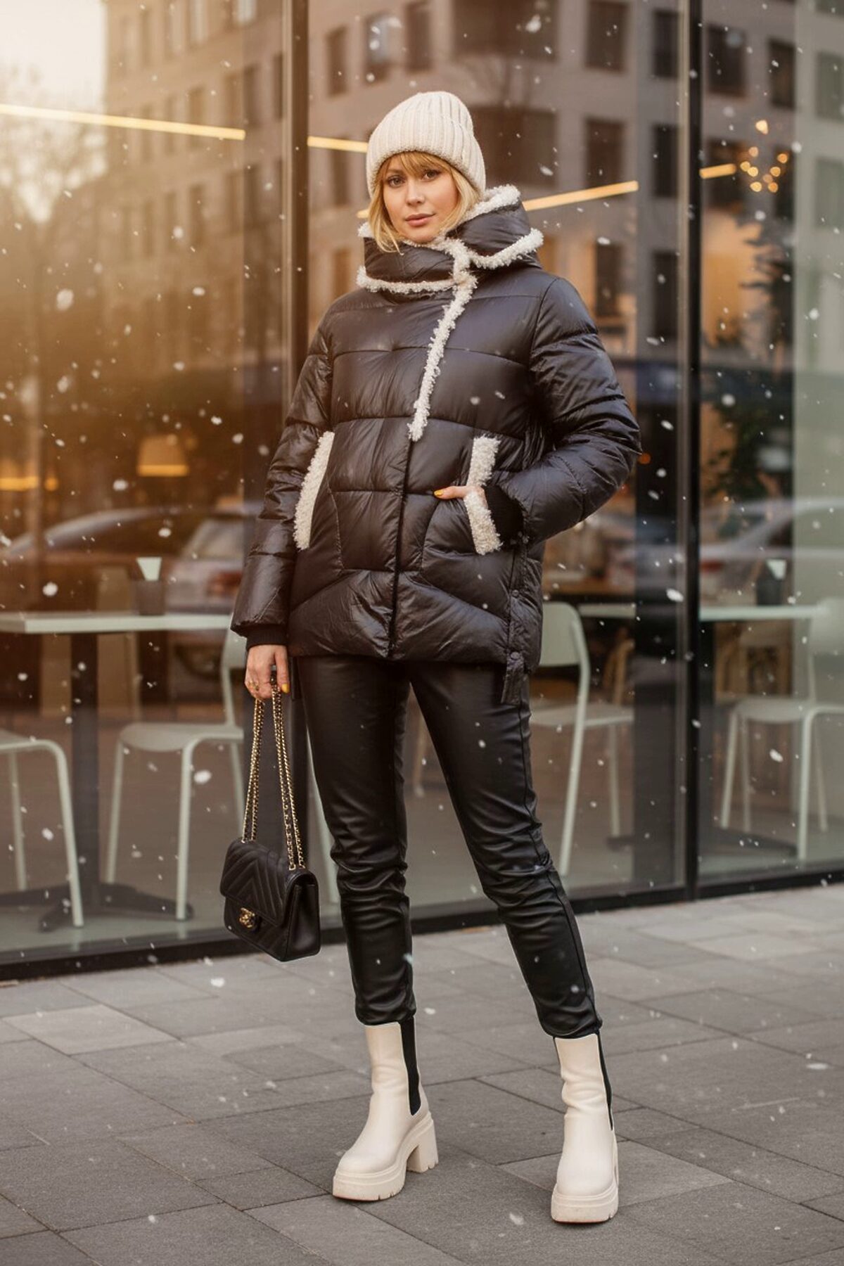 Стильная зимняя куртка арт. 2813 это идеальный выбор для тех, кто ценит продуманный дизайн, высокую функциональность и комфорт в холодное время года. Модель разработана в современном свободном крое, который не ограничивает движений и подходит для любого типа фигуры. Средняя длина куртки надёжно защищает бедра от ветра, а лёгкая невесомость изделия позволяет носить её даже в активном ритме городской жизни. Основной материал качественная глянцевая ткань с водо- и грязеотталкивающей пропиткой. Она не впитывает влагу, пыль и шерсть домашних животных, легко очищается и сохраняет безупречный лоск на протяжении всего сезона. Застёжка-молния дополнена утеплённой ветрозащитной планкой на кнопках, препятствующей проникновению холодного воздуха. Наполнитель файбер высококачественный утеплитель, обладающий лёгкостью, упругостью и гипоаллергенными свойствами. Простёганная классическим способом (не ультрастеп) конструкция гарантирует равномерное распределение волокон по всему объёму куртки, исключая образование холодных зон. Особое украшение куртки два боковых кармана на кнопке, обрамлённые искусственным мехом барашек нежно-белого оттенка. Тот же ворс используется на капюшоне и верхней части воротника до линии талии, придавая образу утончённость и лёгкую роскошь. Декоративная планка с кнопками по бокам визуально стройнит силуэт, при этом куртка остаётся свободной и не сковывает движений. Удобные детали: трикотажные манжеты на рукавах надёжно блокируют холод, а глубокий капюшон с кнопочной фиксацией легко трансформируется в высокий воротник-стойку. Внутренний карман на молнии сохранит ваши документы и гаджеты в безопасности. Черный универсальный цвет делает эту модель особенно практичной: она идеально гармонирует с любым гардеробом от джинсов и спортивных брюк до классических платьев. Куртка art. 2813 предназначена для суровых зим или евро-зимы с температурами до 20 C (при грамотном подборе базового слоя). Преимущества: современный комфортный крой; лёгкость и мягкость при сохранении тепла; качественные швы и фурнитура; эксклюзивные декоративные элементы; практичная длина и защищённость от непогоды. Выбирая куртку арт. 2813, вы получаете стильное, тёплое и функциональное изделие, которое станет украшением вашего зимнего гардероба и подарит чувство уюта даже в морозные дни.