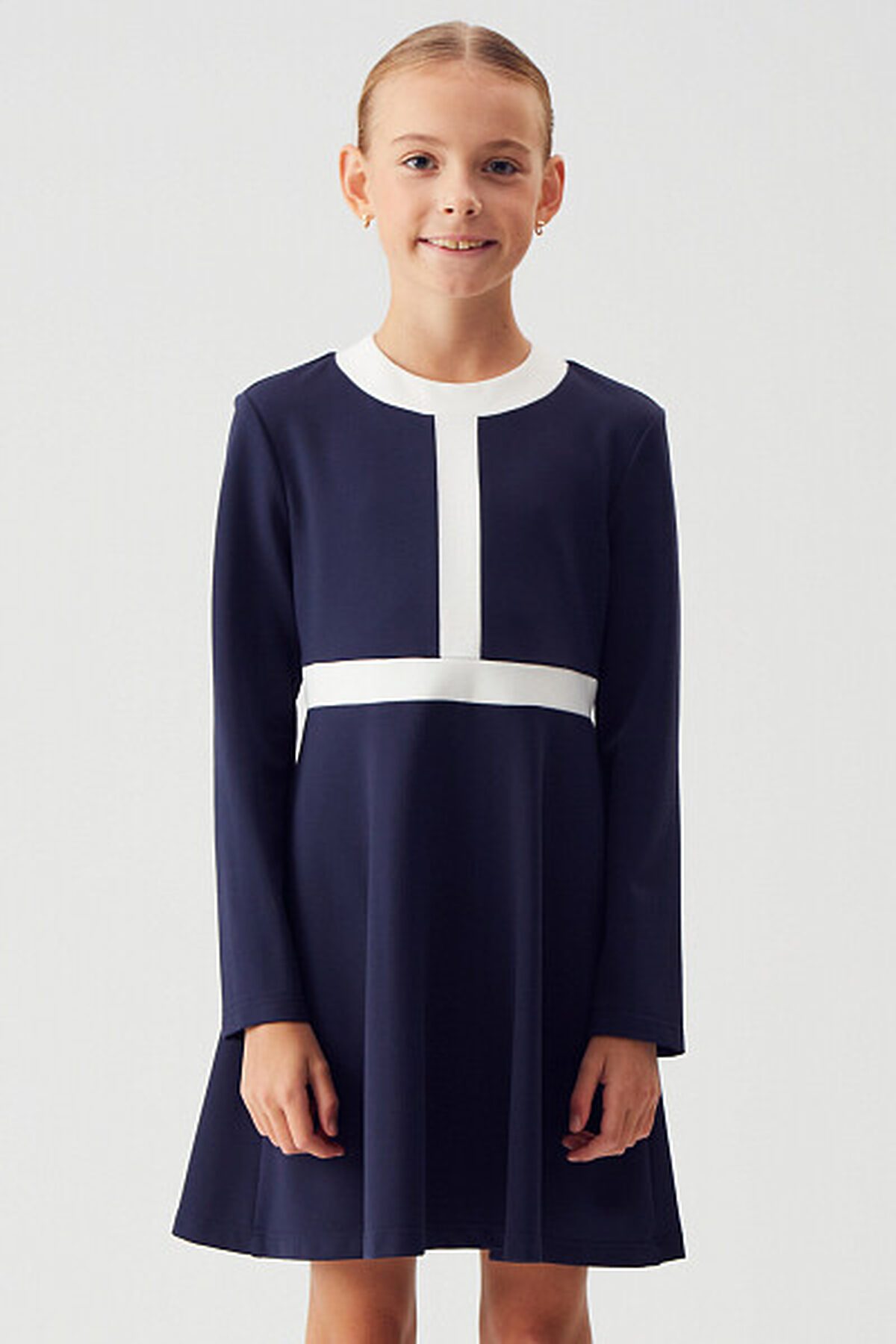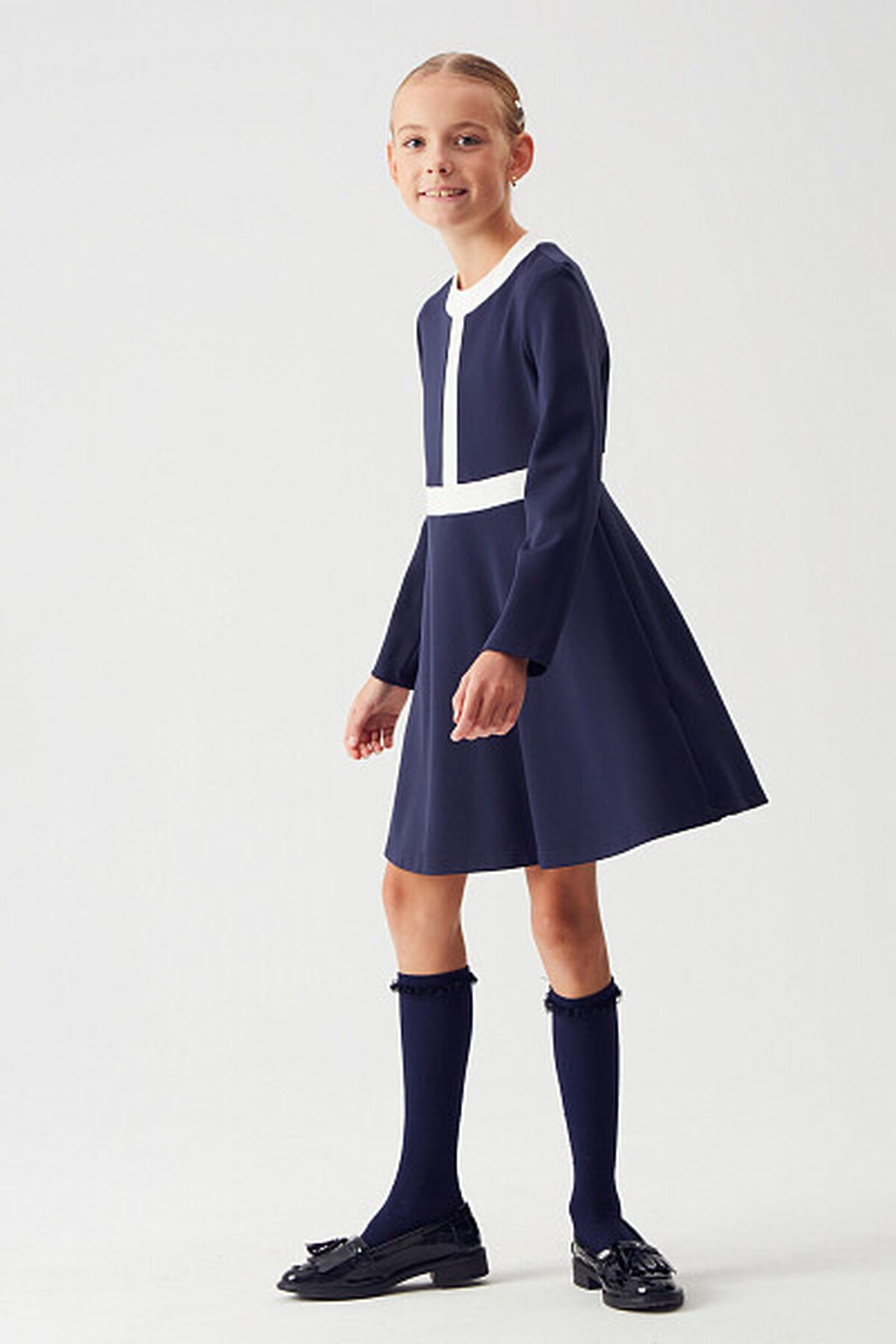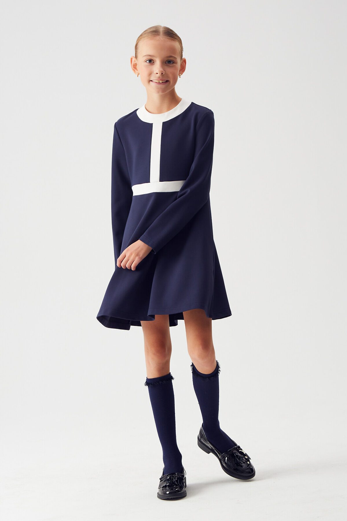 Отрезное по линии талии изделие, оснащено застежкой на потайную тесьму «молния» в среднем шве спинки. Вставка-пояс притачена вкруговую к лифу и юбке, создавая утонченный силуэт. Длинные прямые рукава добавляют нотку строгости и уместны для учебных заведений. Юбка расклешенная к низу обеспечивает свободу движений и стильный внешний вид. В боковых швах юбки предусмотрены карманы.