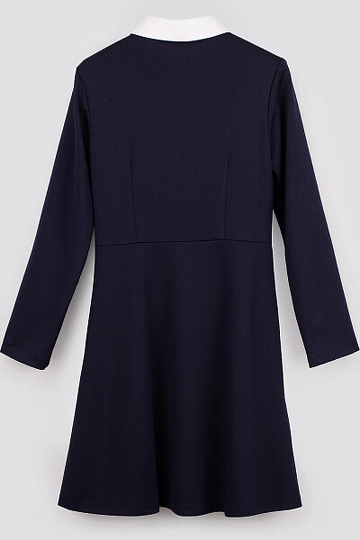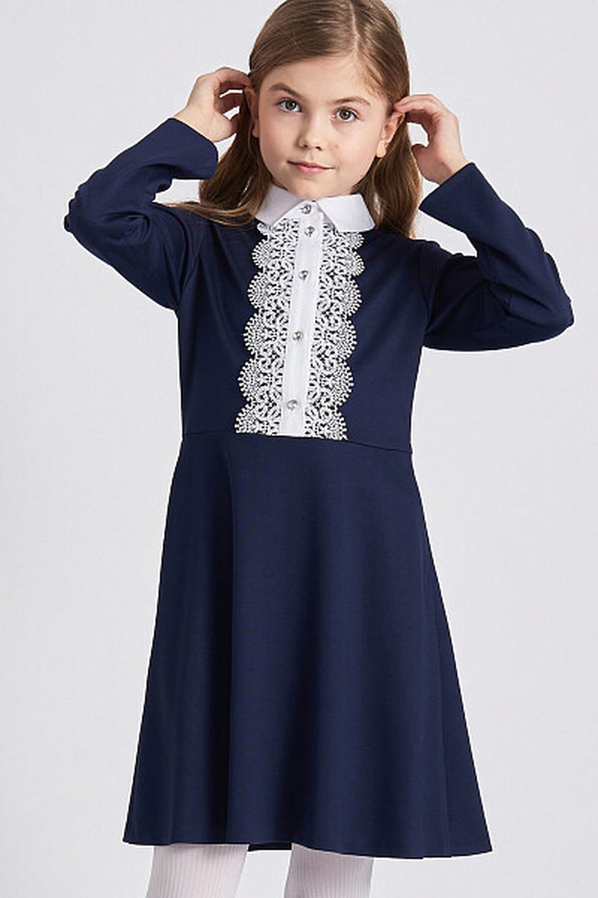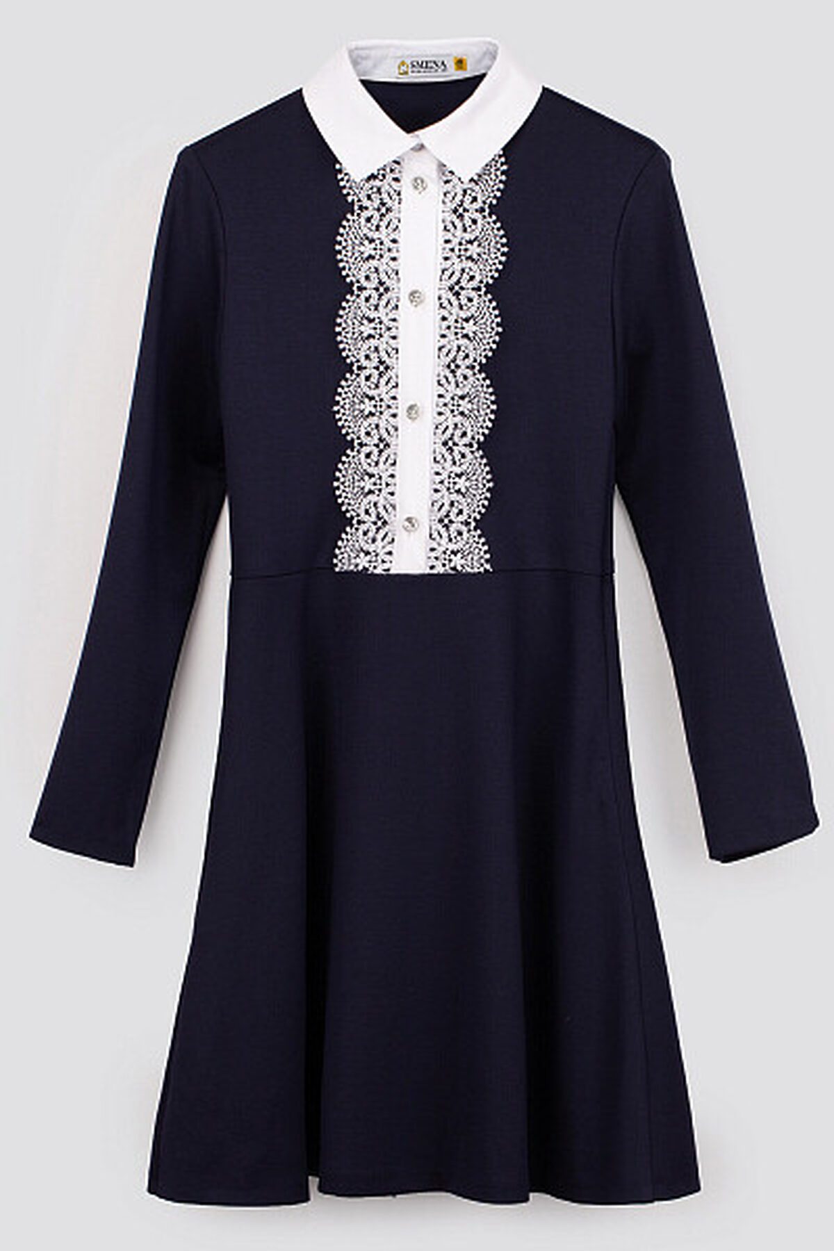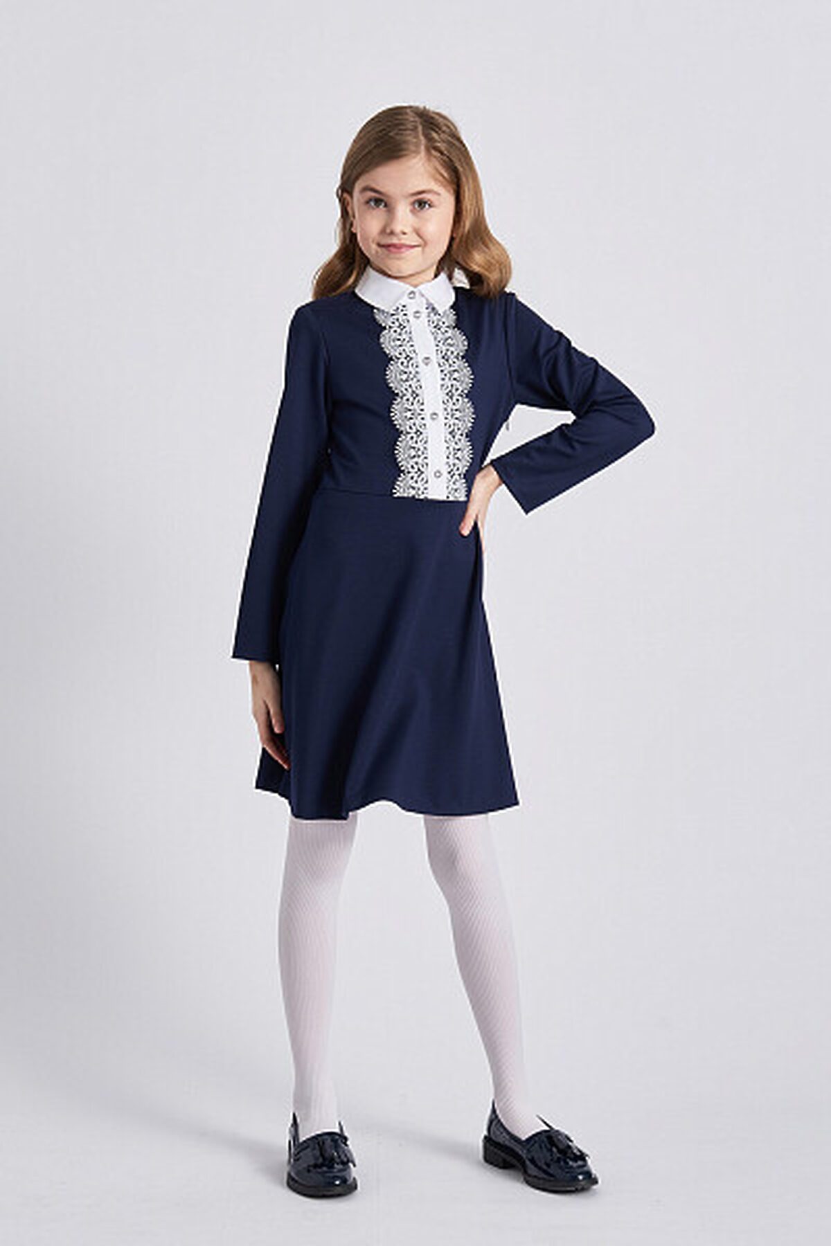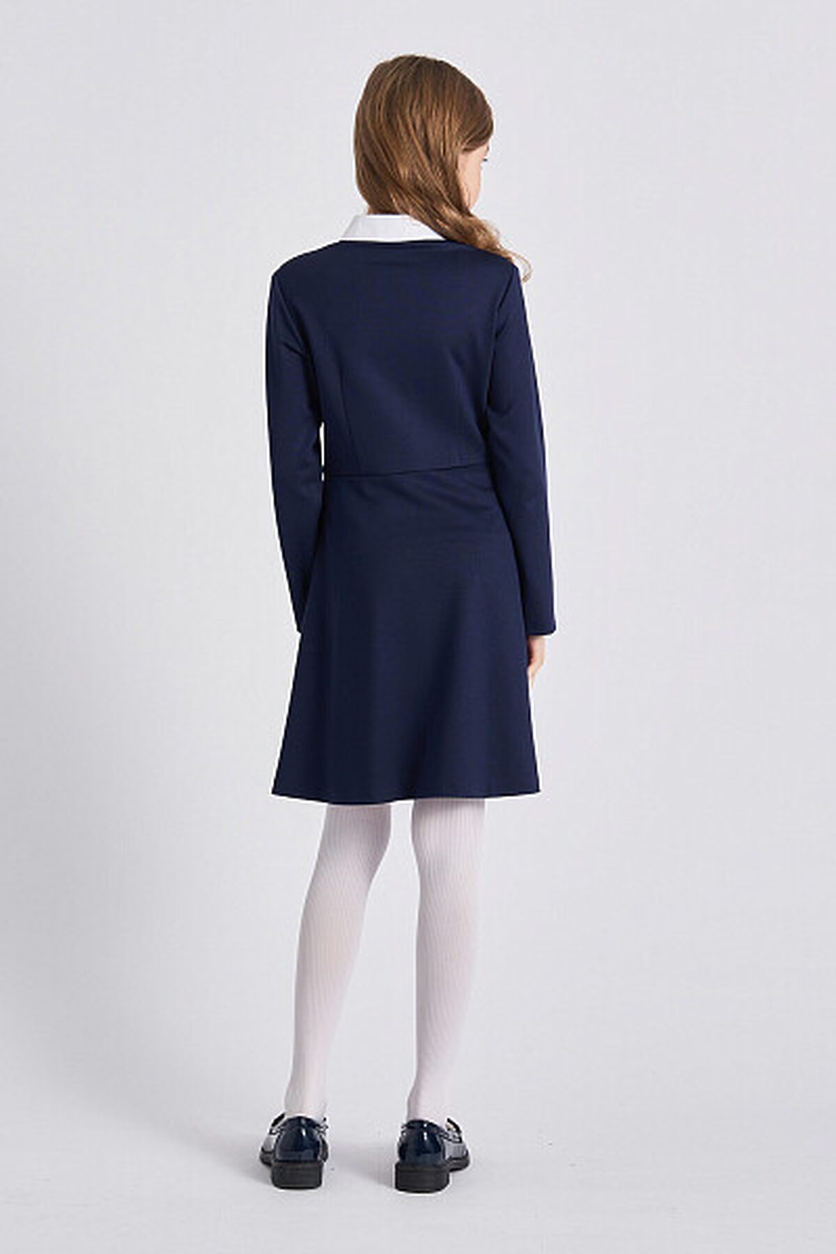 Элегантное трикотажное платье в романтичном стиле с отрезной по линии талии юбкой с мягкими складками и длинными втачными рукавами. Лиф платья по цетру украшен планкой белого цвета с пуговицами и кружевом по краям. Съемный воротник белого цвета обеспечивает не только удобство в уходе, но и возможность разнообразить ежедневный образ. В боковых швах юбки расположены карманы. Застежка на потайную молнию на спинке не нарушает конструкцию и обеспечивает идеальную посадку.