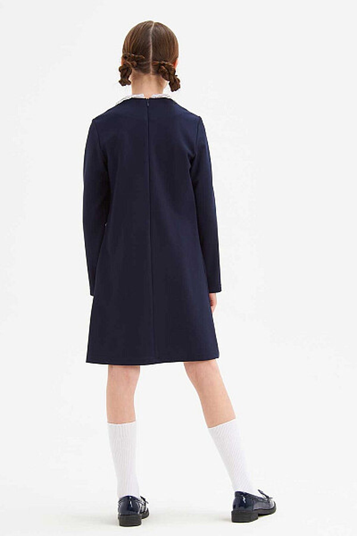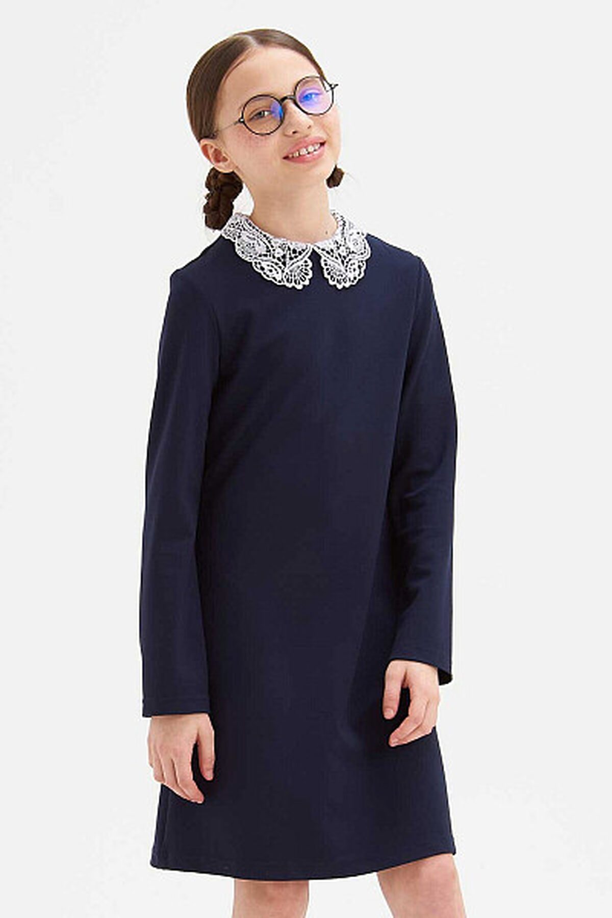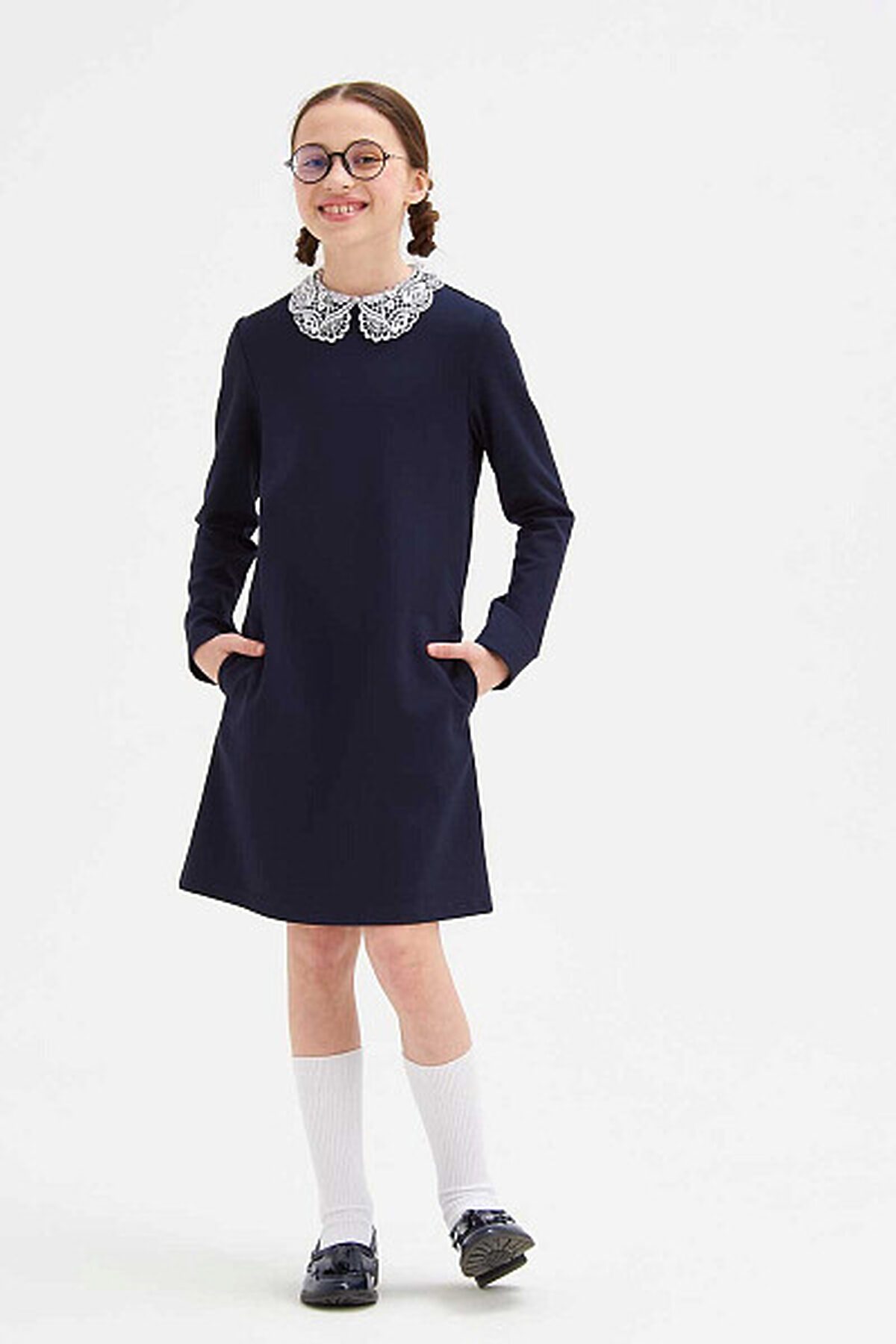 Трикотажное платье прилегающего силуэта с длинными рукавами. Съемный воротник выполнен из кружева. В боковых швах карманы. Потайная молния на спинке - удобная застежка, с которой справится даже первоклашка.