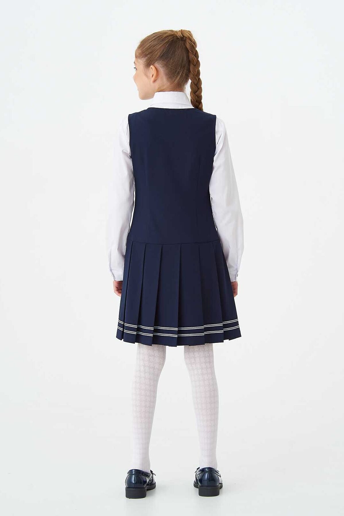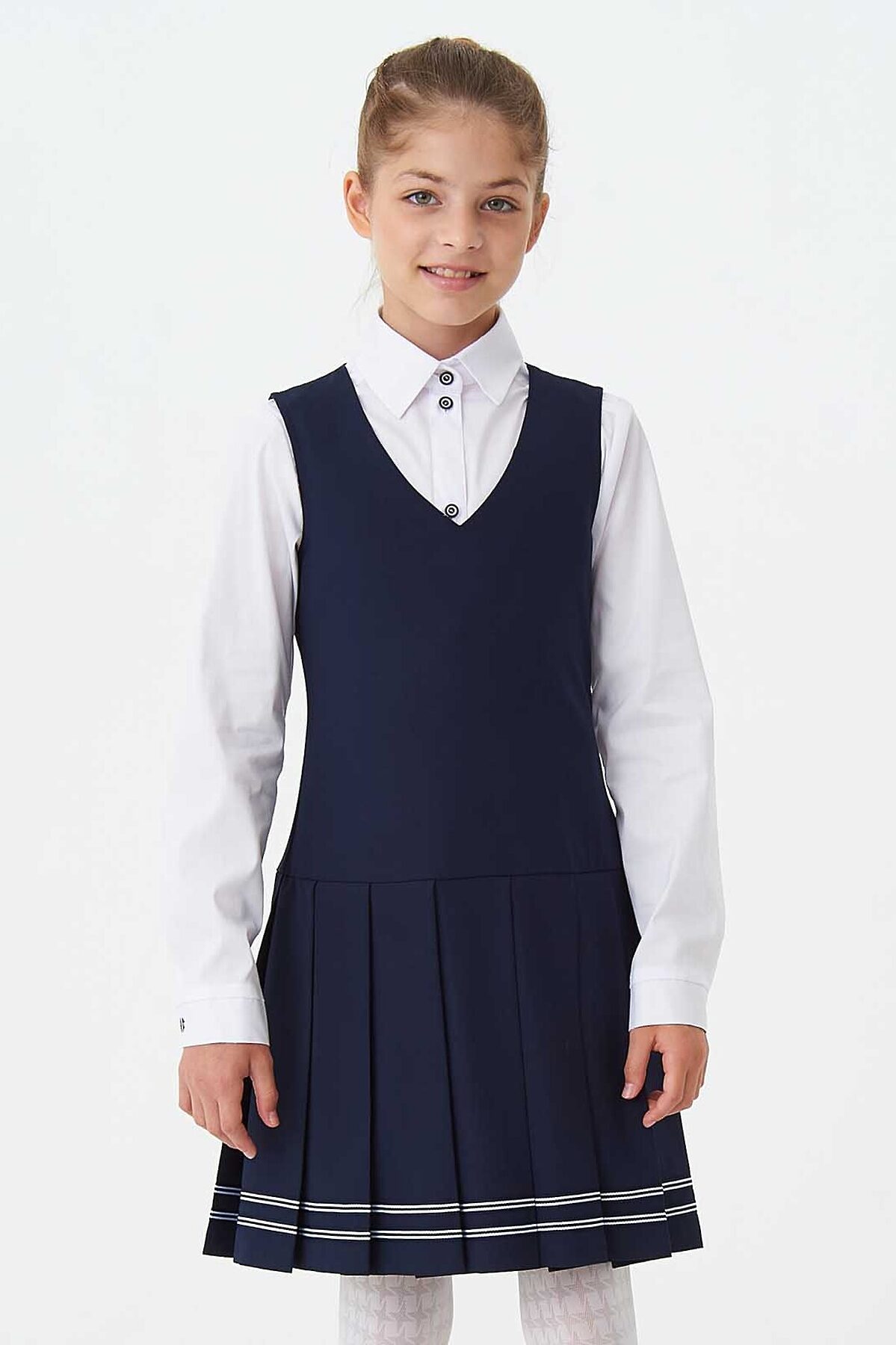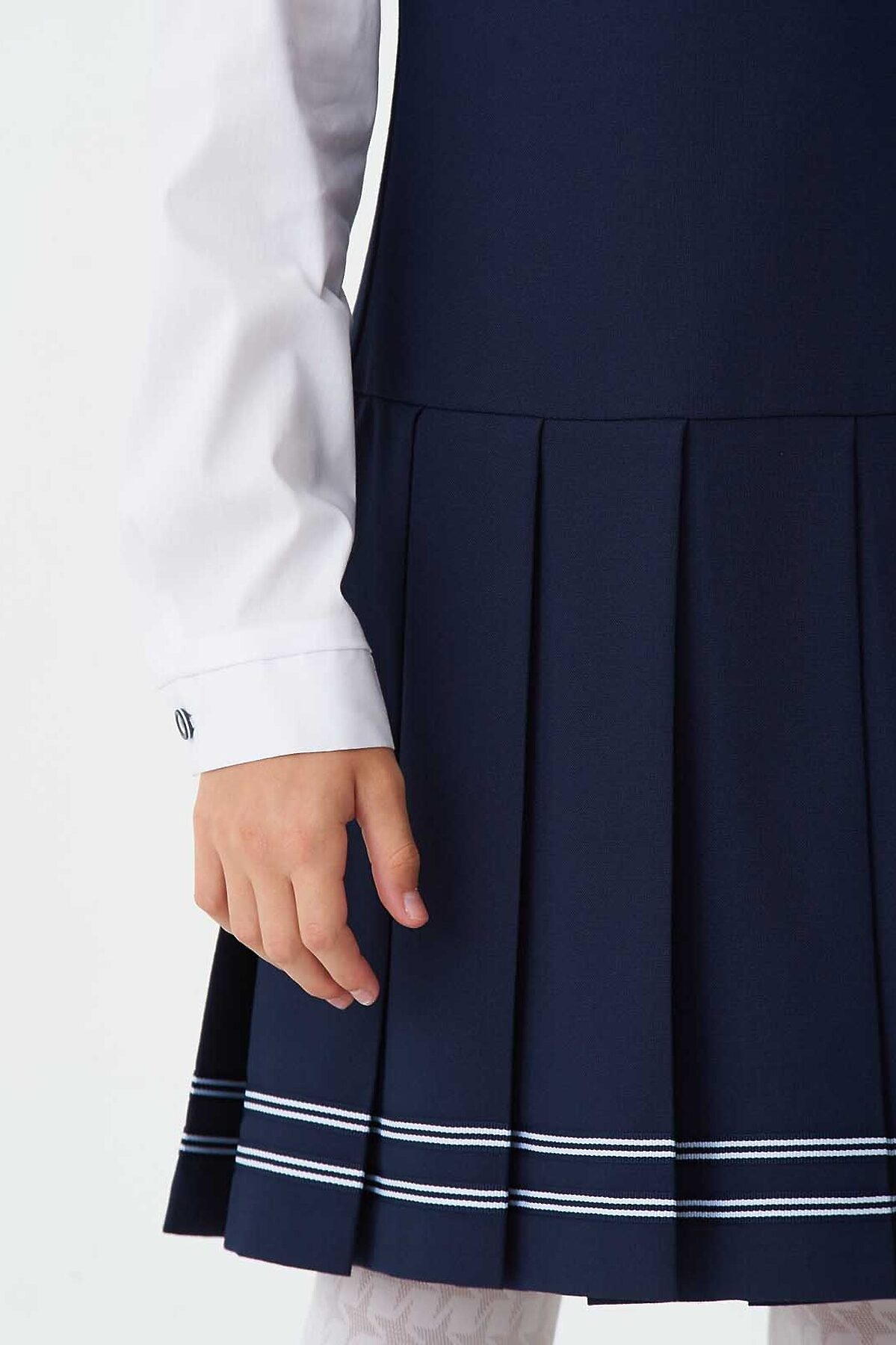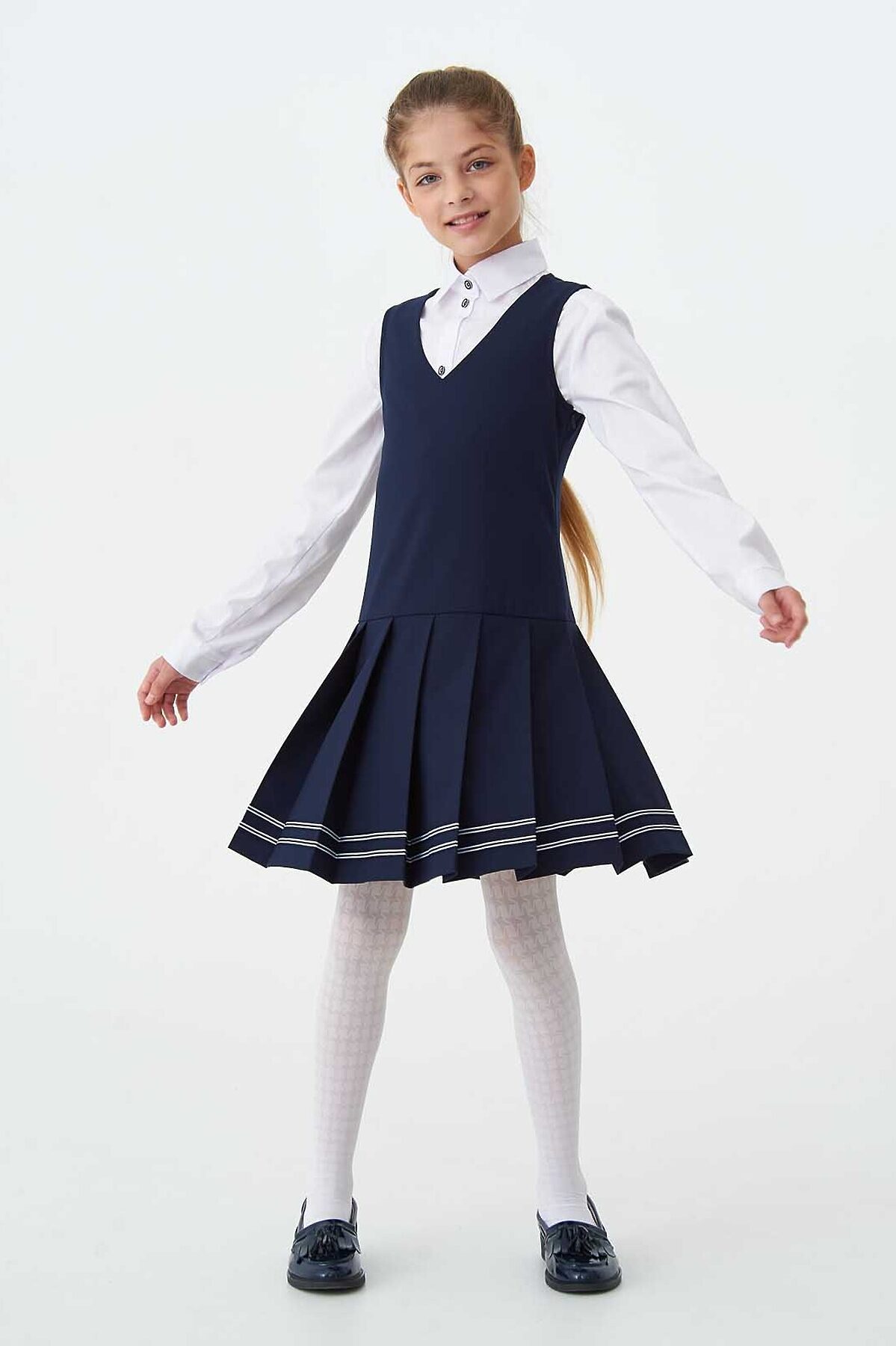 Элегантный сарафан из износостойкой поливискозы, отрезной по линии талии с V-образным вырезом горловины. Юбка в широкую складку по низу украшена лентой в контрастную сине-белую полосу. Потайная молния в боку.