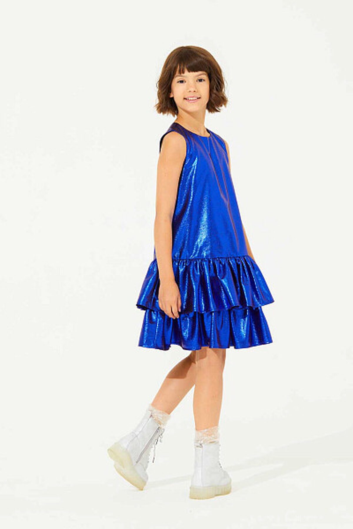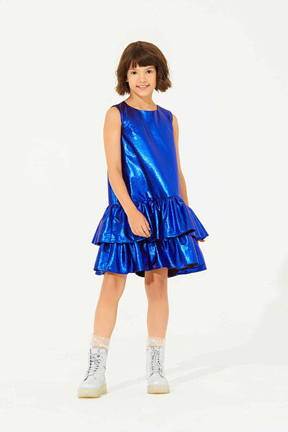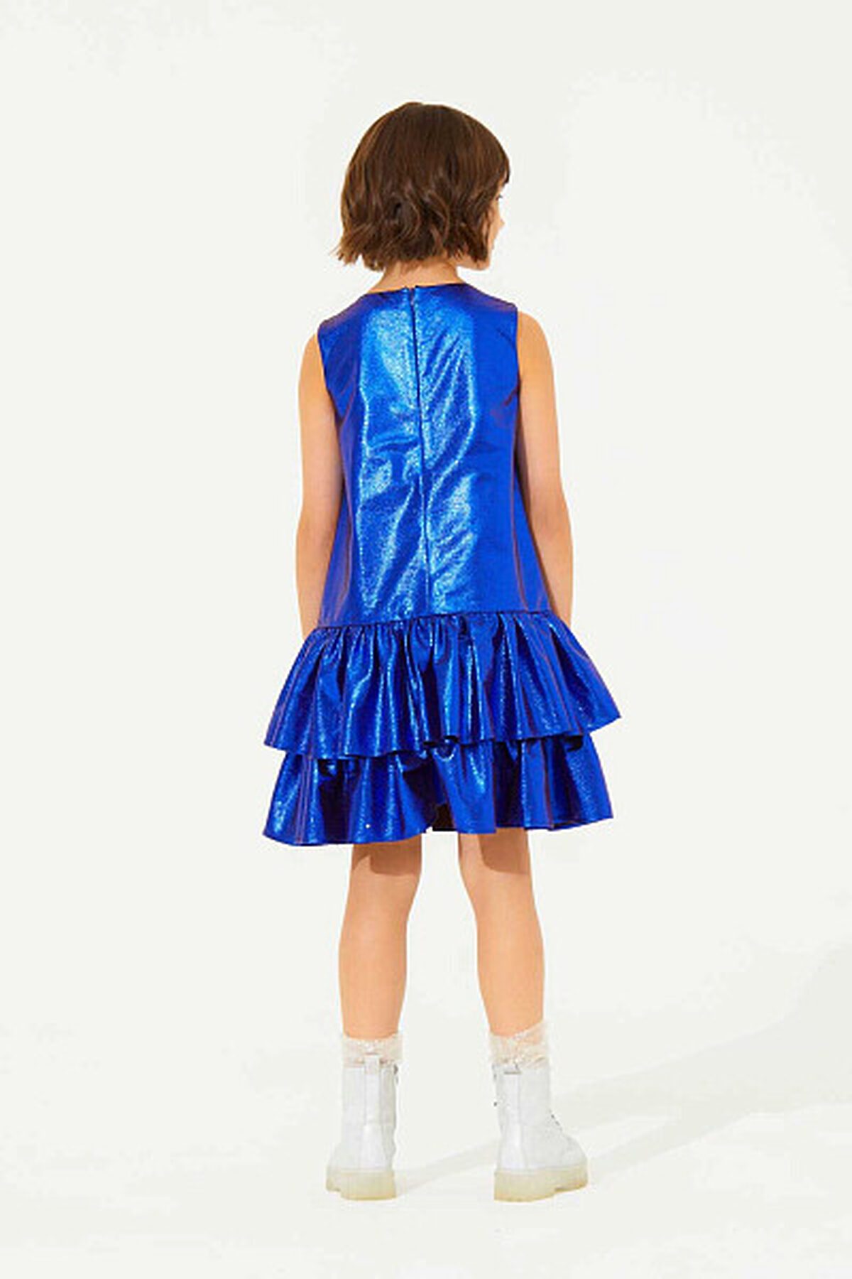Стильное платье прямого силуэта, которое идеально подойдёт для новогоднего утренника. Верхний слой платья выполнен из блестящей ткани, а приятная к телу подкладка из хлопка обеспечивает комфорт и отводит влагу во время активных игр. У платья заниженная линия талии, по которой выполнена юбка из двух слоев пышных оборок. Застежка на потайную молнию по спинке обеспечивает легкость при надевании.