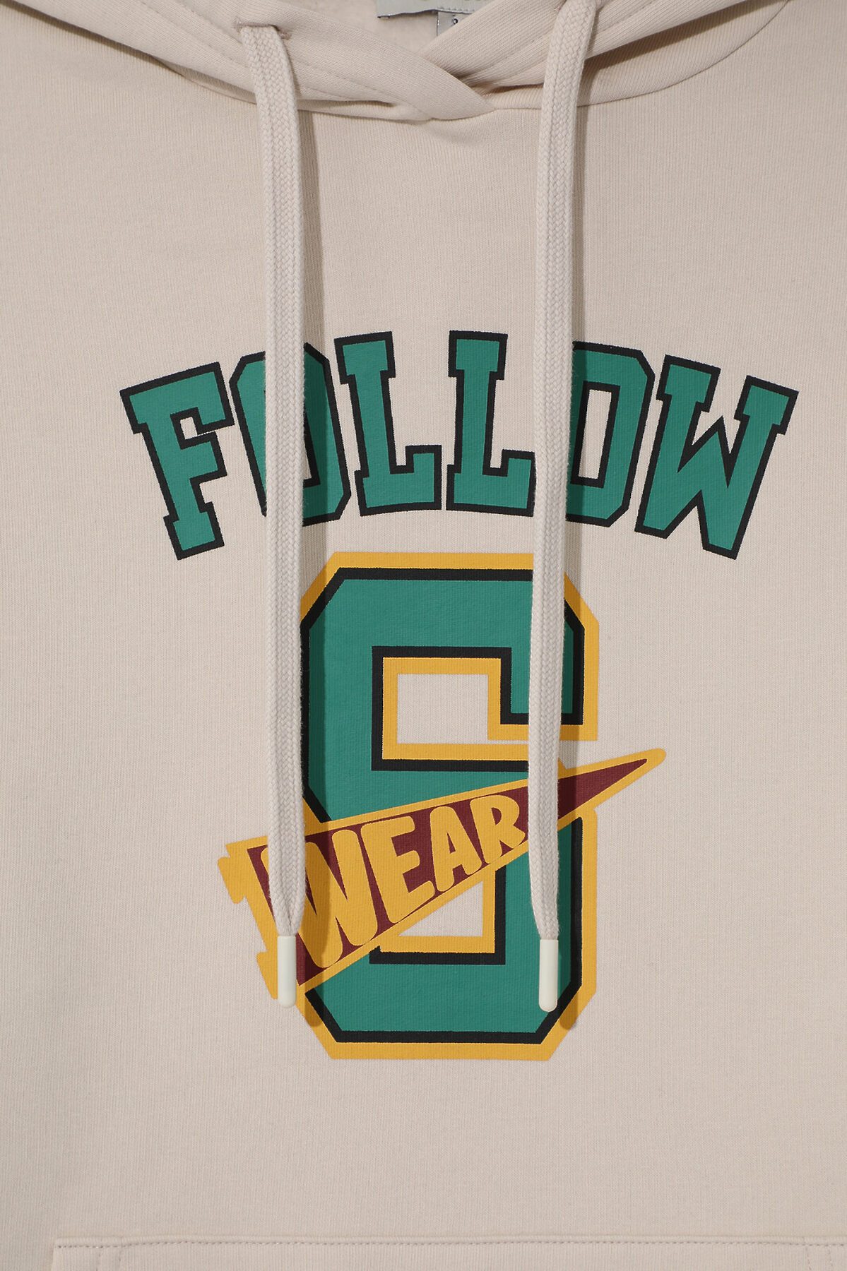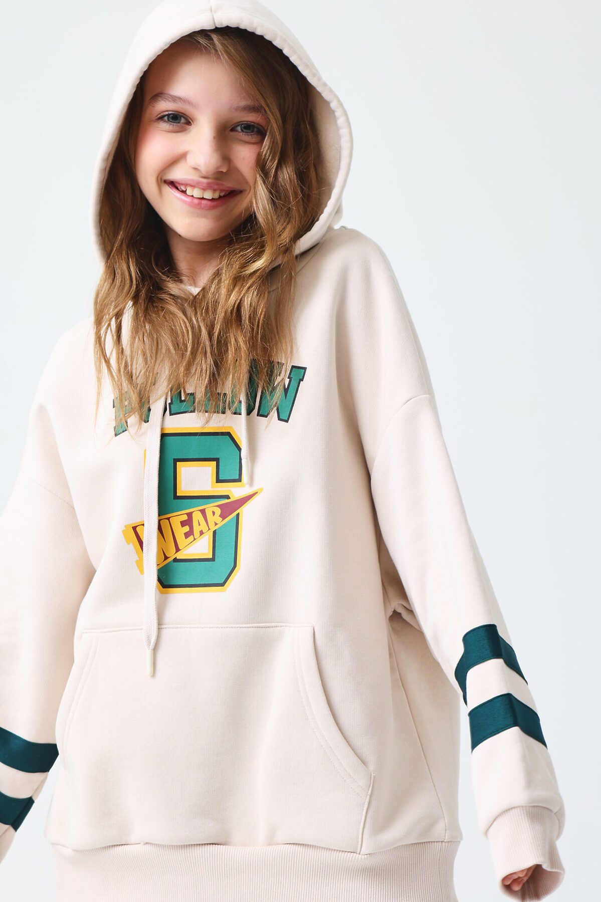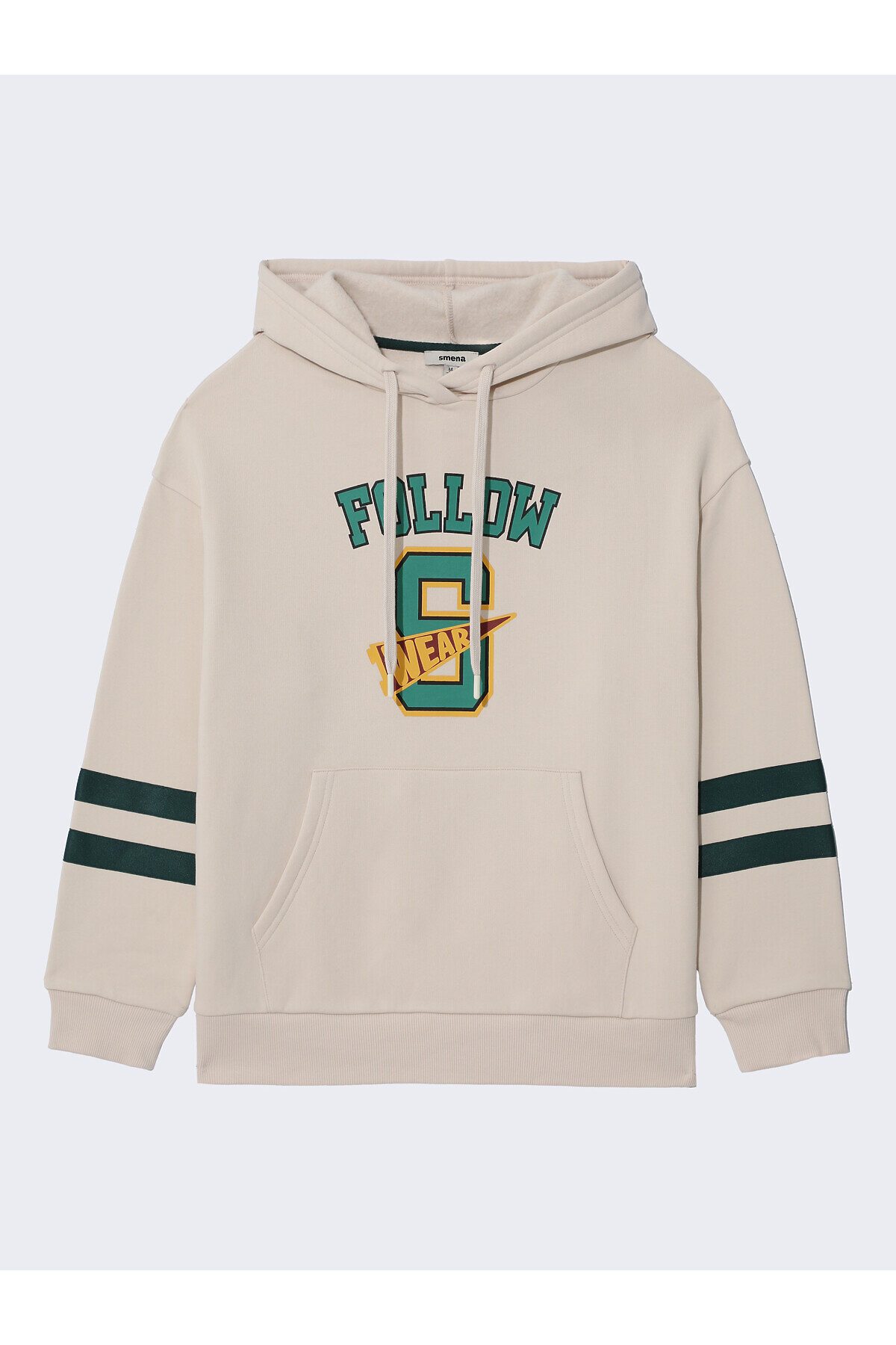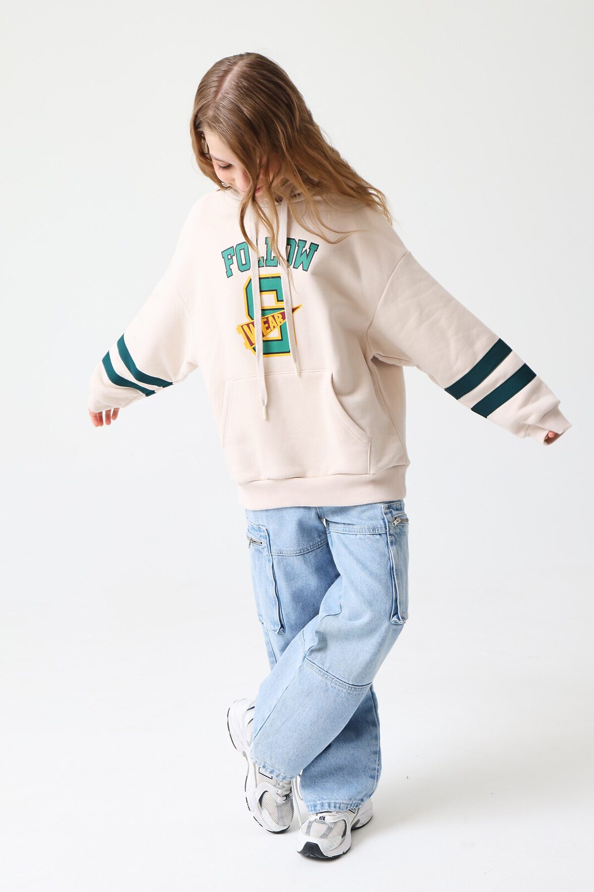 Объемное худи из футера с начесом оверсайз силуэта идеально для холодного времени года. Модель без застежки, с объемным капюшоном со шнурком для регулировки. Худи дополнено большим карманом-кенгуру и трендовым принтом на груди. Рукава оформлены контрастными полосками. Представлено в 2 цветах