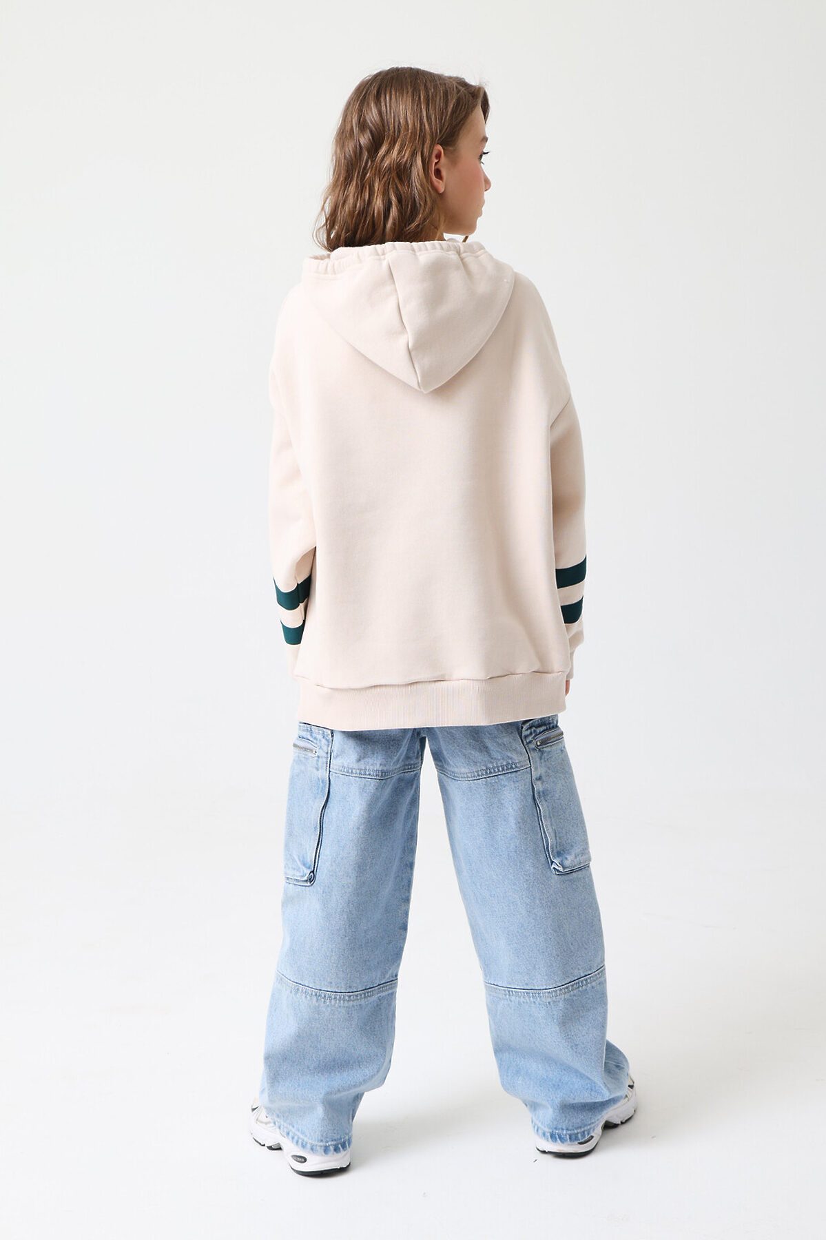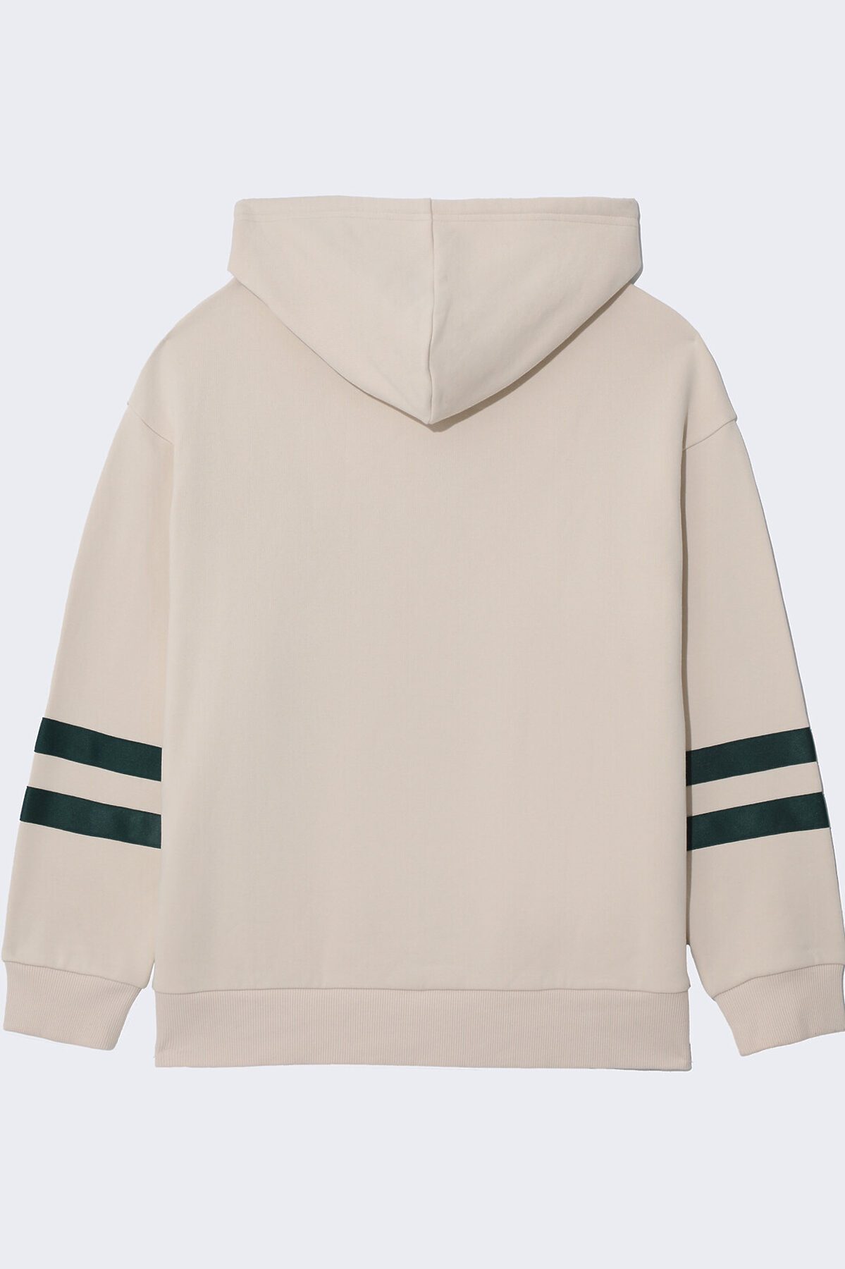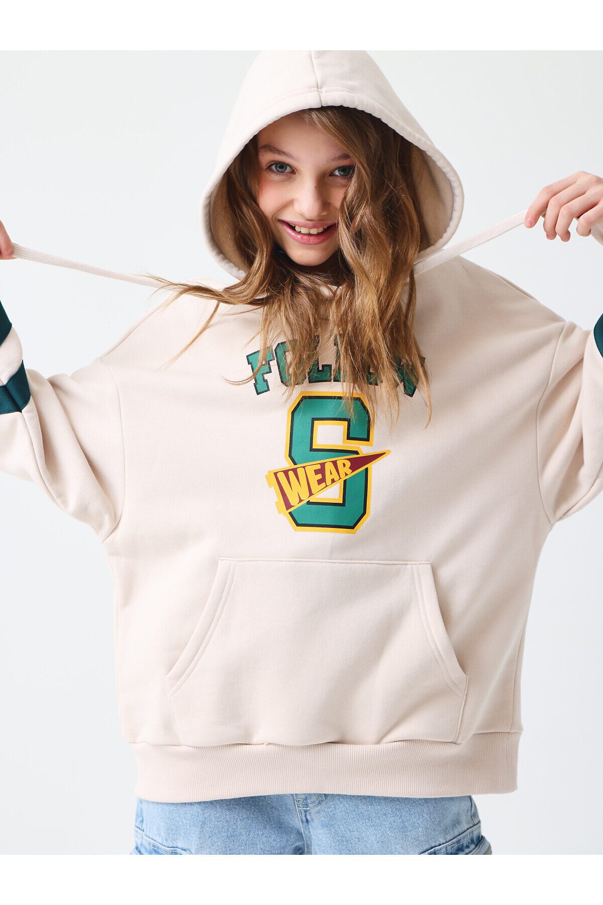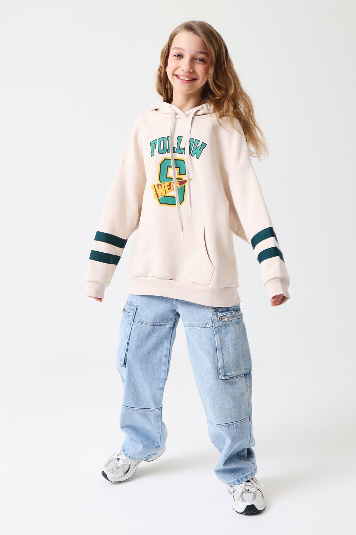 Объемное худи из футера с начесом оверсайз силуэта идеально для холодного времени года. Модель без застежки, с объемным капюшоном со шнурком для регулировки. Худи дополнено большим карманом-кенгуру и трендовым принтом на груди. Рукава оформлены контрастными полосками. Представлено в 2 цветах