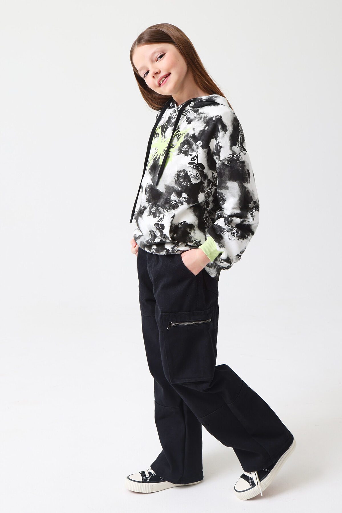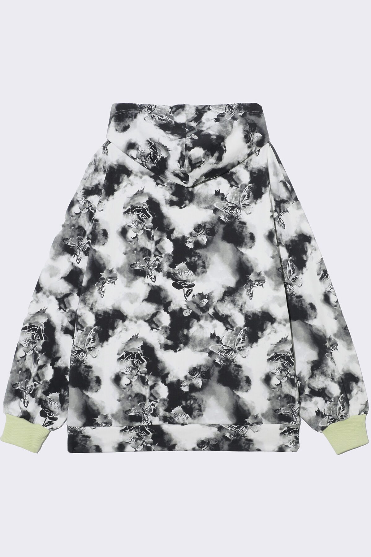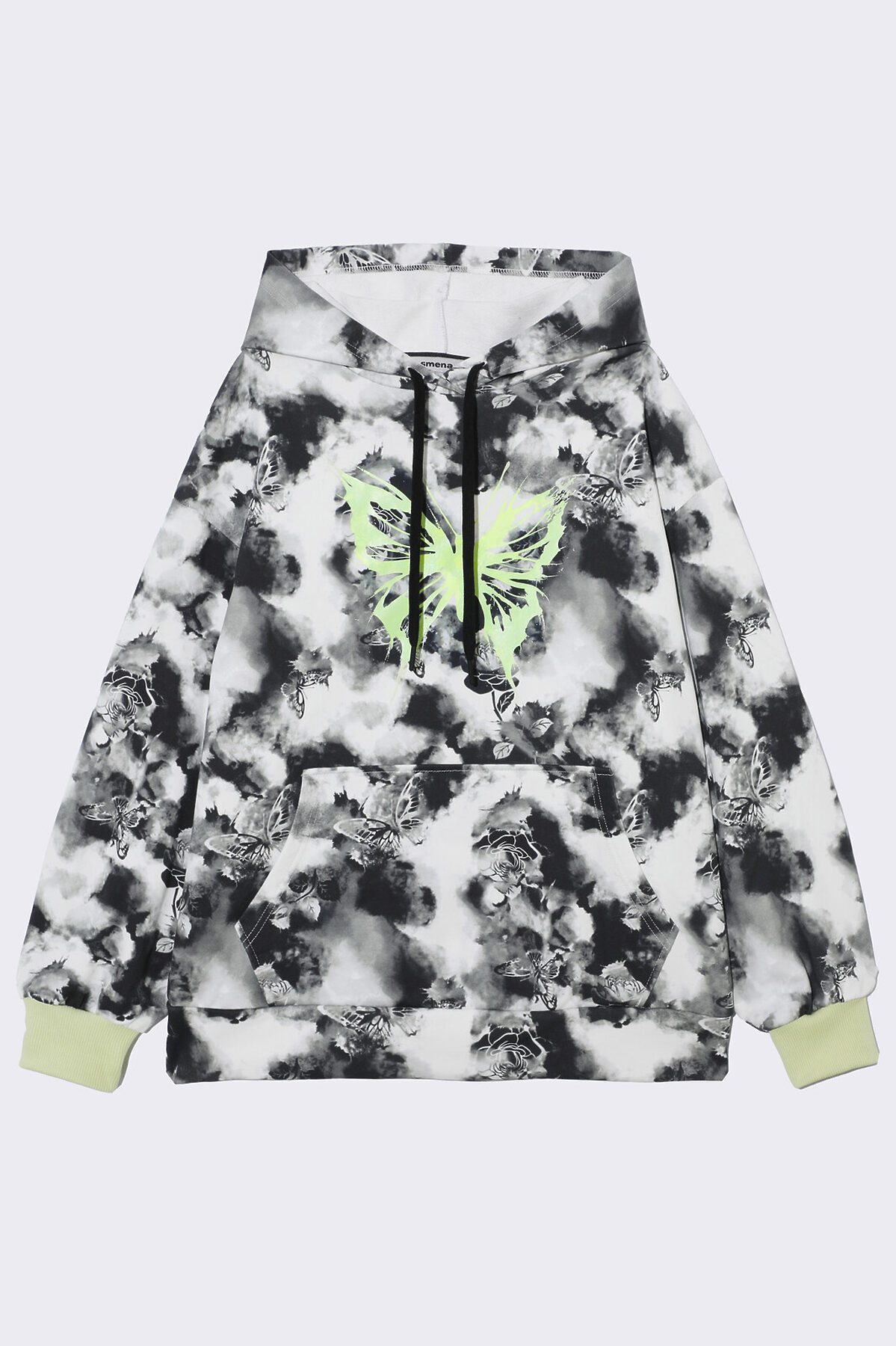 Объемное худи из футера с начесом, идеально подходящее для прохладного времени года. Толстовка без застежки, с объемным капюшоном со шнурком для регулировки. Модель в трендовом оверсайз силуэте с эффектом ""тай-дай"" также дополнена большим карманом-кенгуру и креативным принтом с яркой надписью. Худи с длинными рукавами оформлено трикотажными манжетами, а также манжетами на поясе и воротнике.