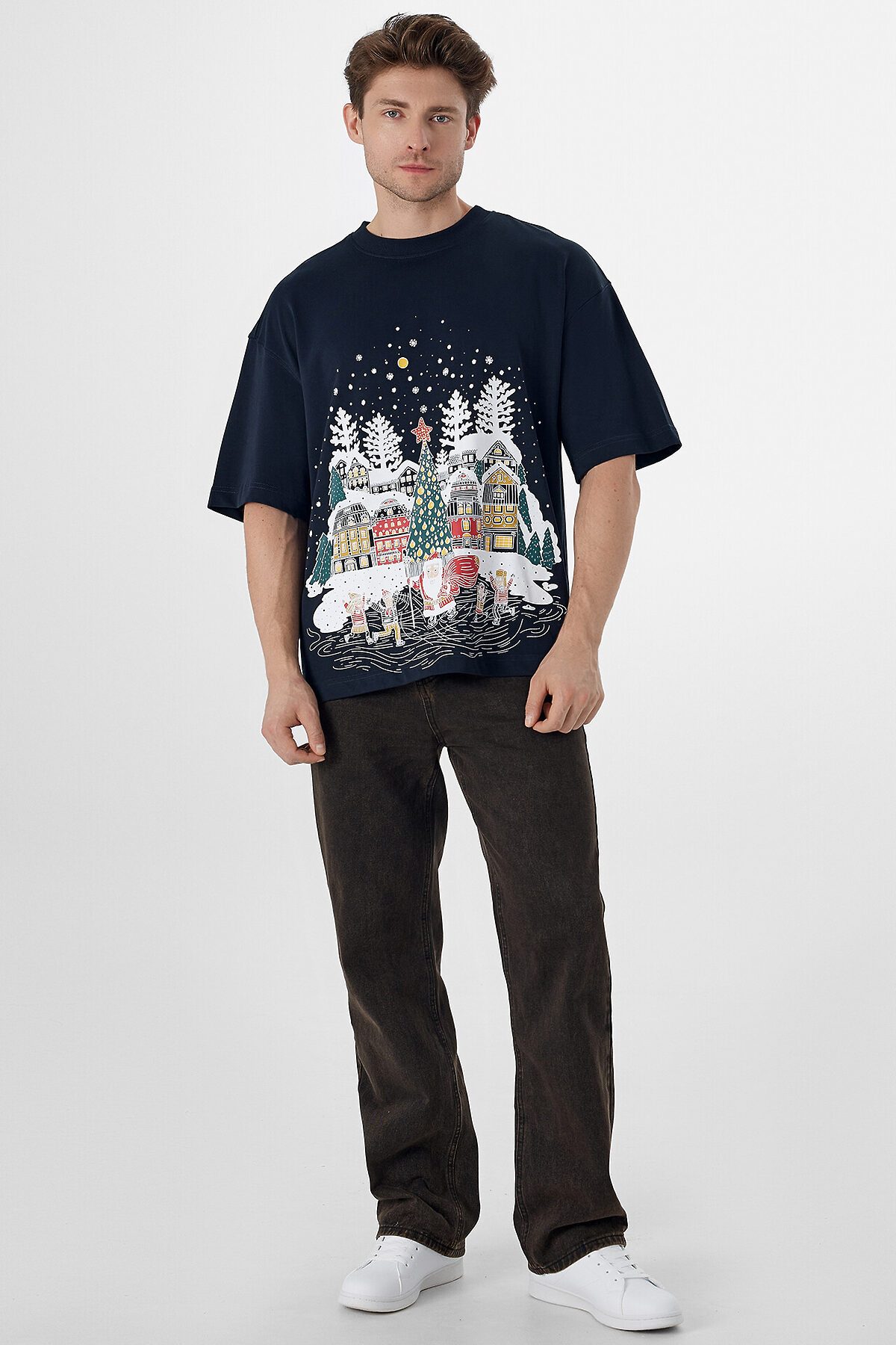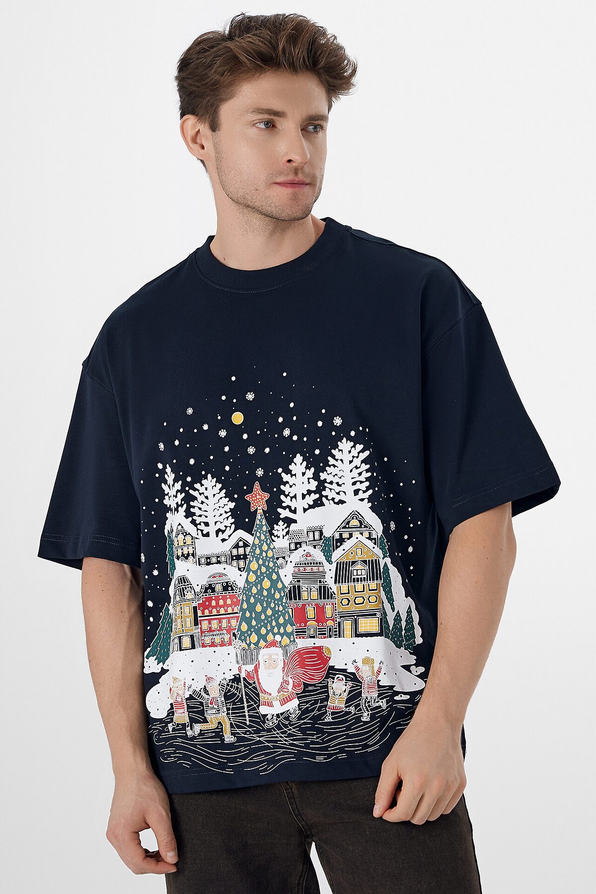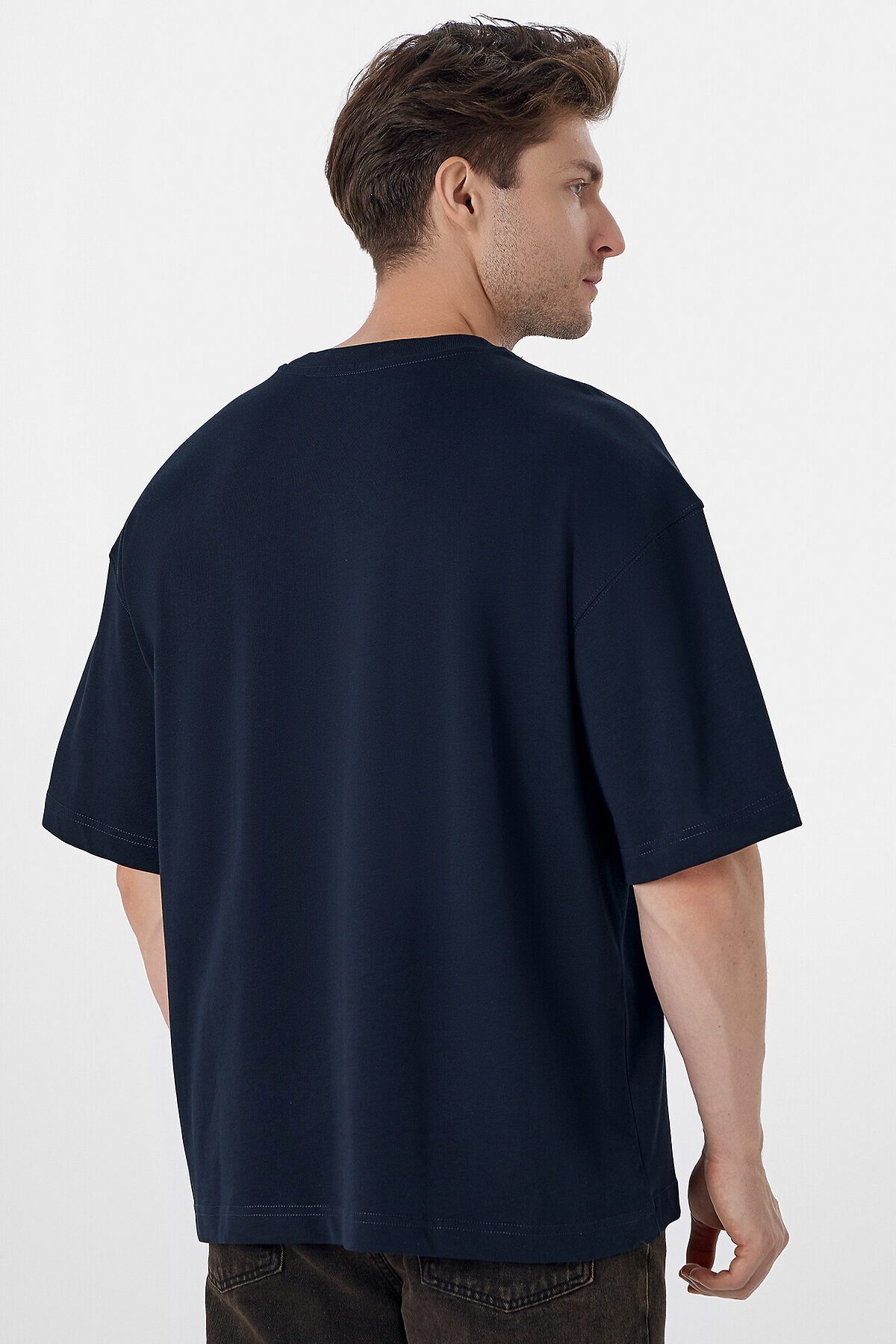 Футболка прямая свободная. Горловина округлой формы обработана обтачкой из рибаны. Шов втачивания обтачки по спинке закрыт бейкой из основного полотна. Линия плеча слегка спущена. Рукава втачные, корткие. Нижние срезы футболки и рукавов обработаны швом вподгибку на 2х шовной плоскошовной машине.