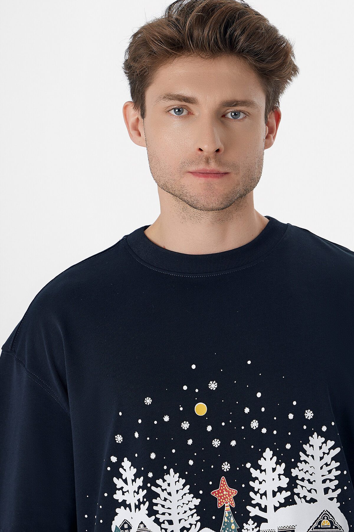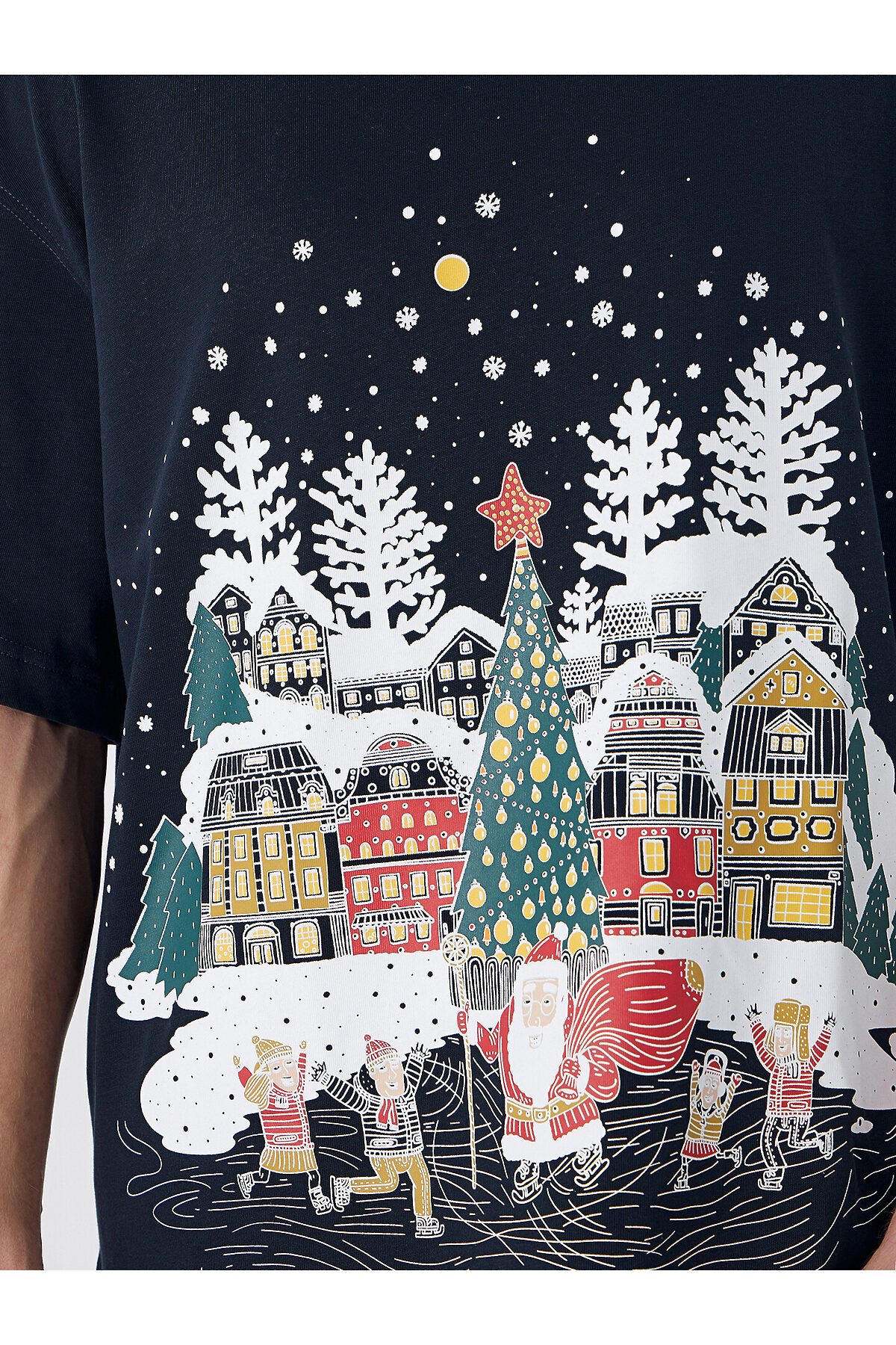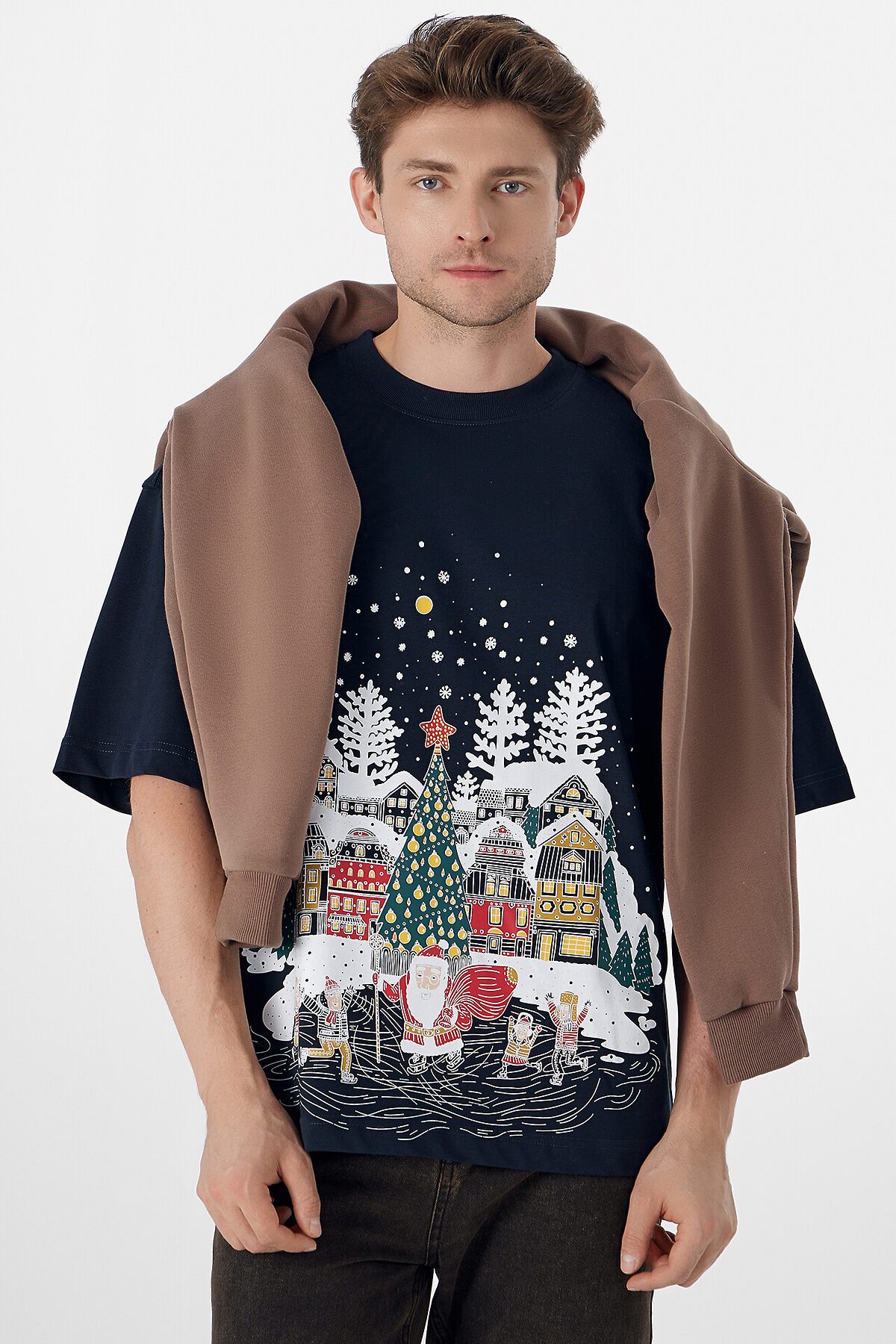 Футболка прямая свободная. Горловина округлой формы обработана обтачкой из рибаны. Шов втачивания обтачки по спинке закрыт бейкой из основного полотна. Линия плеча слегка спущена. Рукава втачные, корткие. Нижние срезы футболки и рукавов обработаны швом вподгибку на 2х шовной плоскошовной машине.