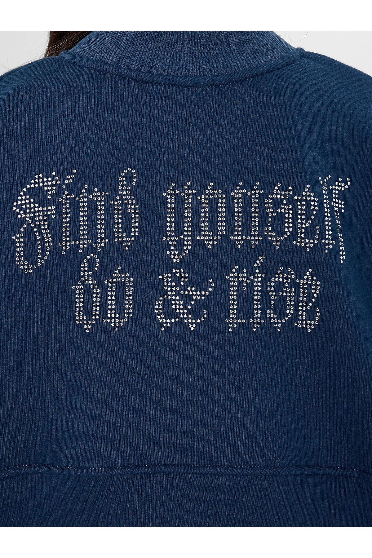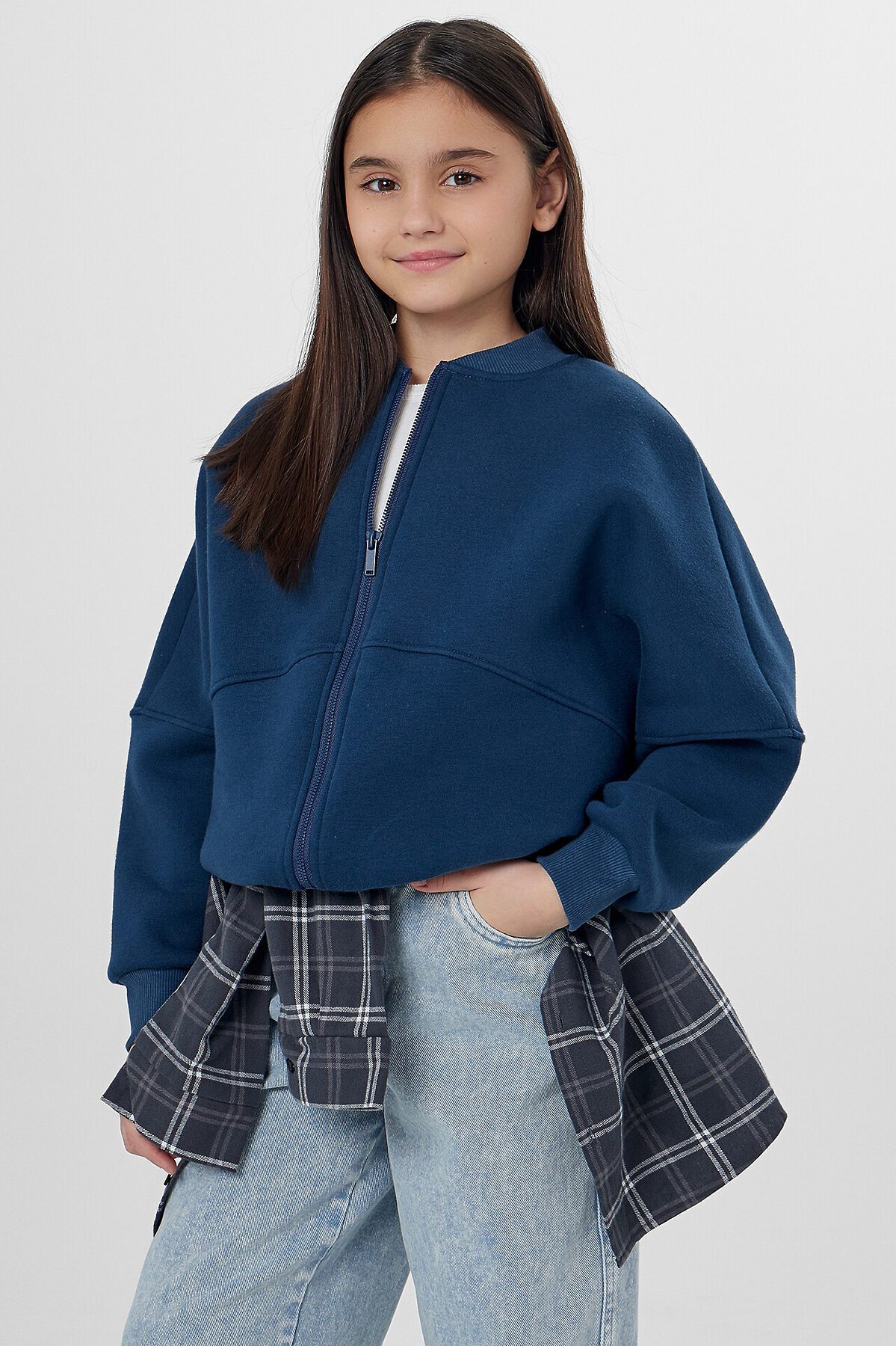 Толстовка свободного силуэта. Круглый вырез горловины. В горловину втачен воротник-стойка из рибаны. Рукава втачные, длинные. По низу рукава манжеты из рибаны. По переду застежка на молнию. По переду и спинки декоративные членения. По низу изделия отрезной пояс из рибаны.