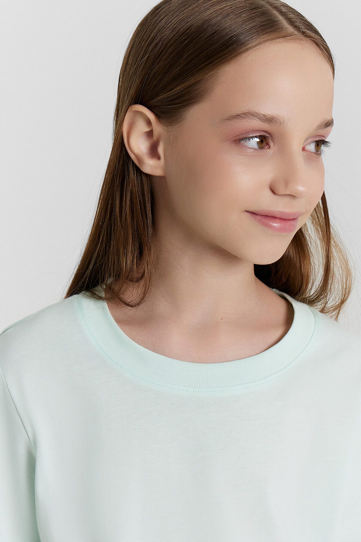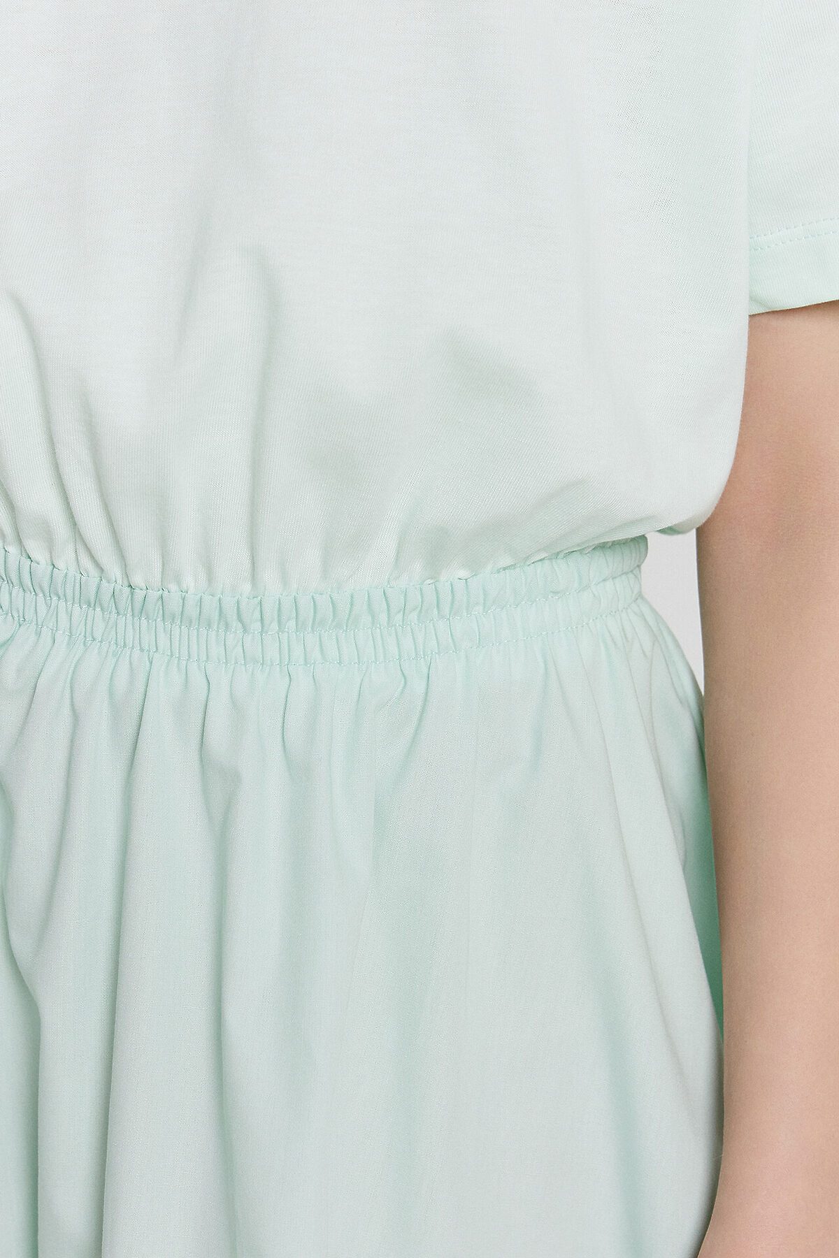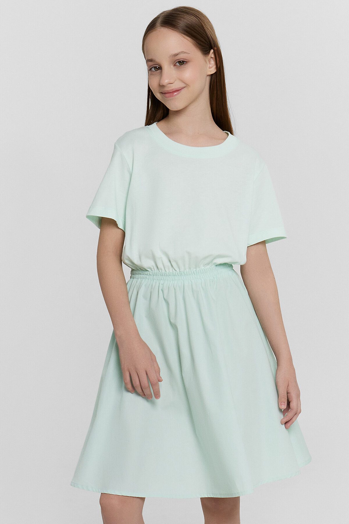 Платье для девочек полуприлегающего силуэта. Верх платья из трикотажного кулирного полотна .Горловина круглая окантована обтачкой из рибаны. Рукав, втачной короткий. Платье отрезное по талии и присборено на резинки 30RV, низ платья из паплина. Длинна ниже колена.