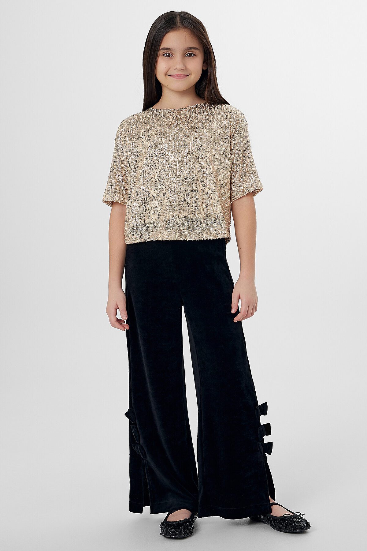 Брюки для девочек, с высокой посадкой, прямого силуэта. Пояс цельнокроеный с эластичной тесьмой внутри 30RV. Боковые швы с разрезами. Внизу, на боковом шве штанины расположено три бантика. Низ в подгибку