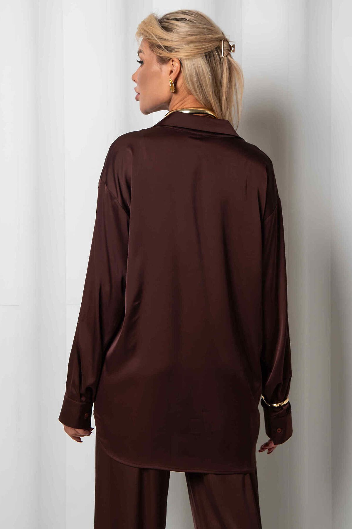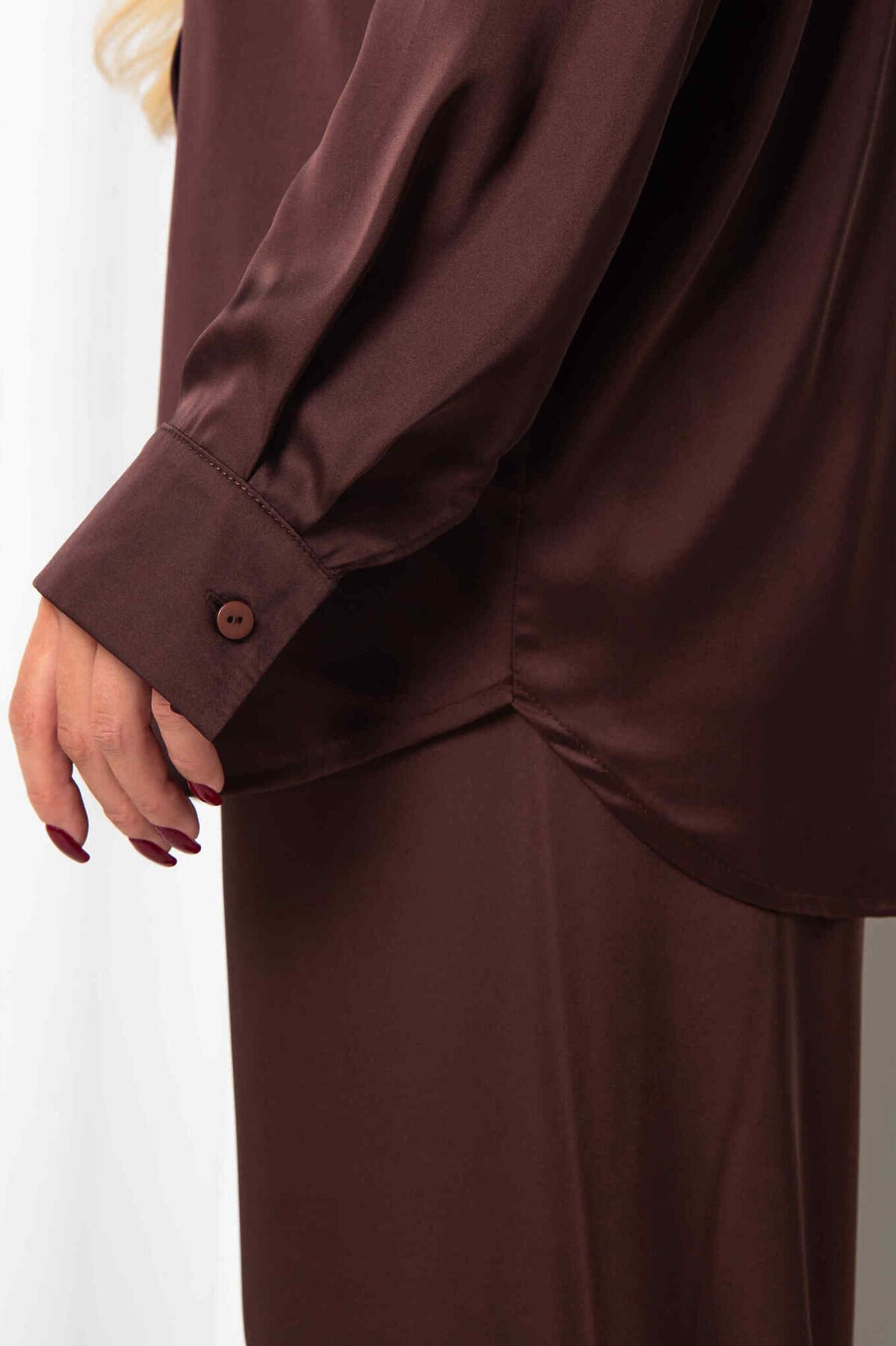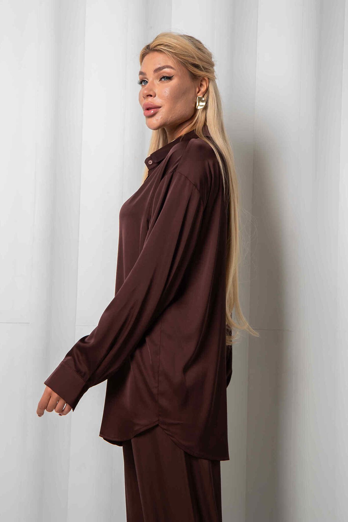 Рубашка из дубайского шелка со спущенной линией плеча, широкими манжетами на пуговицах.Идеально сочетается с юбкой или брюками из нашей коллекции. Выполнена в трех оттенках:- роскошный черный- элегантный бордовый- трендовый горький шоколад