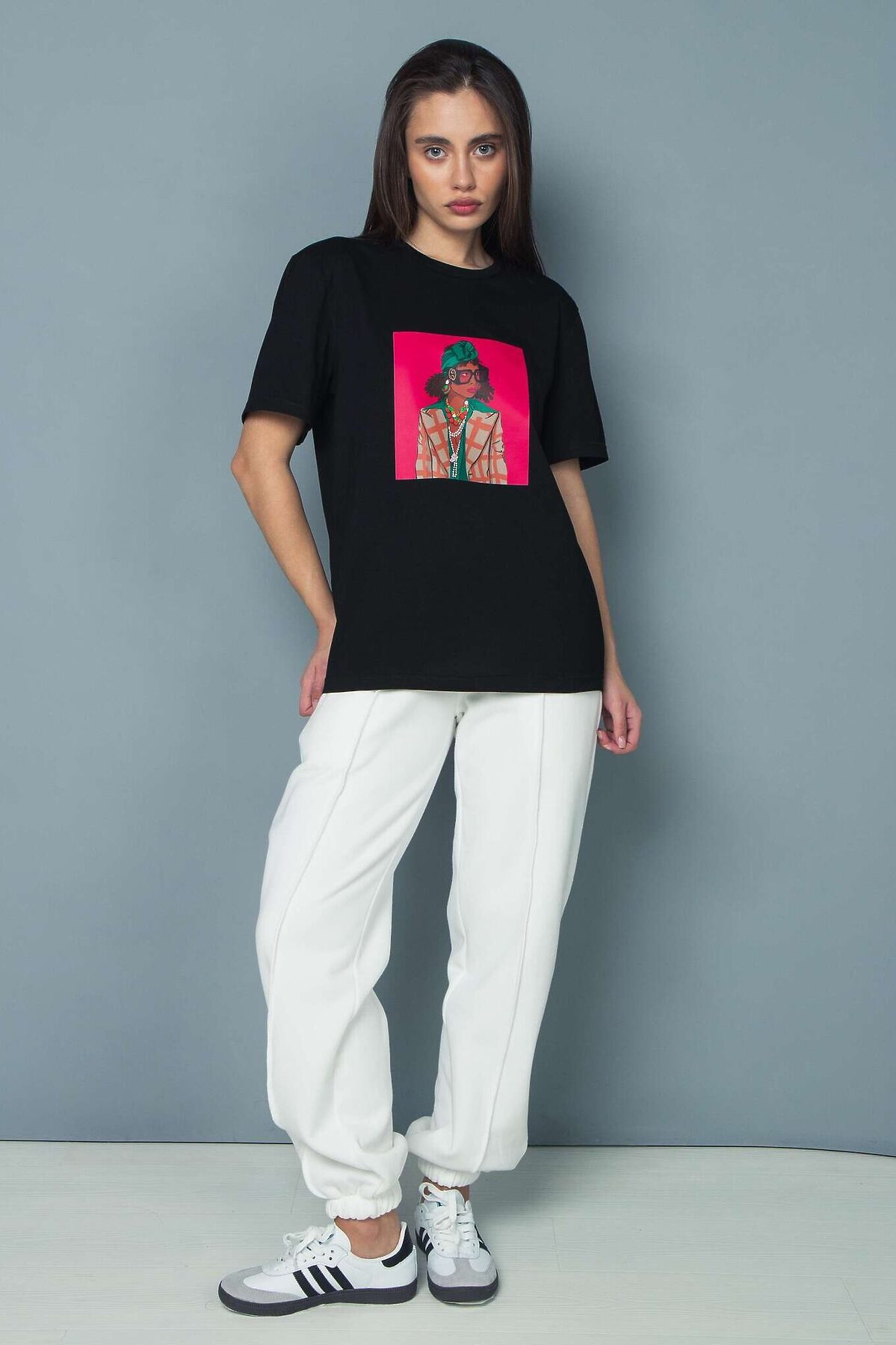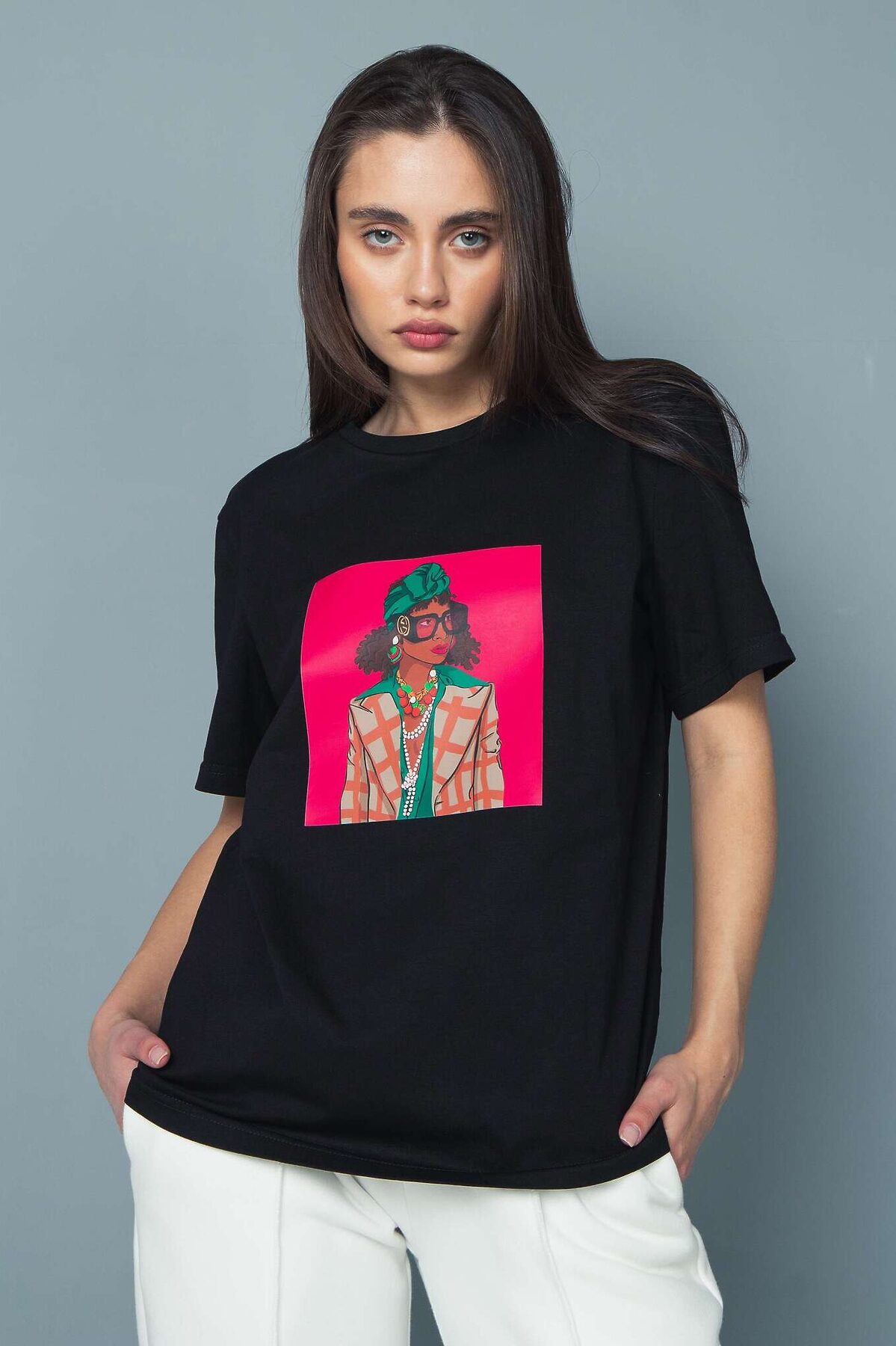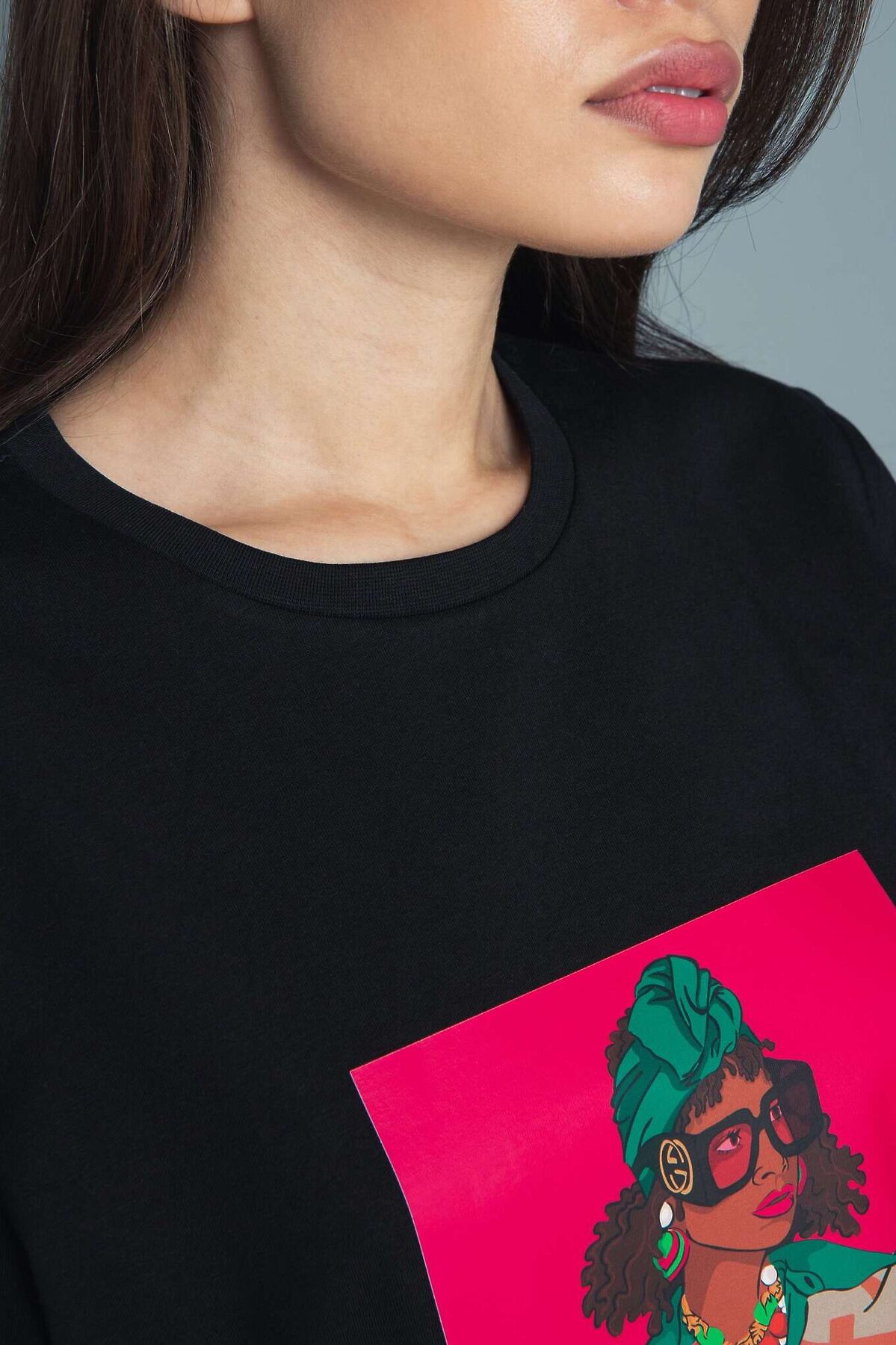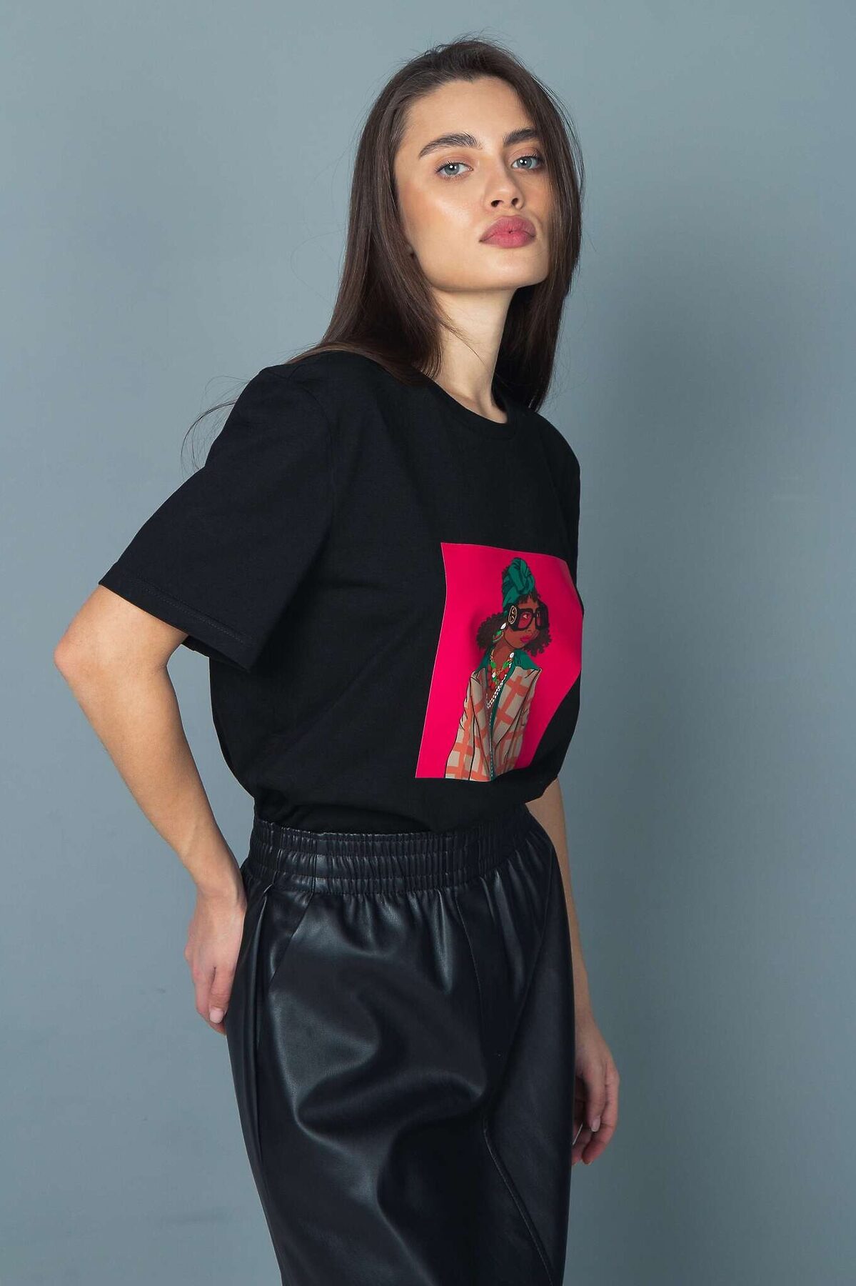 Эта стильная футболка идеально подойдет современным женщинам. Изготовлена из высококачественного материала — кулирной глади (100% хлопка), что обеспечивает комфорт при носке. Модель выполнена в универсальном черном цвете. Эксклюзивный принт нарисованный нашими дизайнерами, придаст вашему образу яркости и индивидуальности. Футболку можно сочетать как с джинсами, так и с юбкой, создавая модные городские луки. Отличный выбор для тех, кто ценит качество, стиль и удобство!
