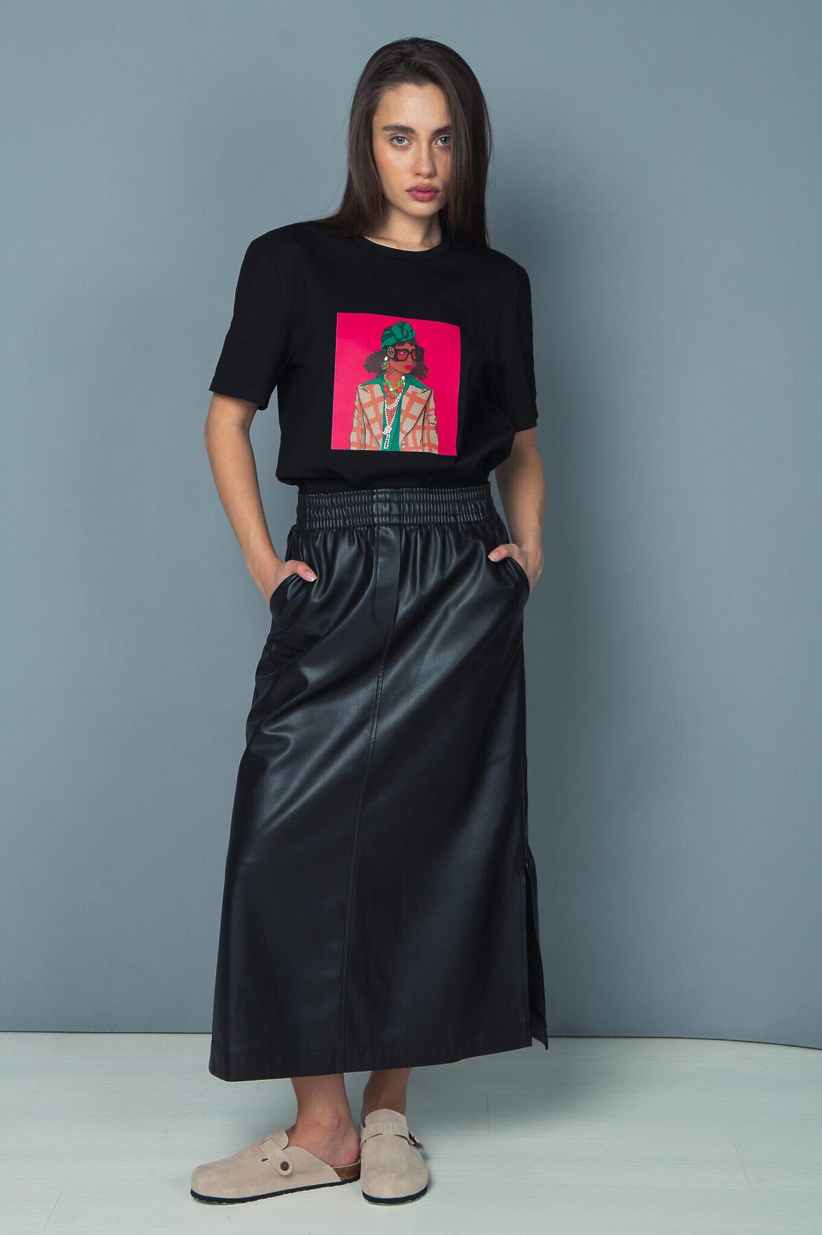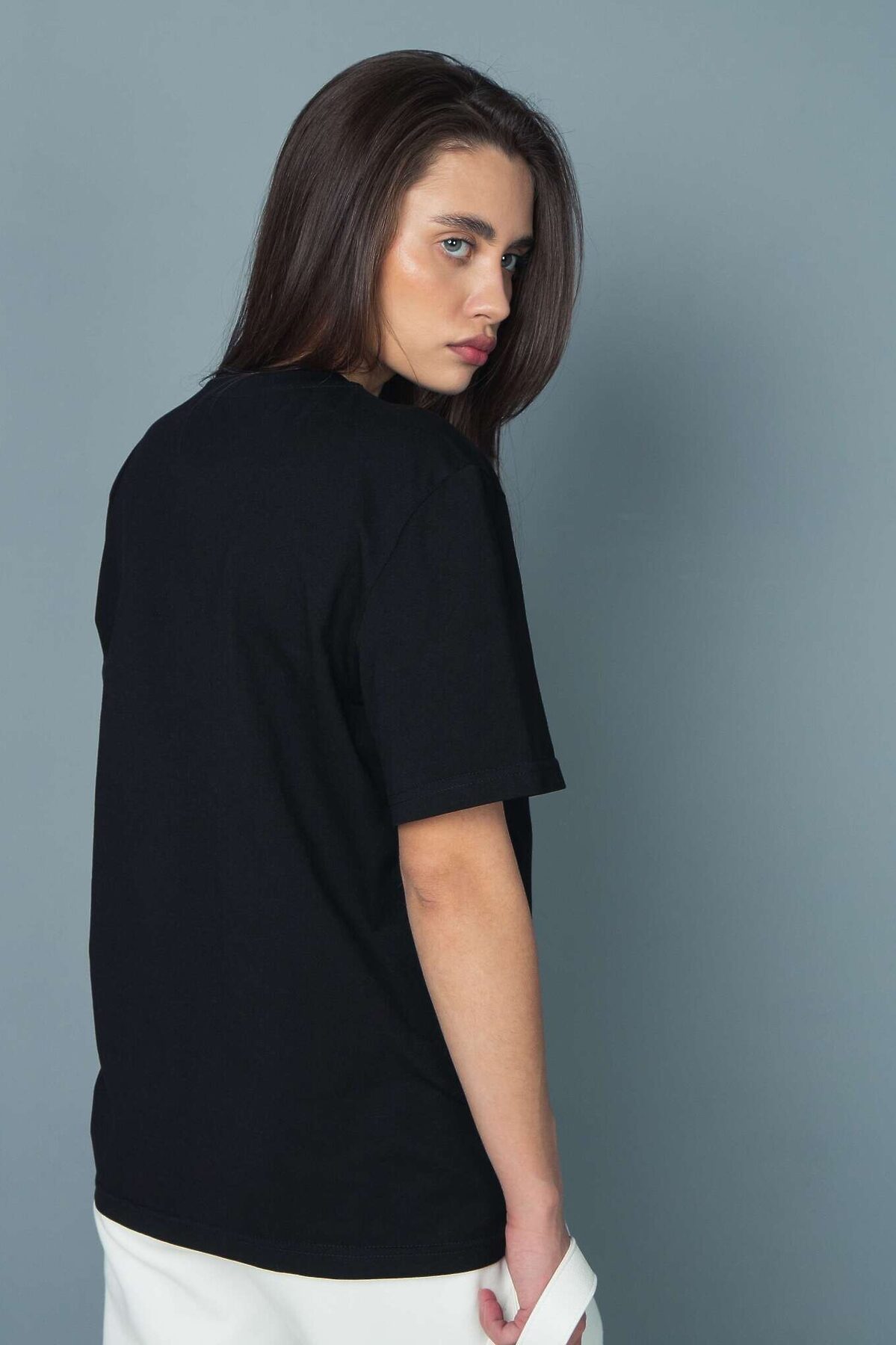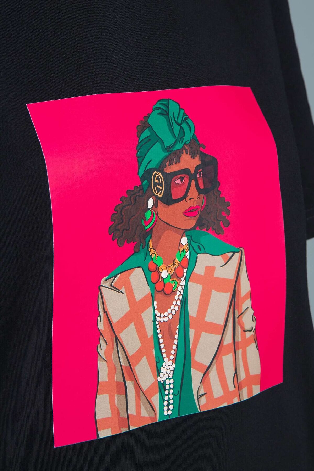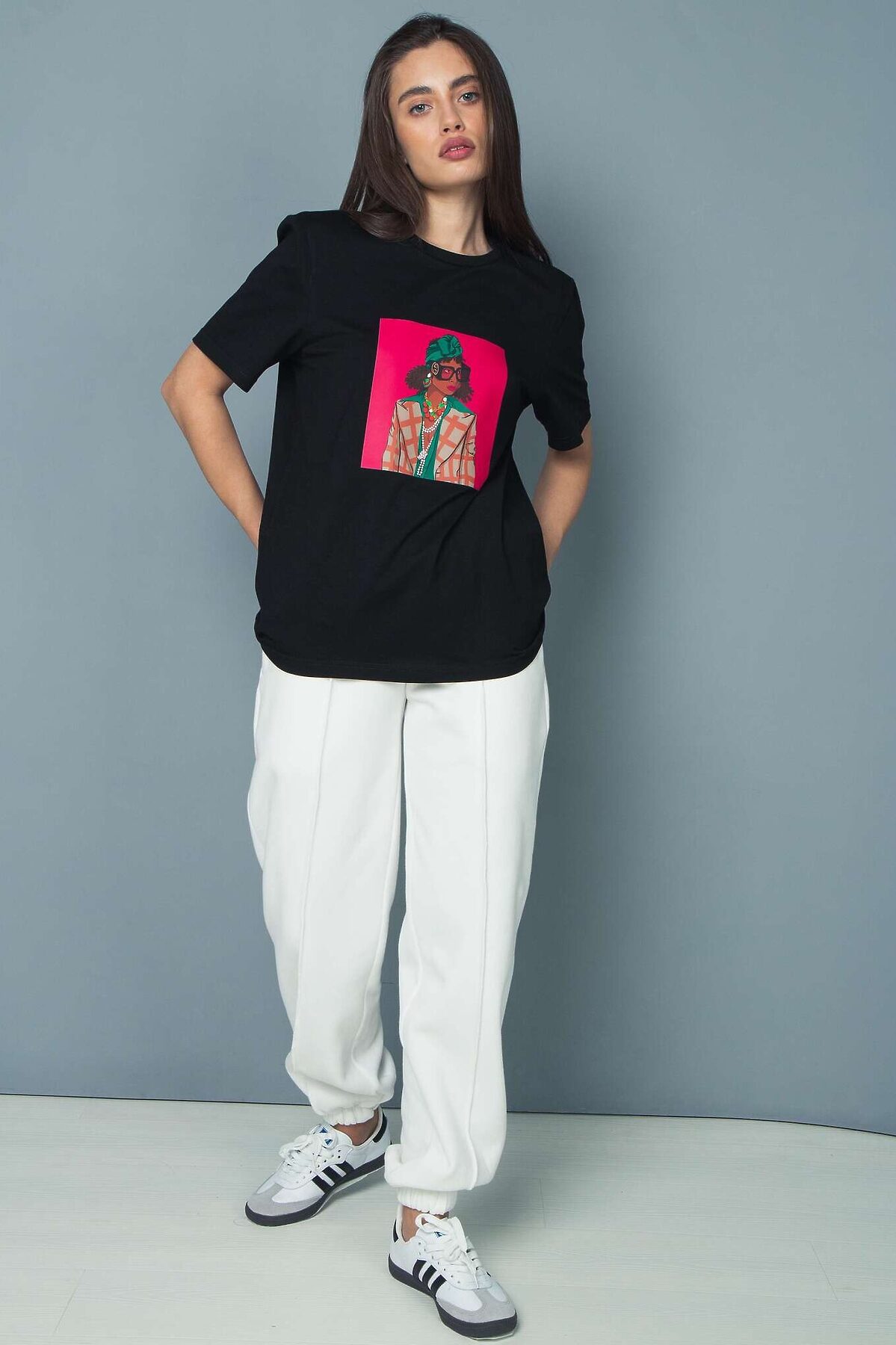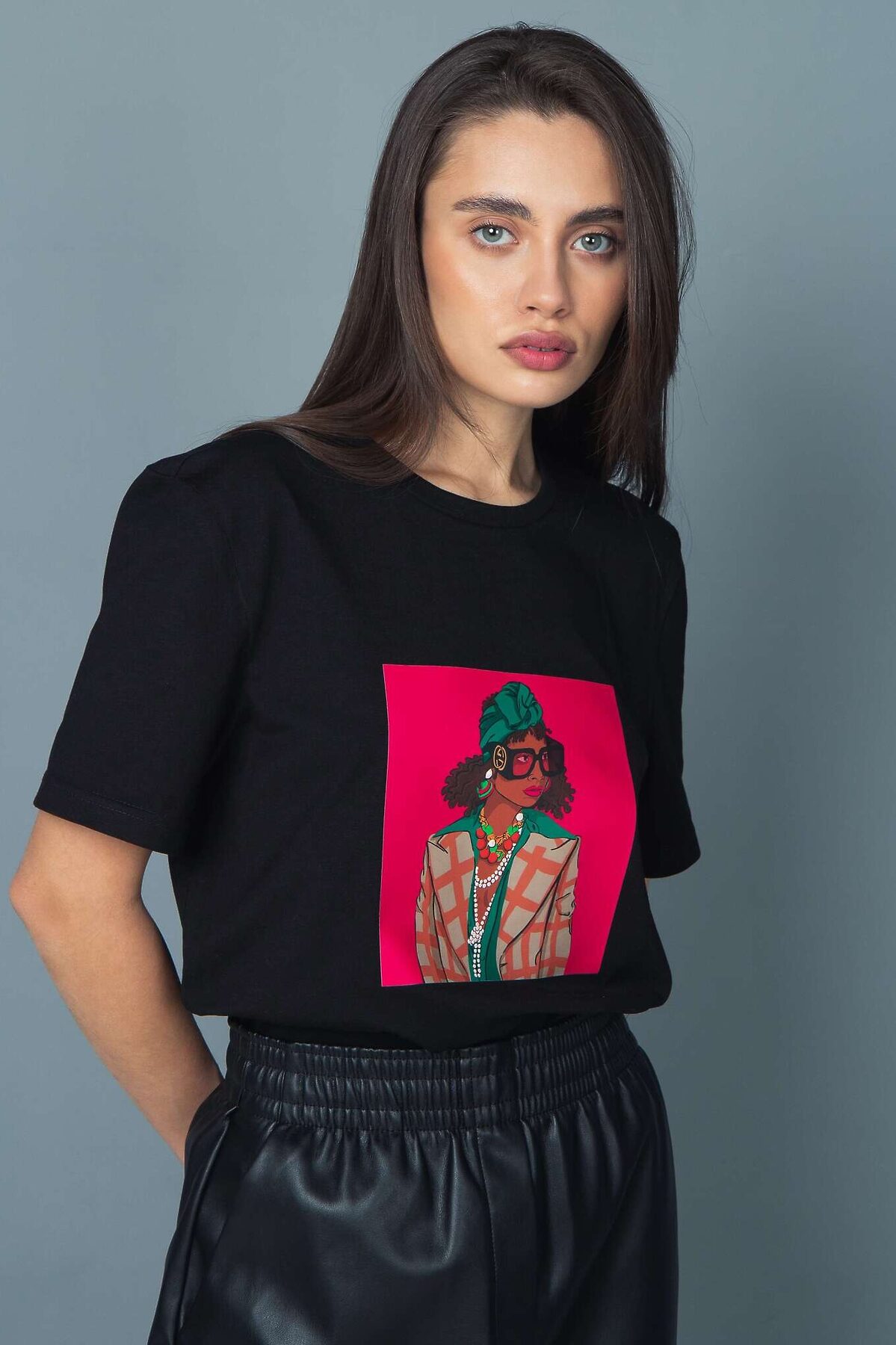 Эта стильная футболка идеально подойдет современным женщинам. Изготовлена из высококачественного материала — кулирной глади (100% хлопка), что обеспечивает комфорт при носке. Модель выполнена в универсальном черном цвете. Эксклюзивный принт нарисованный нашими дизайнерами, придаст вашему образу яркости и индивидуальности. Футболку можно сочетать как с джинсами, так и с юбкой, создавая модные городские луки. Отличный выбор для тех, кто ценит качество, стиль и удобство!