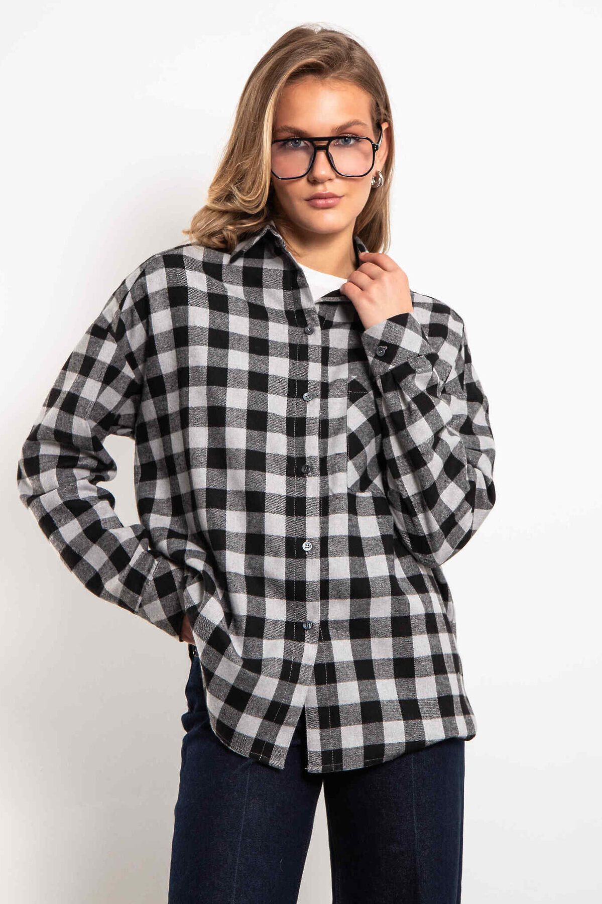 Универсальная клетчатая рубашка oversize с нагрудным карманом. Застегивается на пуговицы. Выполнена из фланели с добавлением хлопка.