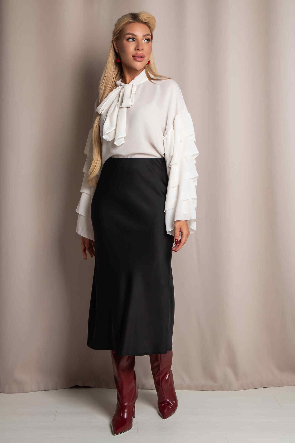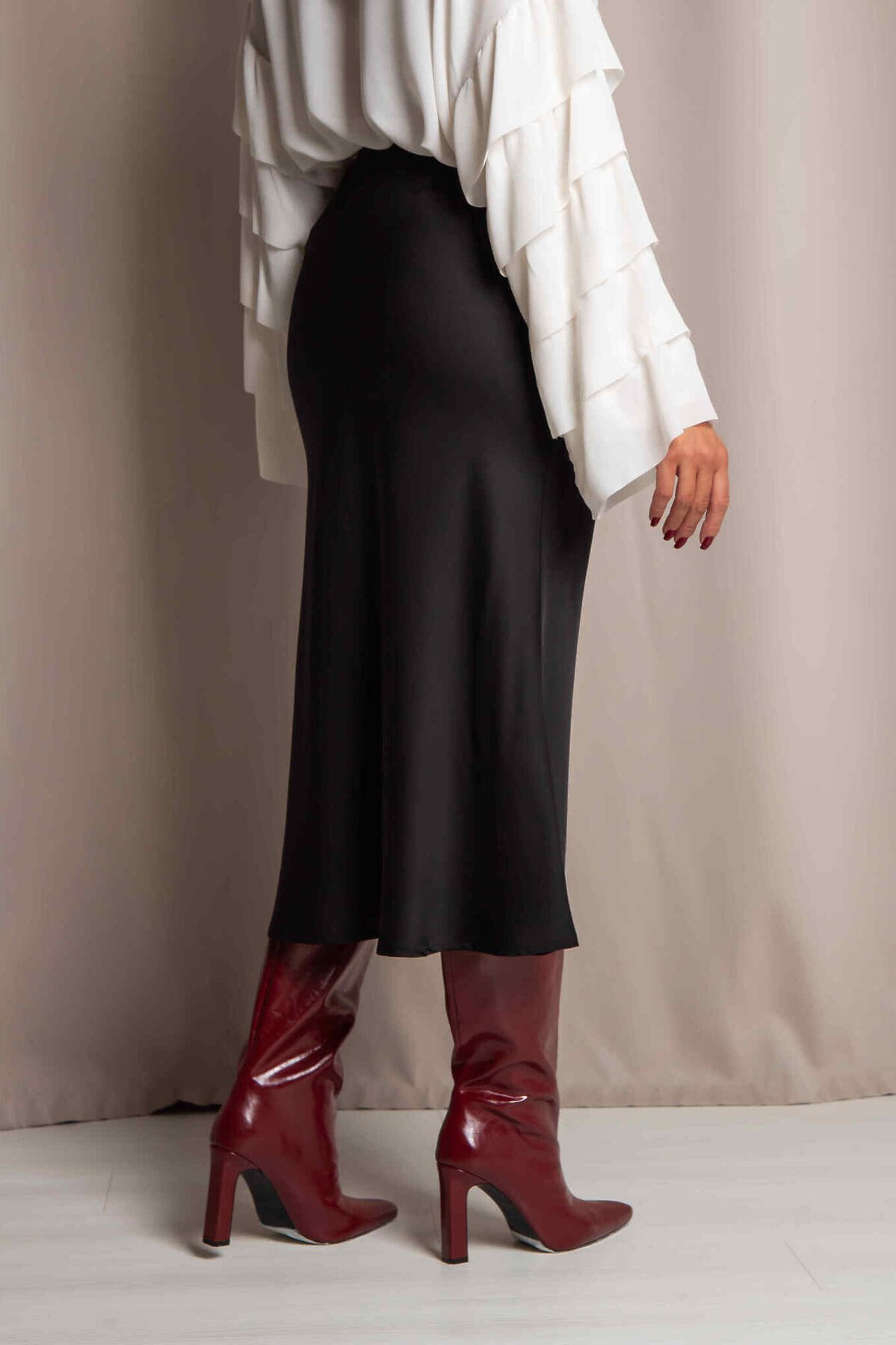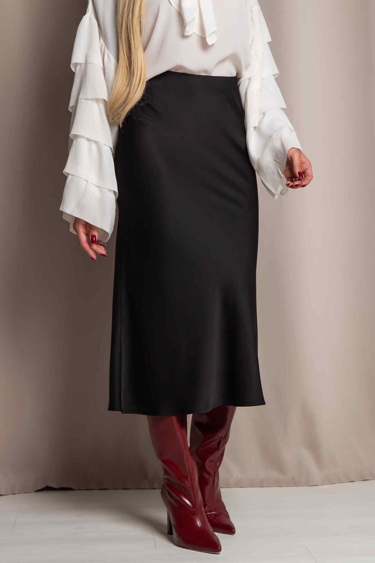 Юбка миди А- силуэта из дубайского шелка с потайным эластичным поясом, легким глянцевым блеском. Юбка хороша в комплектах разного стиля и украшает любой тип фигуры.