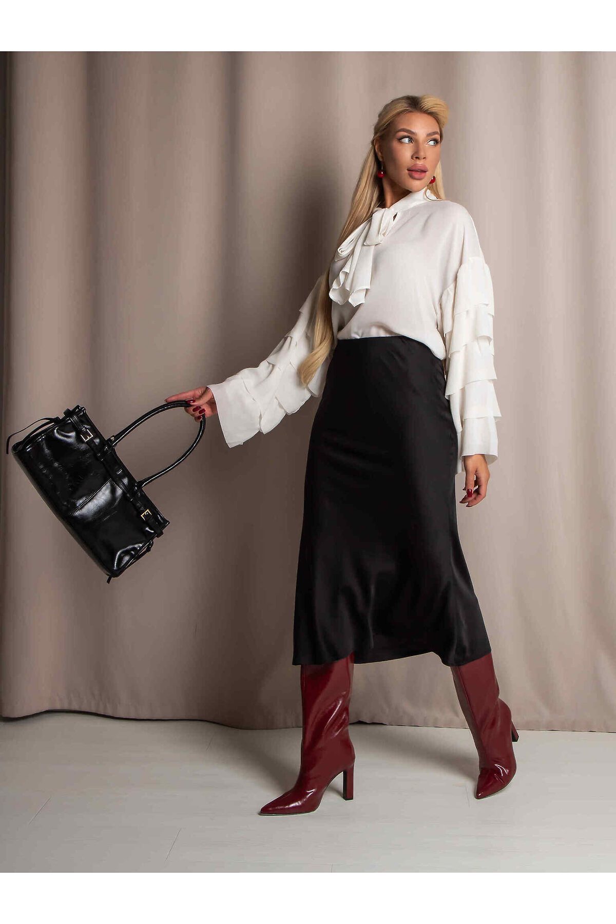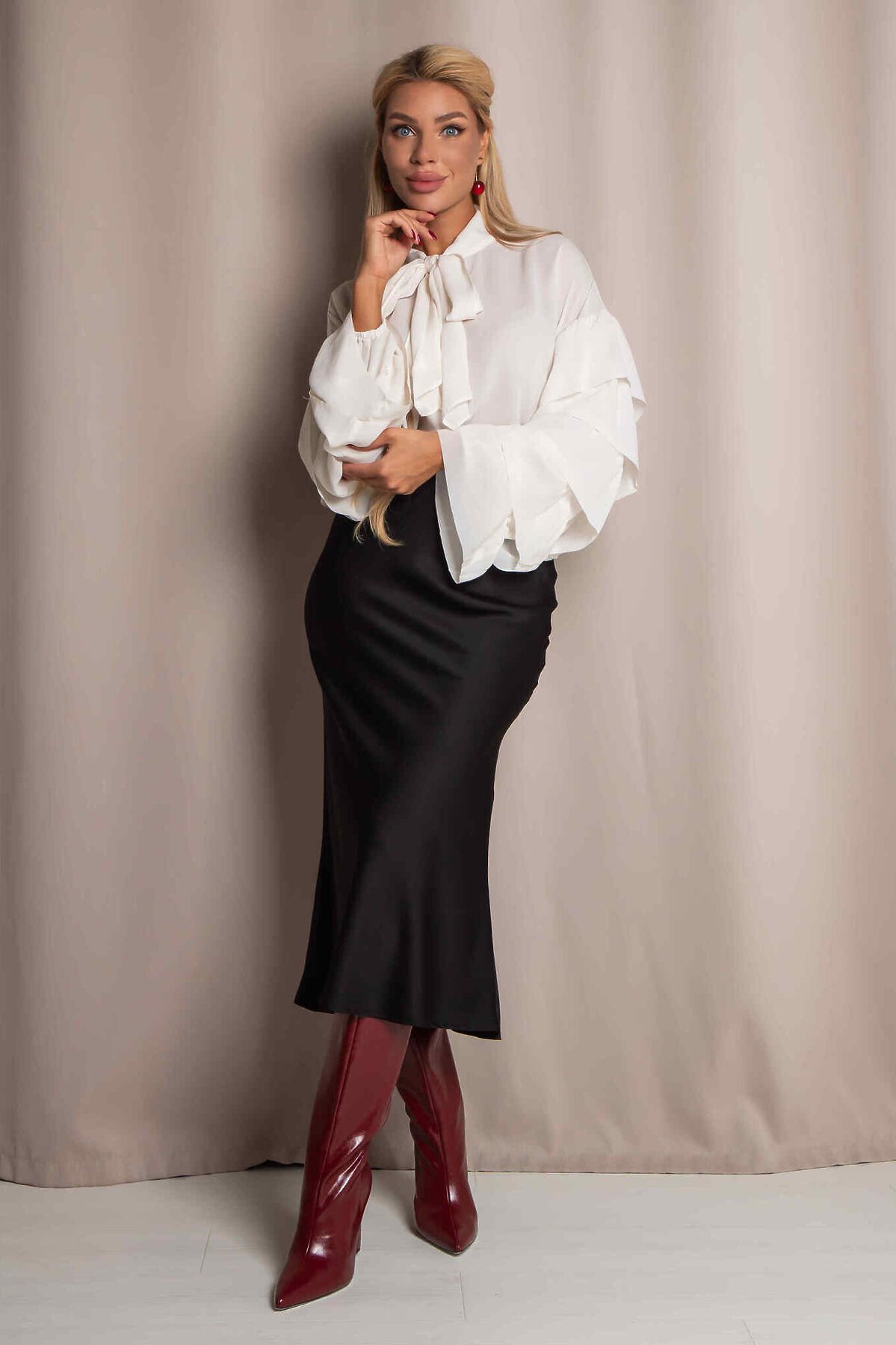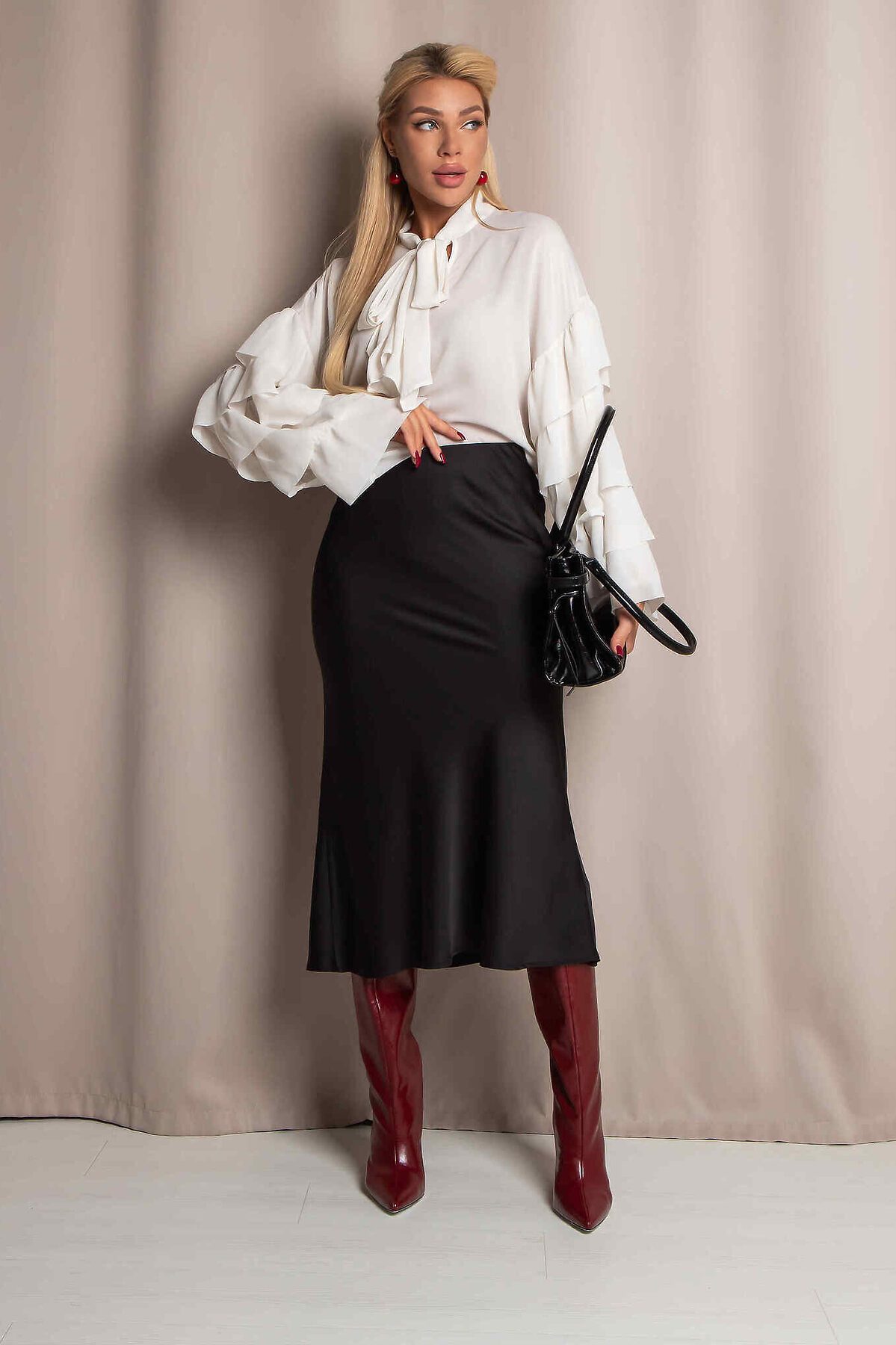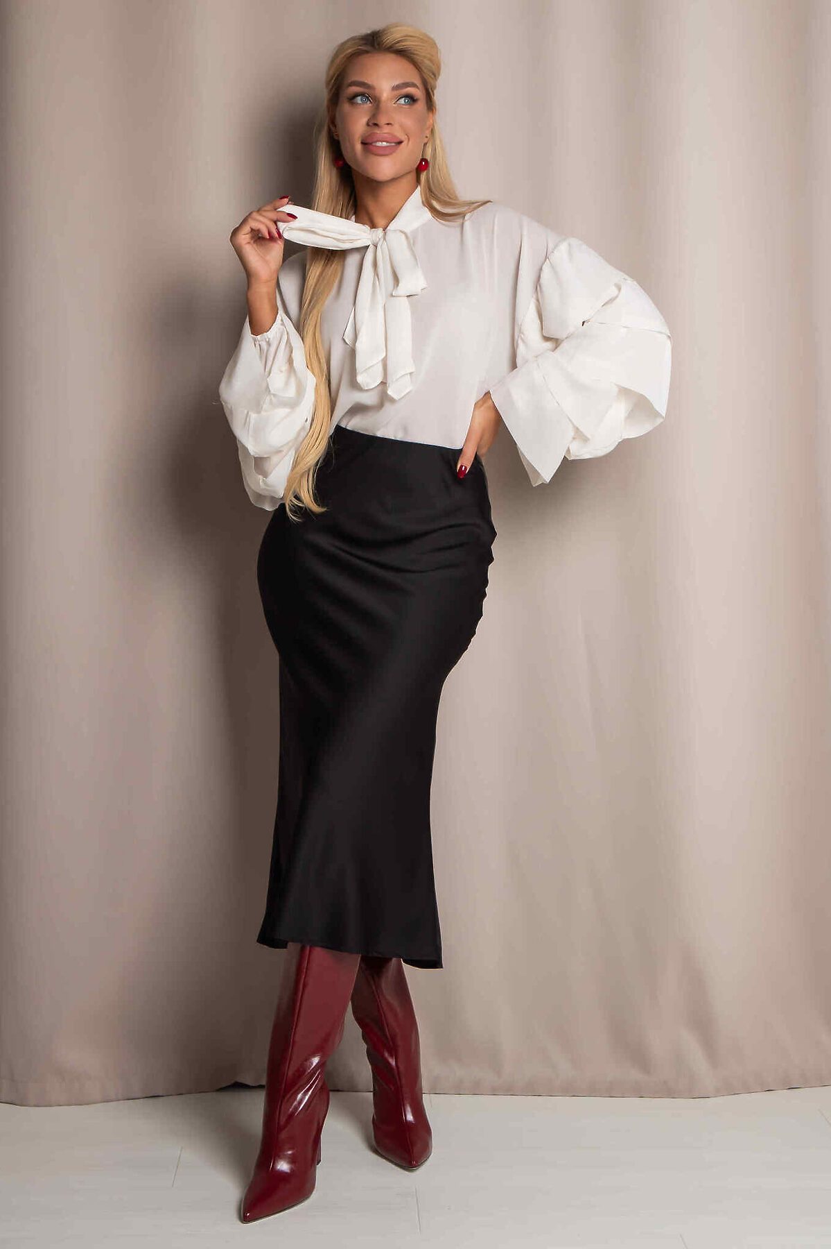 Юбка миди А- силуэта из дубайского шелка с потайным эластичным поясом, легким глянцевым блеском. Юбка хороша в комплектах разного стиля и украшает любой тип фигуры.
