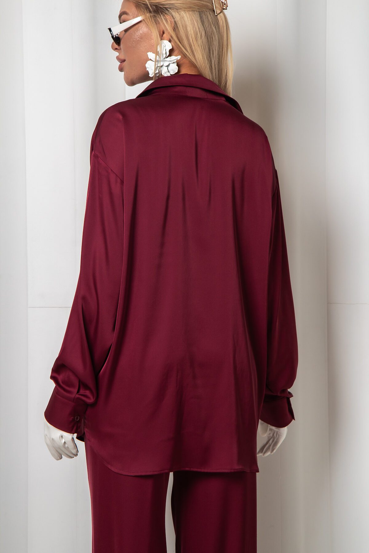 Рубашка из дубайского шелка со спущенной линией плеча, широкими манжетами на пуговицах.Идеально сочетается с юбкой или брюками из нашей коллекции.