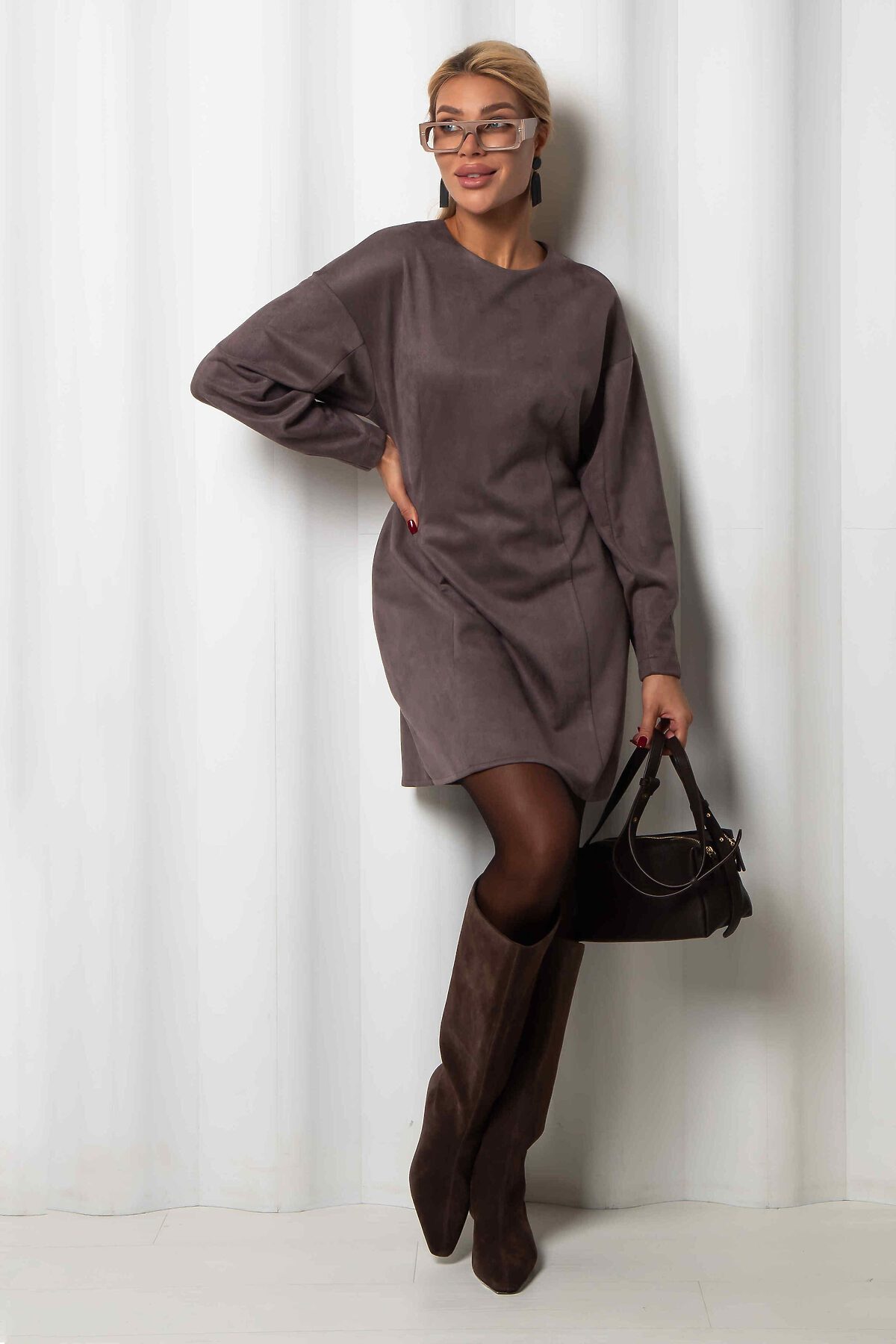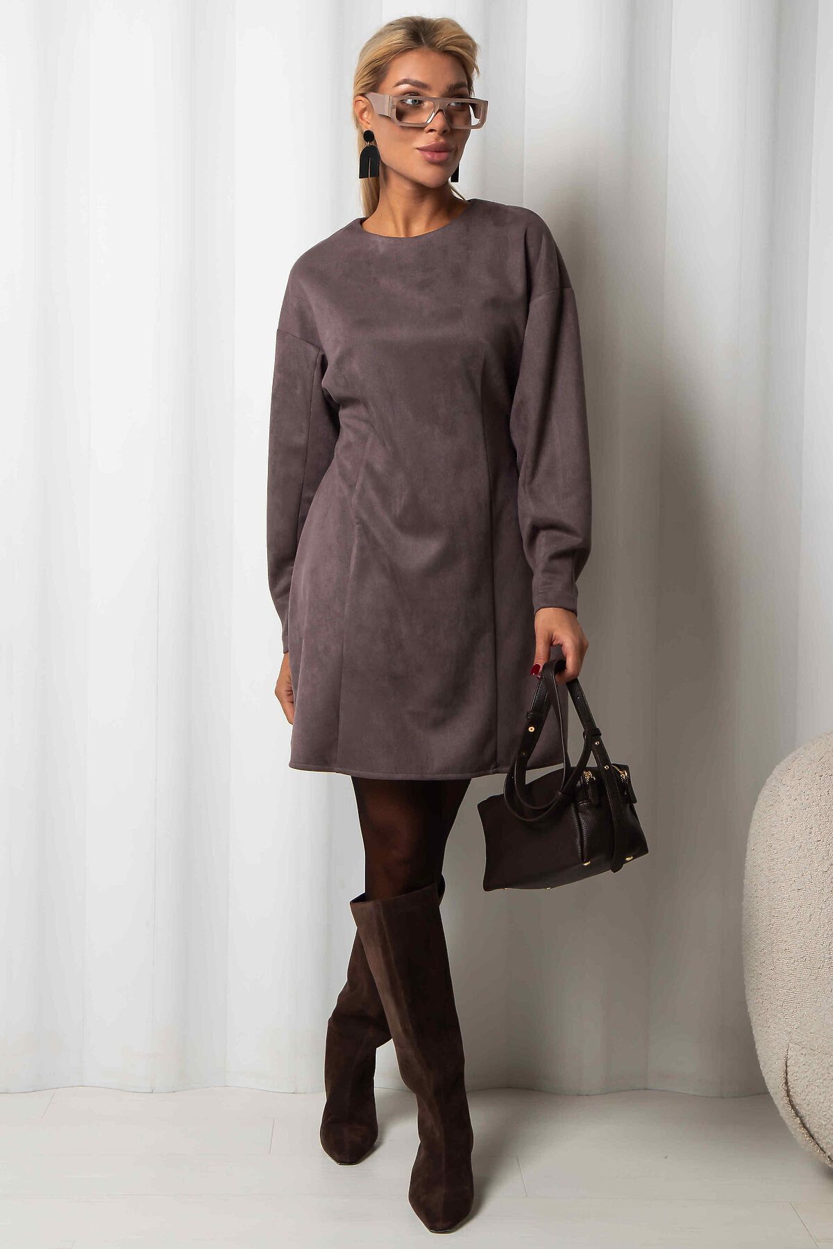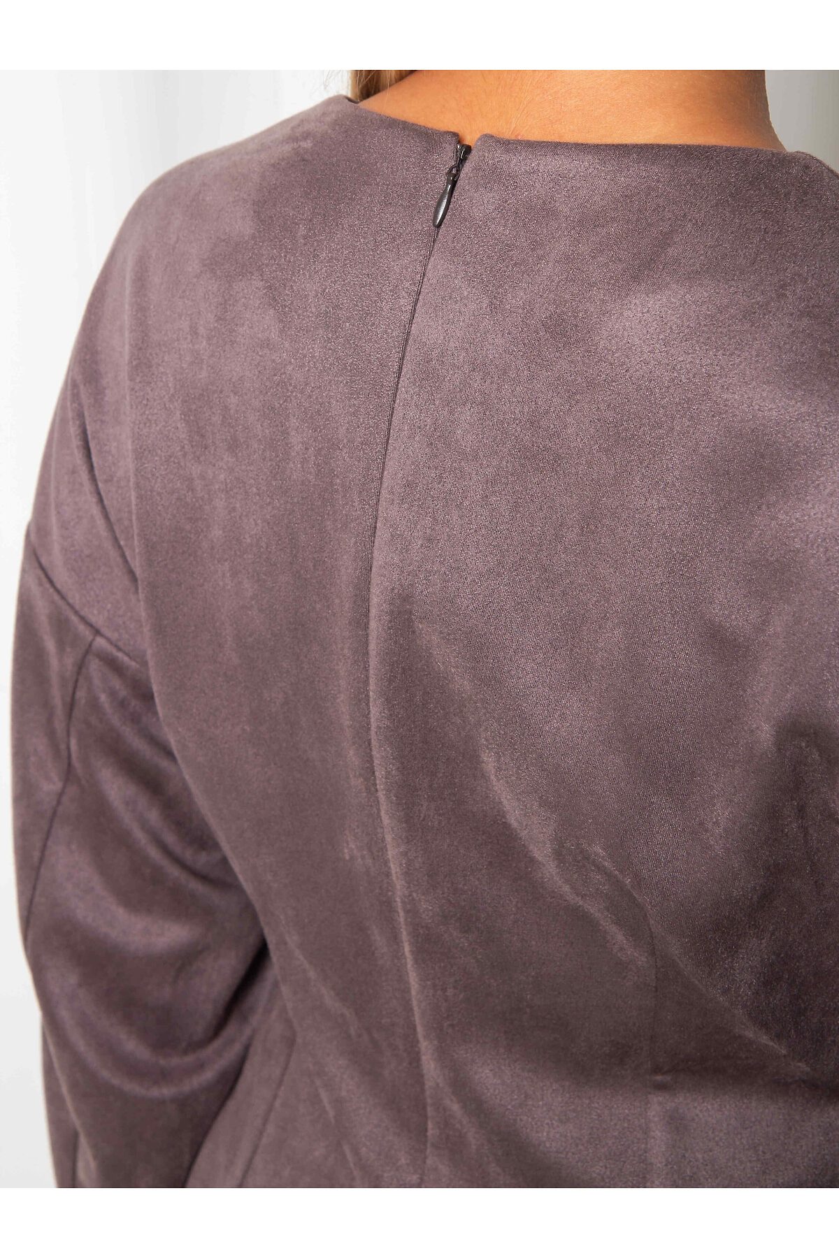 Платье силуэта тюльпан - это олицетворение утонченности и изысканности, воплощенное в минималистичном дизайне. Изготовленное из эко замши на основе трикотажа, оно нежно окутывает фигуру, подчеркивая женственность и грацию.