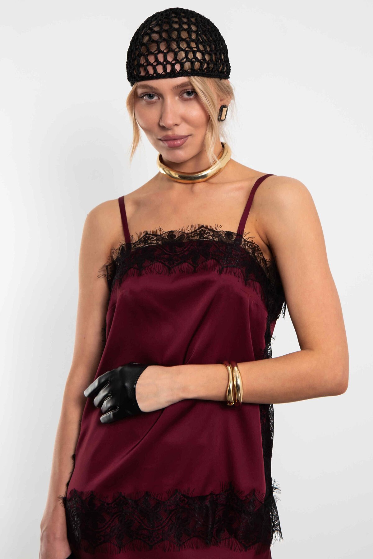 Топ в бельевом стиле на тонких бретелях с кружевом, сшит из дубайского шелка в паре с французским кружевом. Топ акцентирует внимание на комфорте и легкости. Дубайский шелк создает ощущение нежности и романтики. Бельевой стиль можно сочетать с другими направлениями моды, например, с уличным стилем или классикой. Например, топ можно носить под пиджаком с джинсами и грубой обувью.