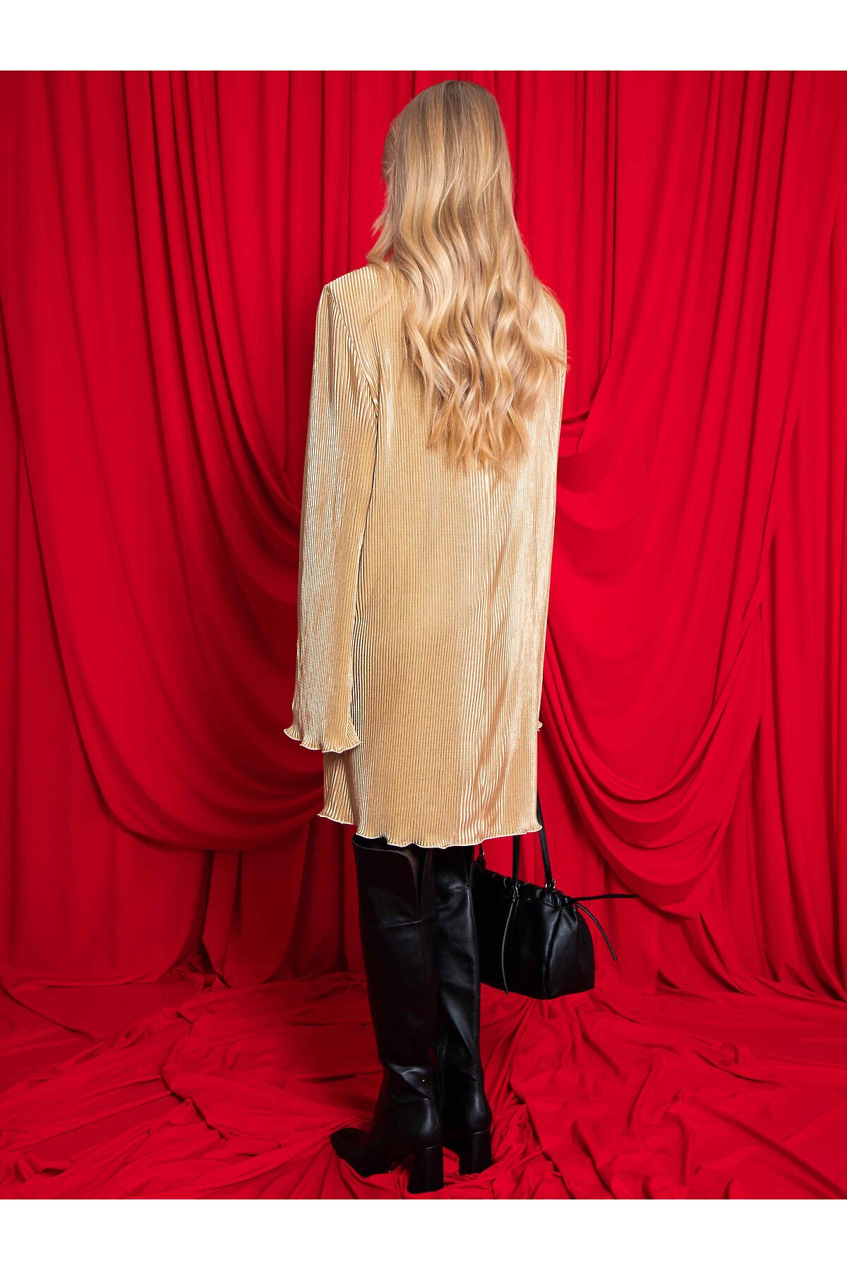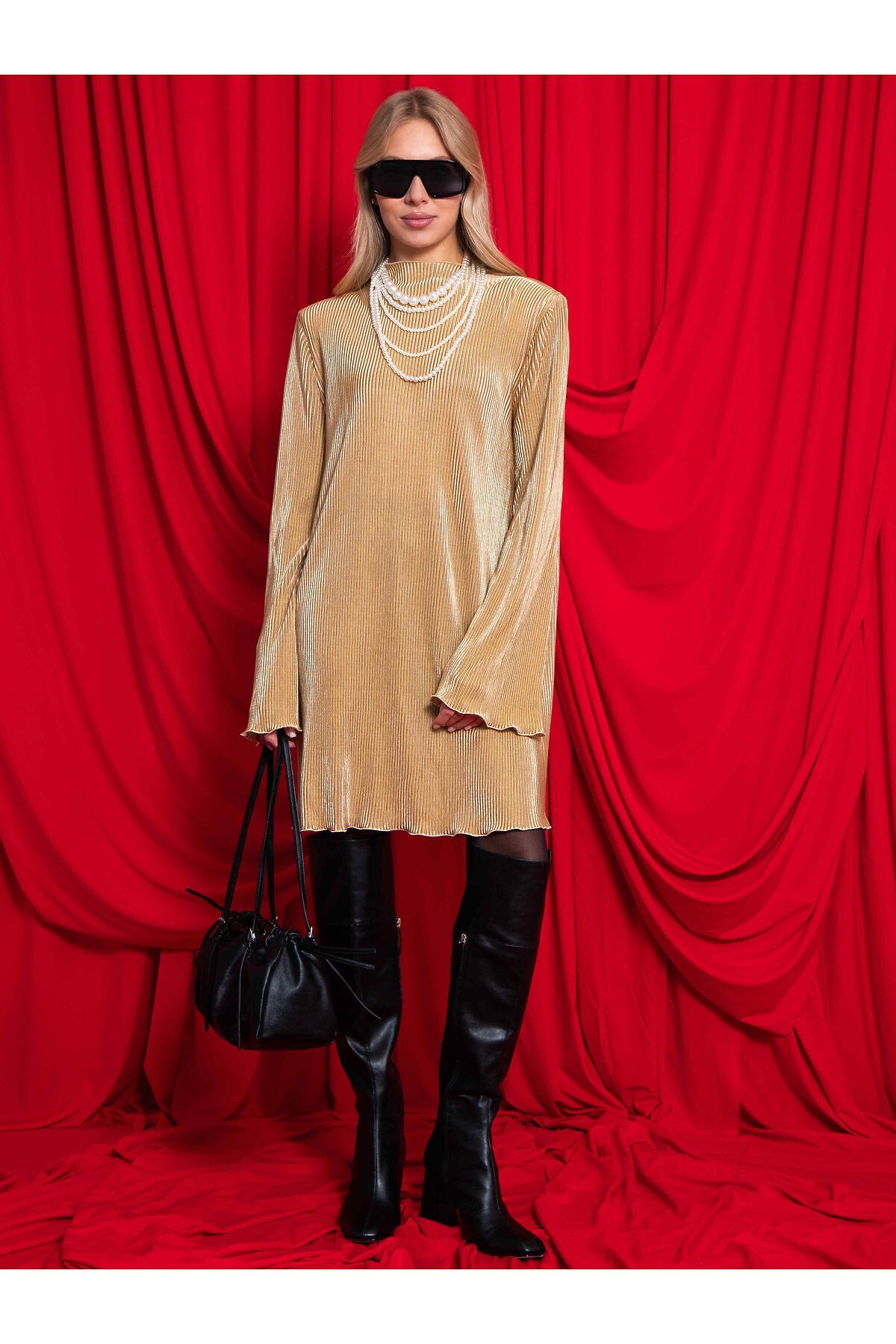 Платье свободного силуэта и гофрированного плательного трикотажа. Модель имеет длинный втачной рукав. Надевайте ремень по верх платья и будьте в духе Burberry.