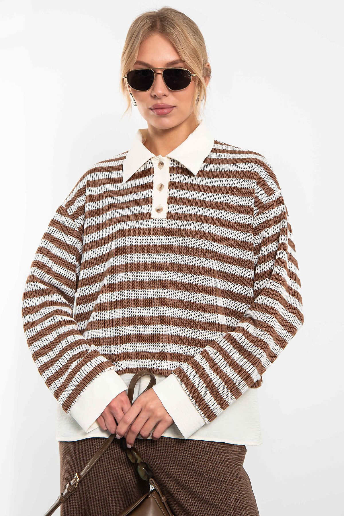 Удлиненный женский свитшот свободного кроя из мягкой вязанной ткани. Отложной рубашечный воротничок с V-образным вырезом на пуговицах. Длинные свободные рукава с широкими манжетами имитация, спущенная линия плеча.