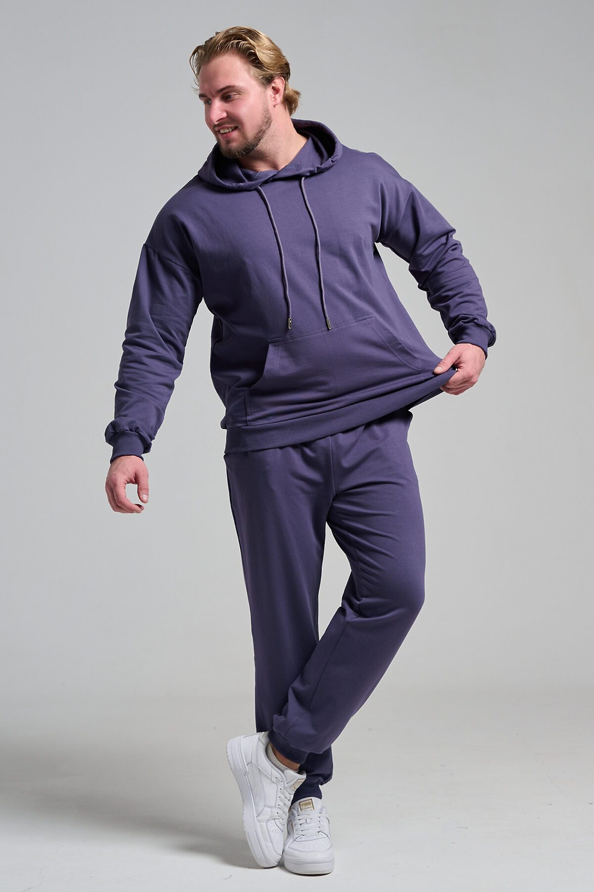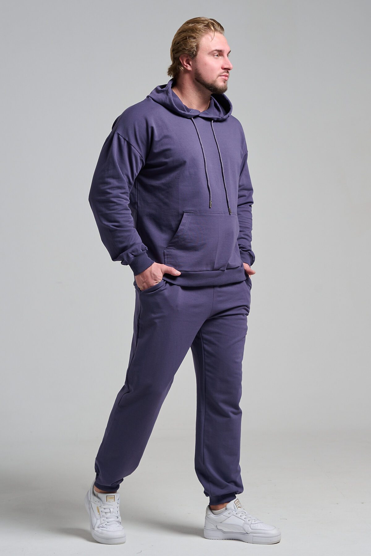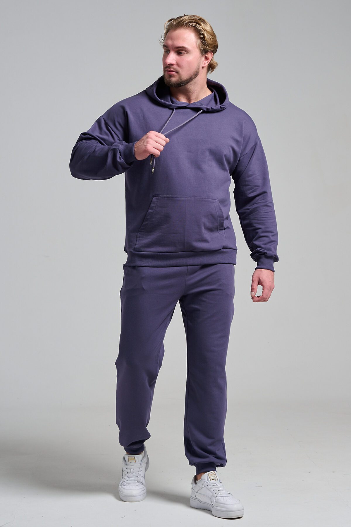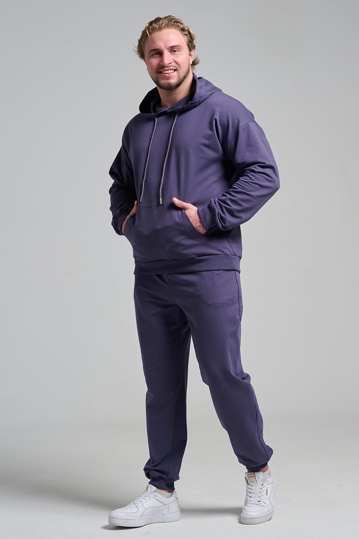 Костюм спортивный мужской с худи и джоггерами. Костюм свободного кроя состоит из толстовки с капюшоном и карманом кенгуру и брюк джоггеров на манжете с карманами в боковых швах. Костюм однотонный сшит из качественного хлопкового трикотажного материала - футера 2-х нитки. Обладает отличной эластичностью, не сковывает движений. Идеален для занятий спортом. Зимой костюм возможно носить в тренажерный зал или использовать как домашнюю одежду.
