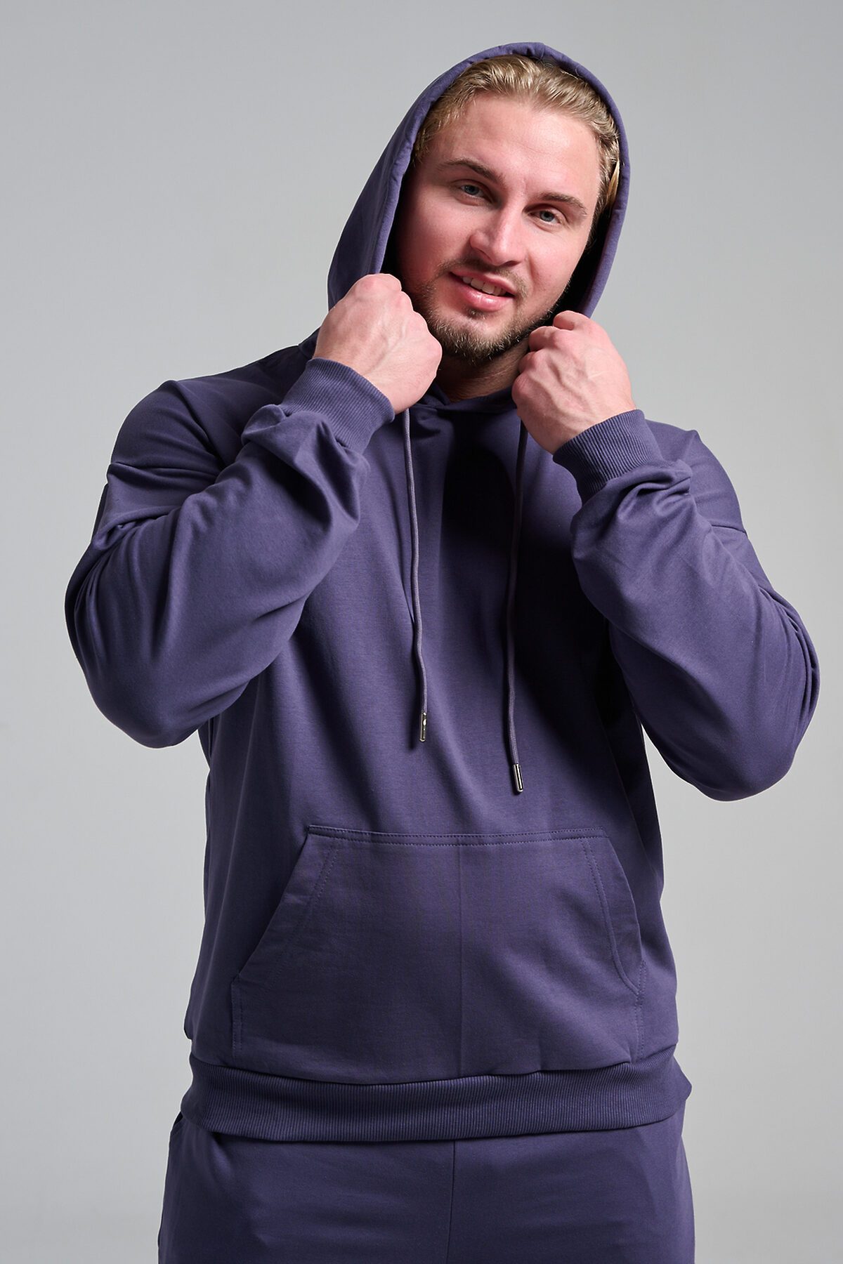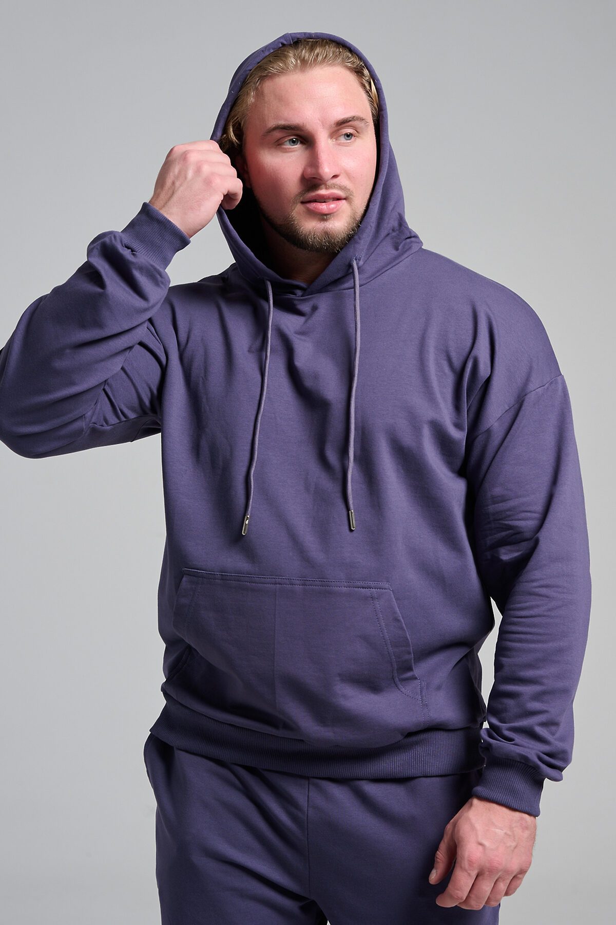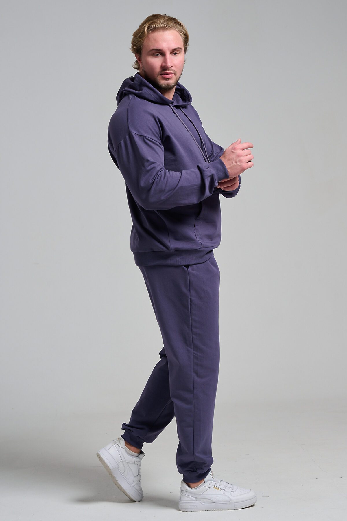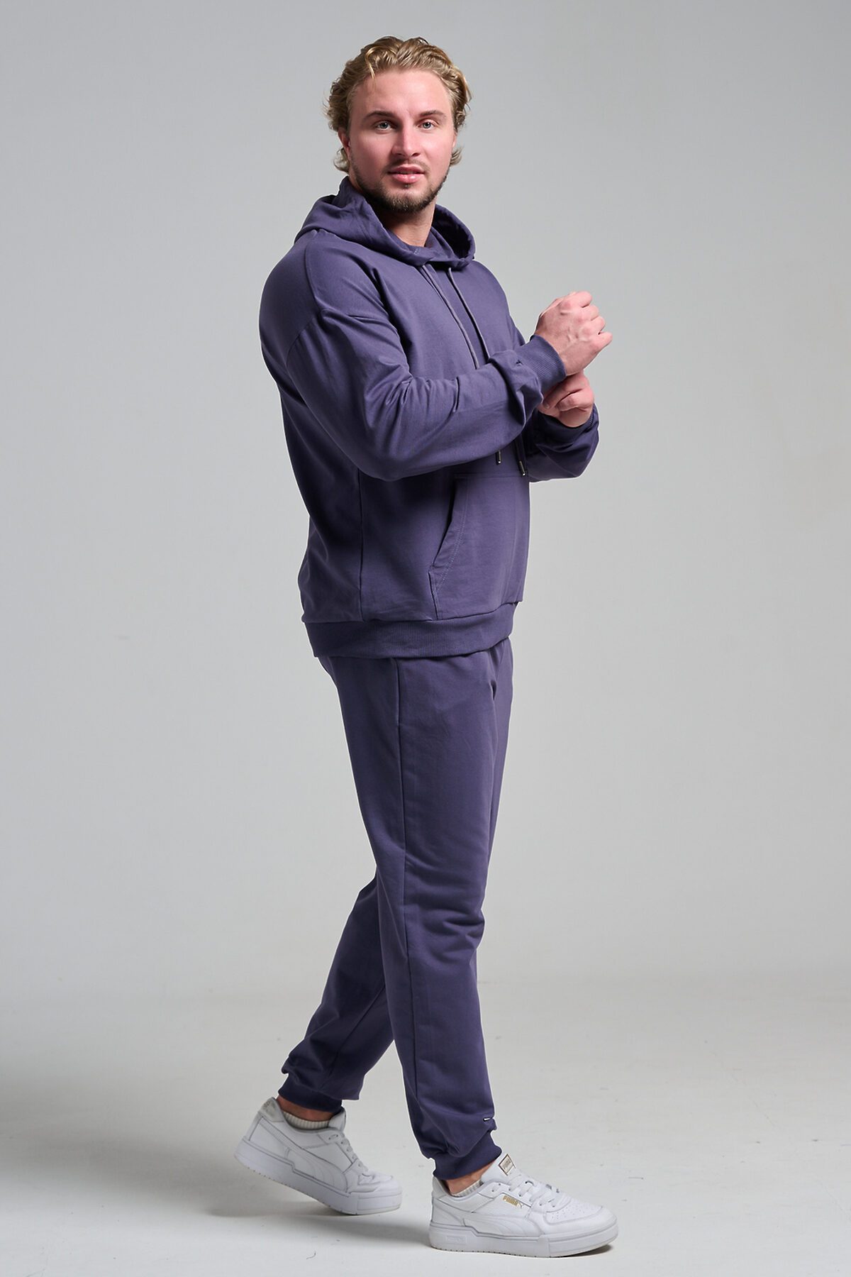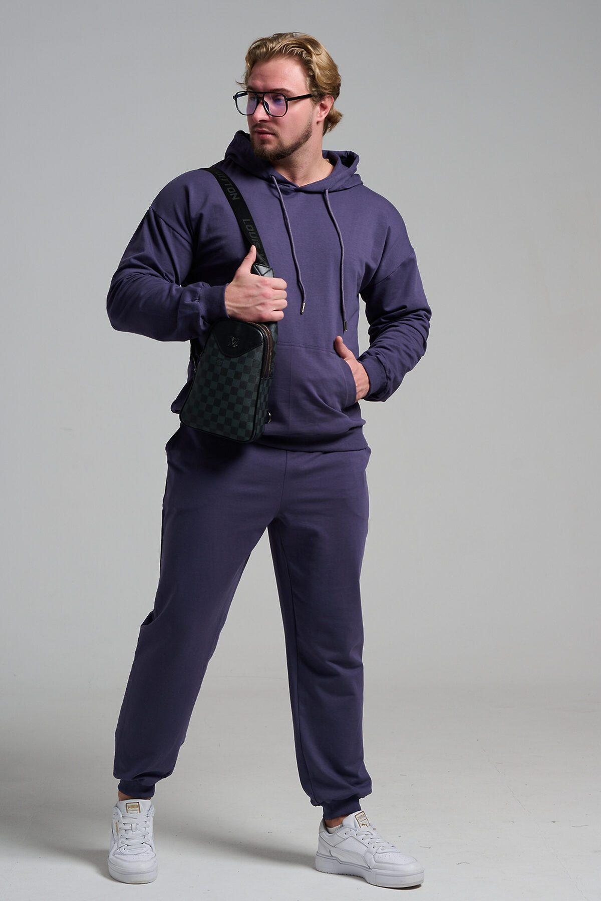 Костюм спортивный мужской с худи и джоггерами. Костюм свободного кроя состоит из толстовки с капюшоном и карманом кенгуру и брюк джоггеров на манжете с карманами в боковых швах. Костюм однотонный сшит из качественного хлопкового трикотажного материала - футера 2-х нитки. Обладает отличной эластичностью, не сковывает движений. Идеален для занятий спортом. Зимой костюм возможно носить в тренажерный зал или использовать как домашнюю одежду.