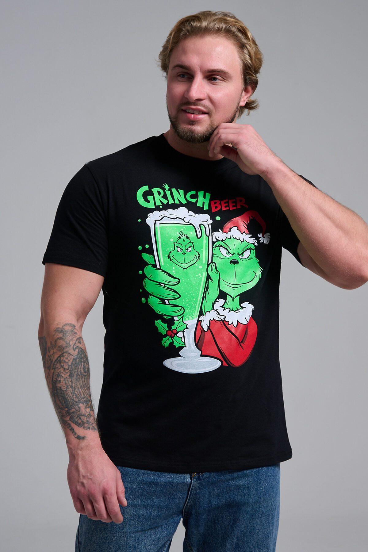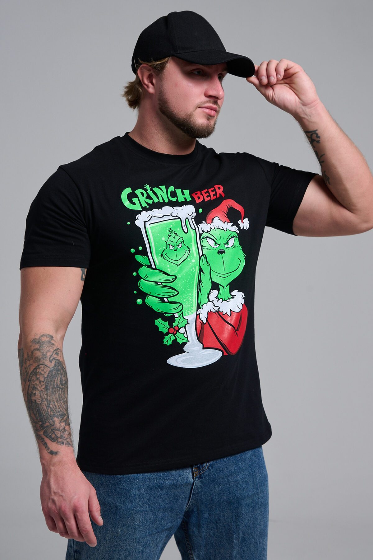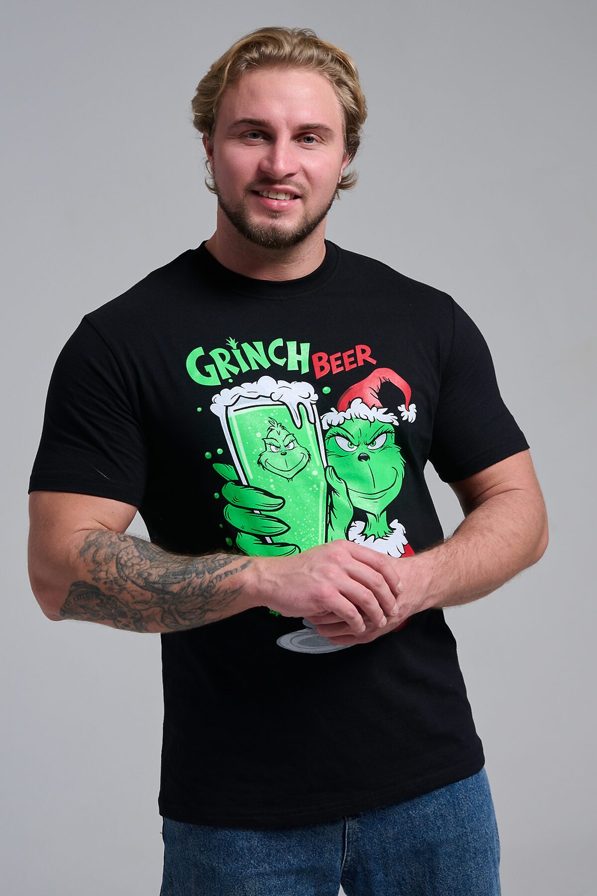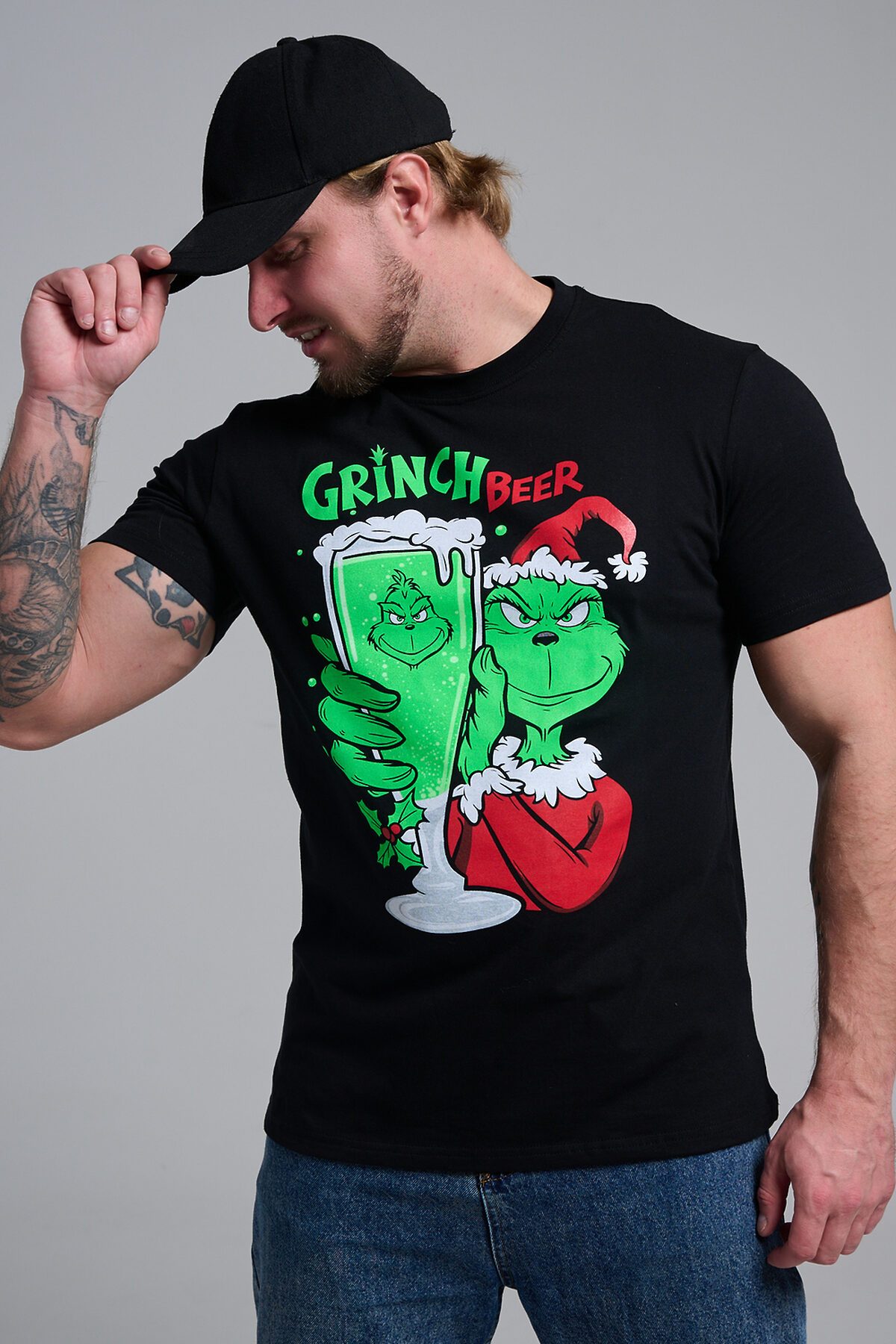 Чёрная хлопковая футболка с забавным принтом: Гринч в красной шапке держит большой бокал пива с пеной! Надпись Grinch Beer сверху, яркий зелёно-красный дизайн для новогоднего юмора. Мягкий 100% хлопок, унисекс, размеры 46-64. Идеально для вечеринок, баров или casual-носки. Добавит иронии фанатам Гринча!