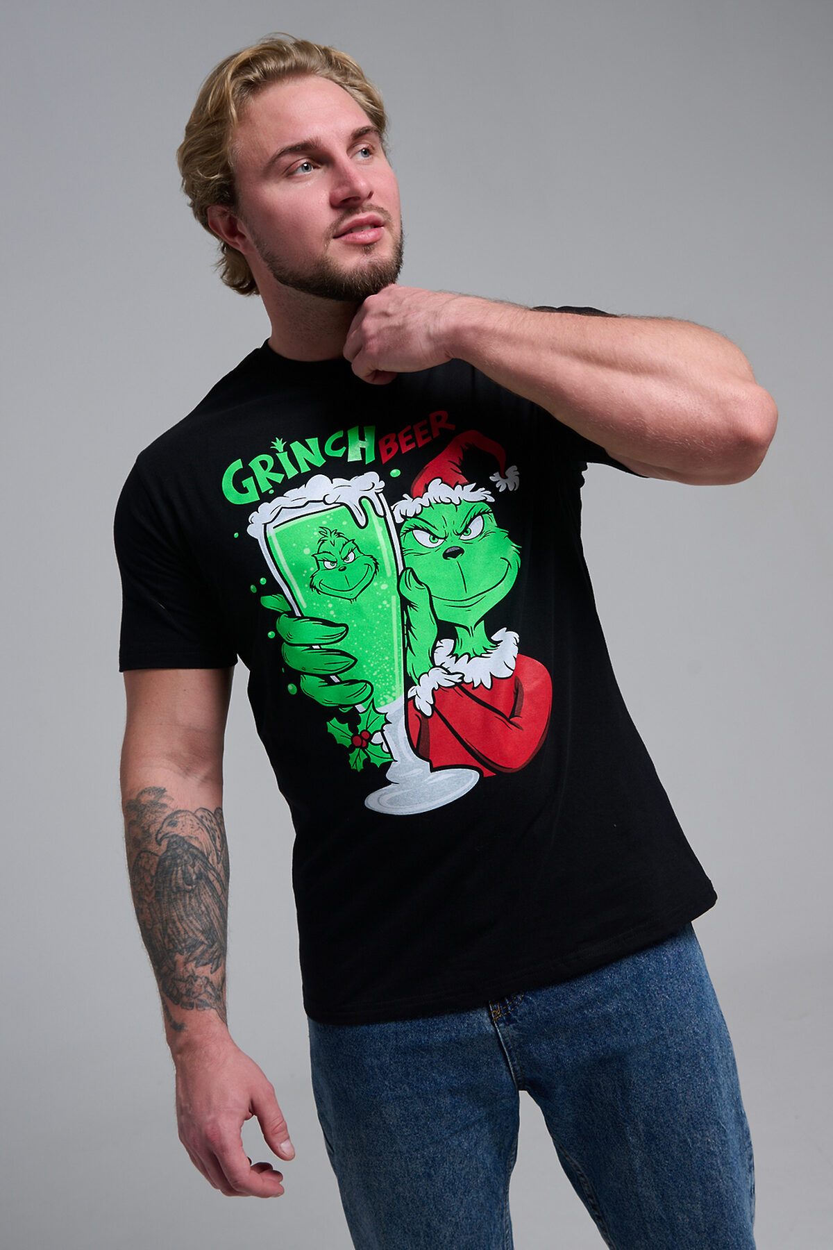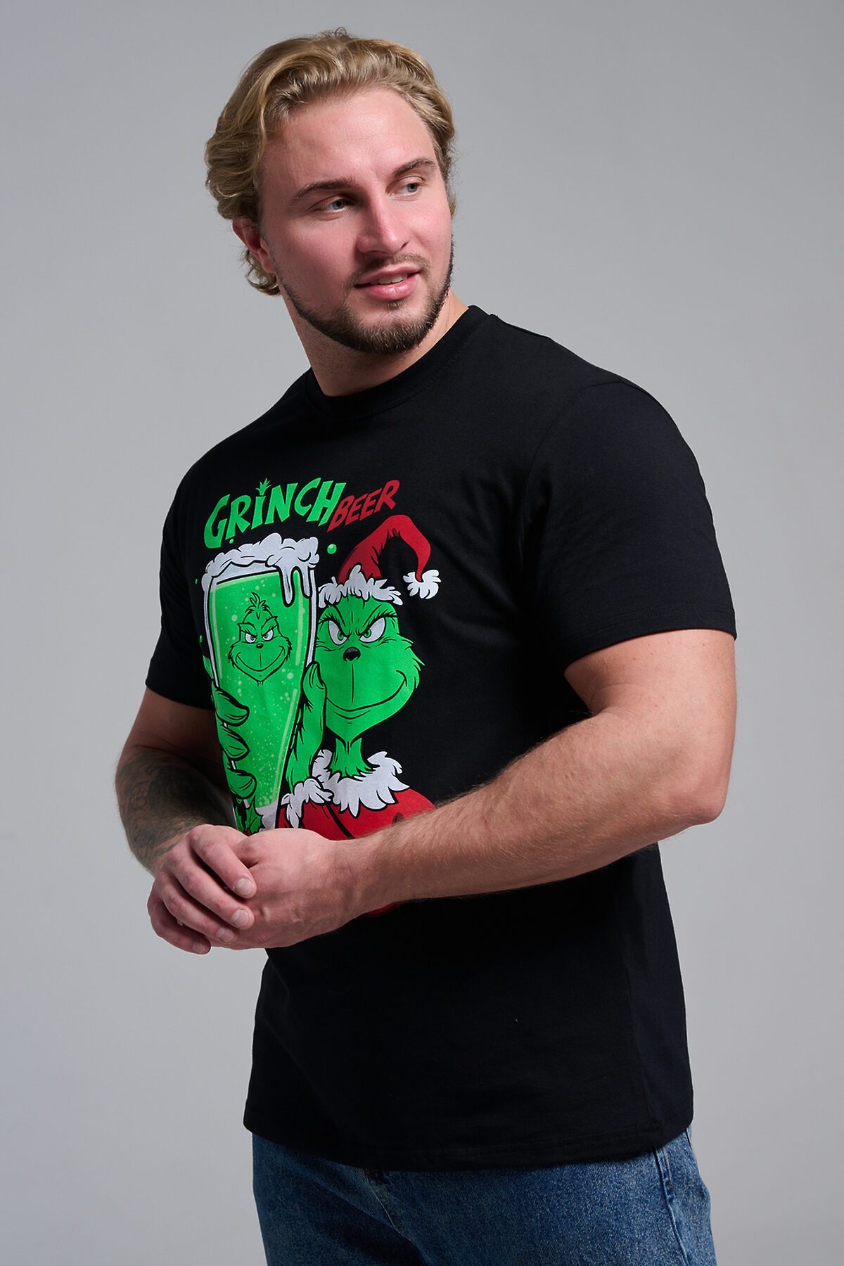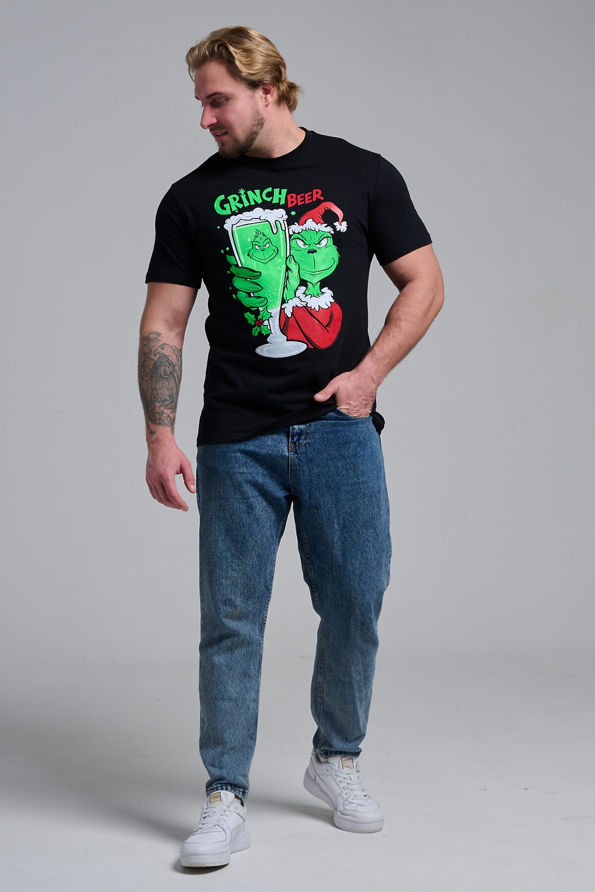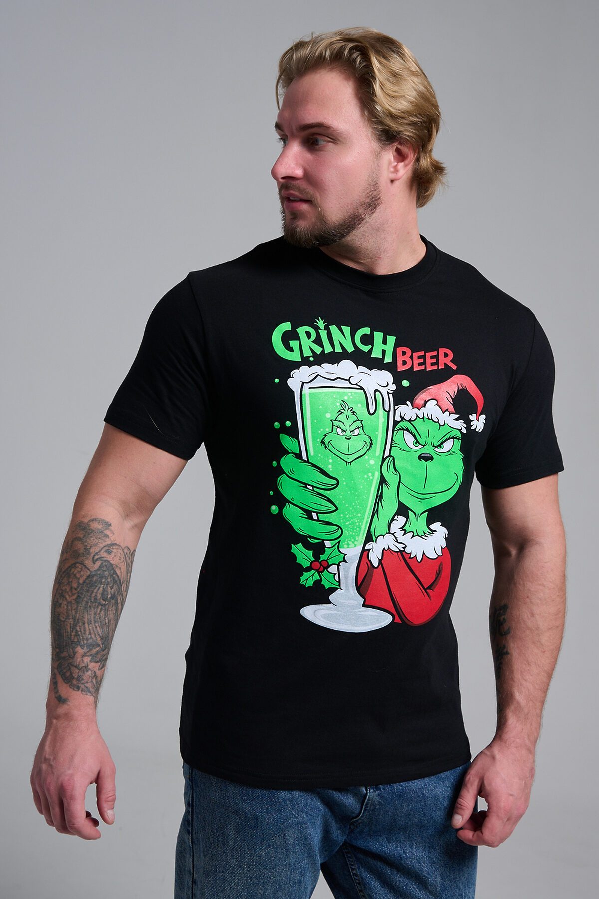Чёрная хлопковая футболка с забавным принтом: Гринч в красной шапке держит большой бокал пива с пеной! Надпись Grinch Beer сверху, яркий зелёно-красный дизайн для новогоднего юмора. Мягкий 100% хлопок, унисекс, размеры 46-64. Идеально для вечеринок, баров или casual-носки. Добавит иронии фанатам Гринча!