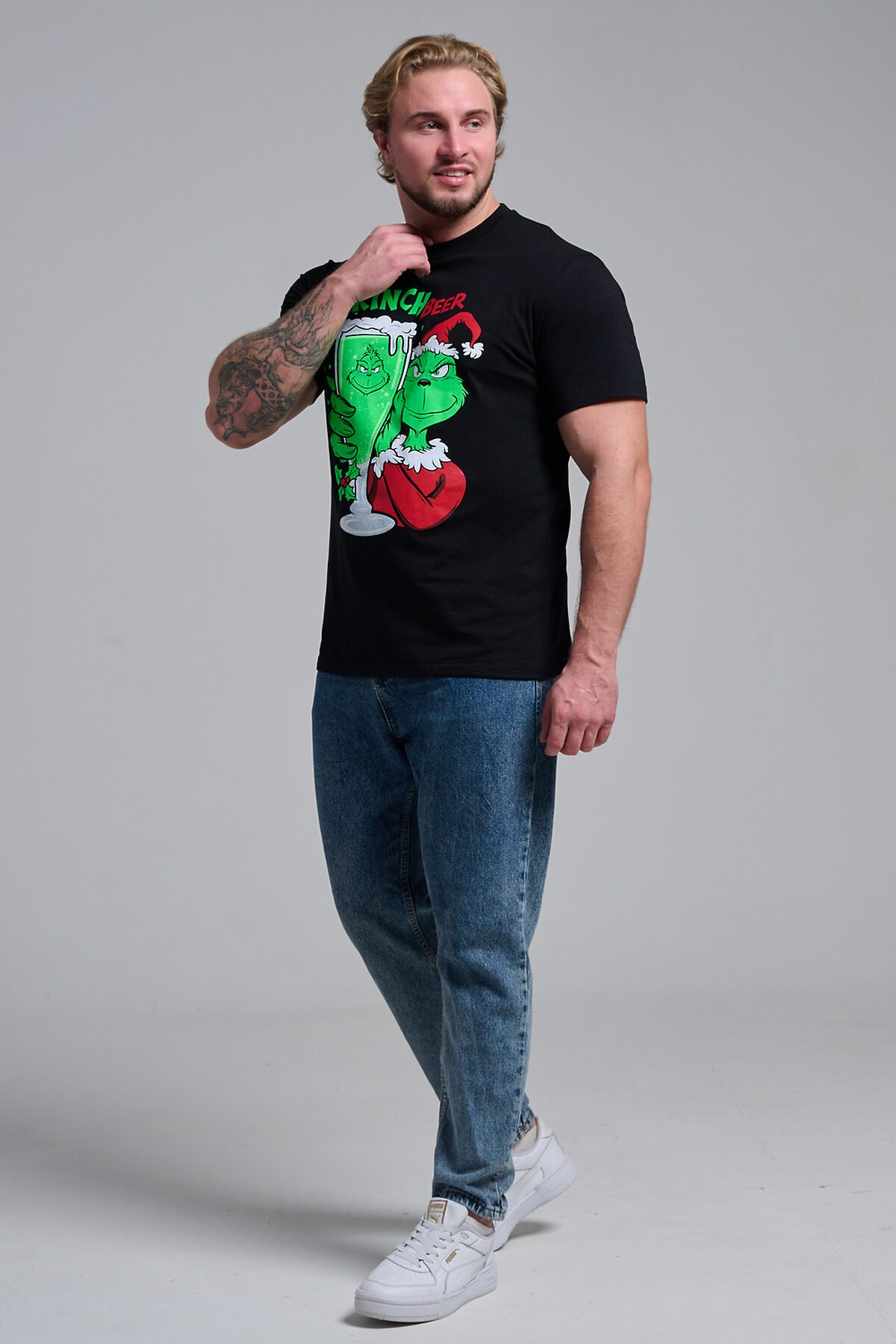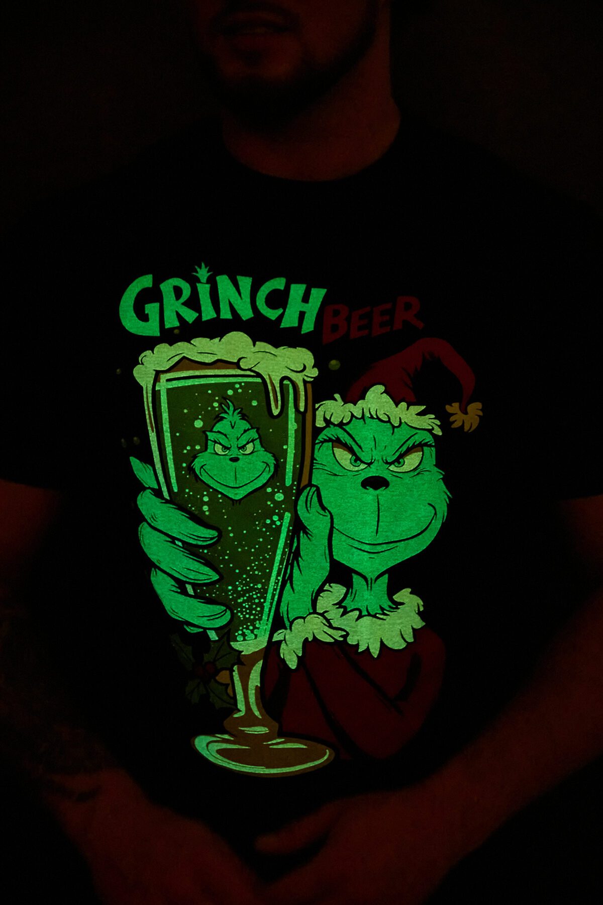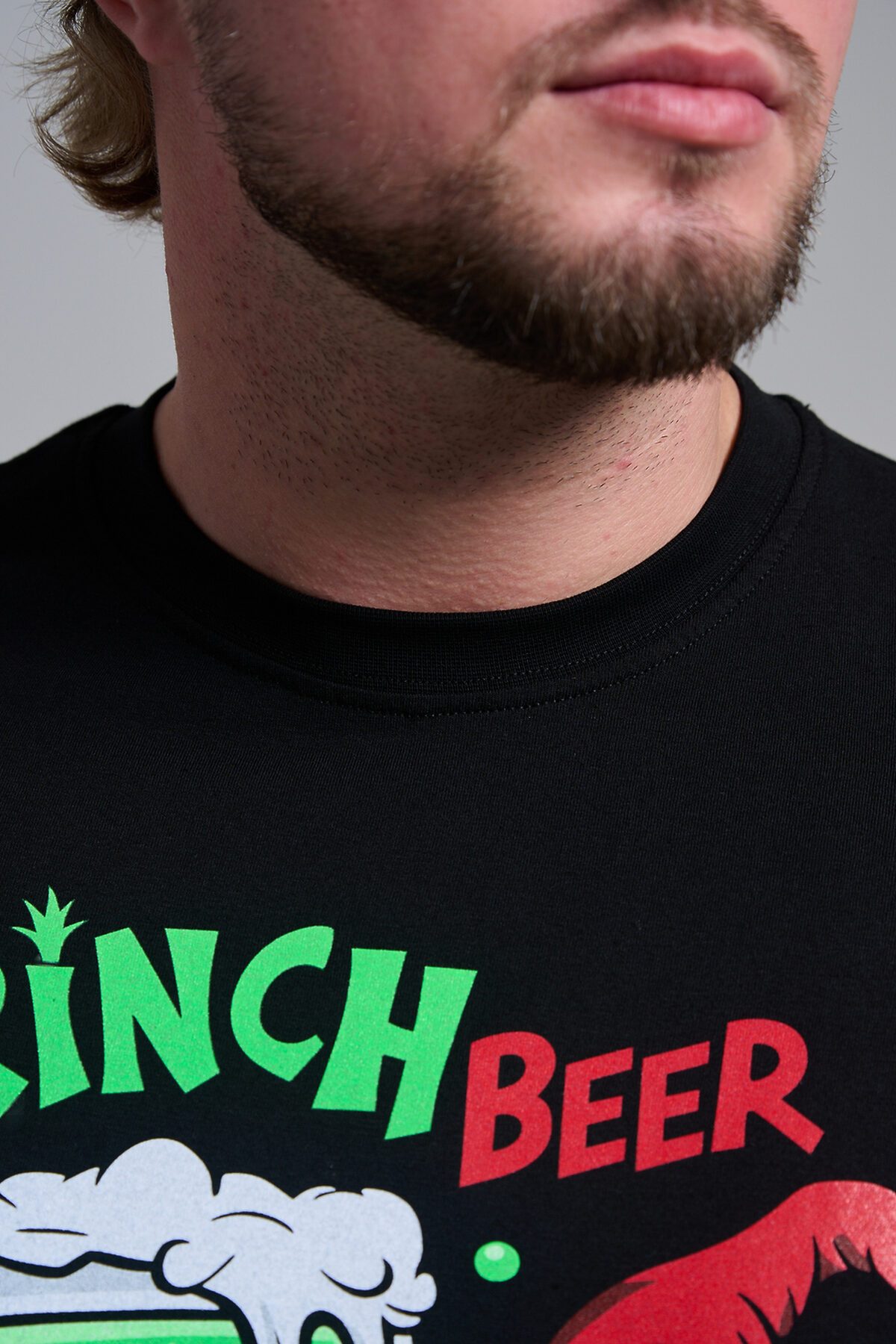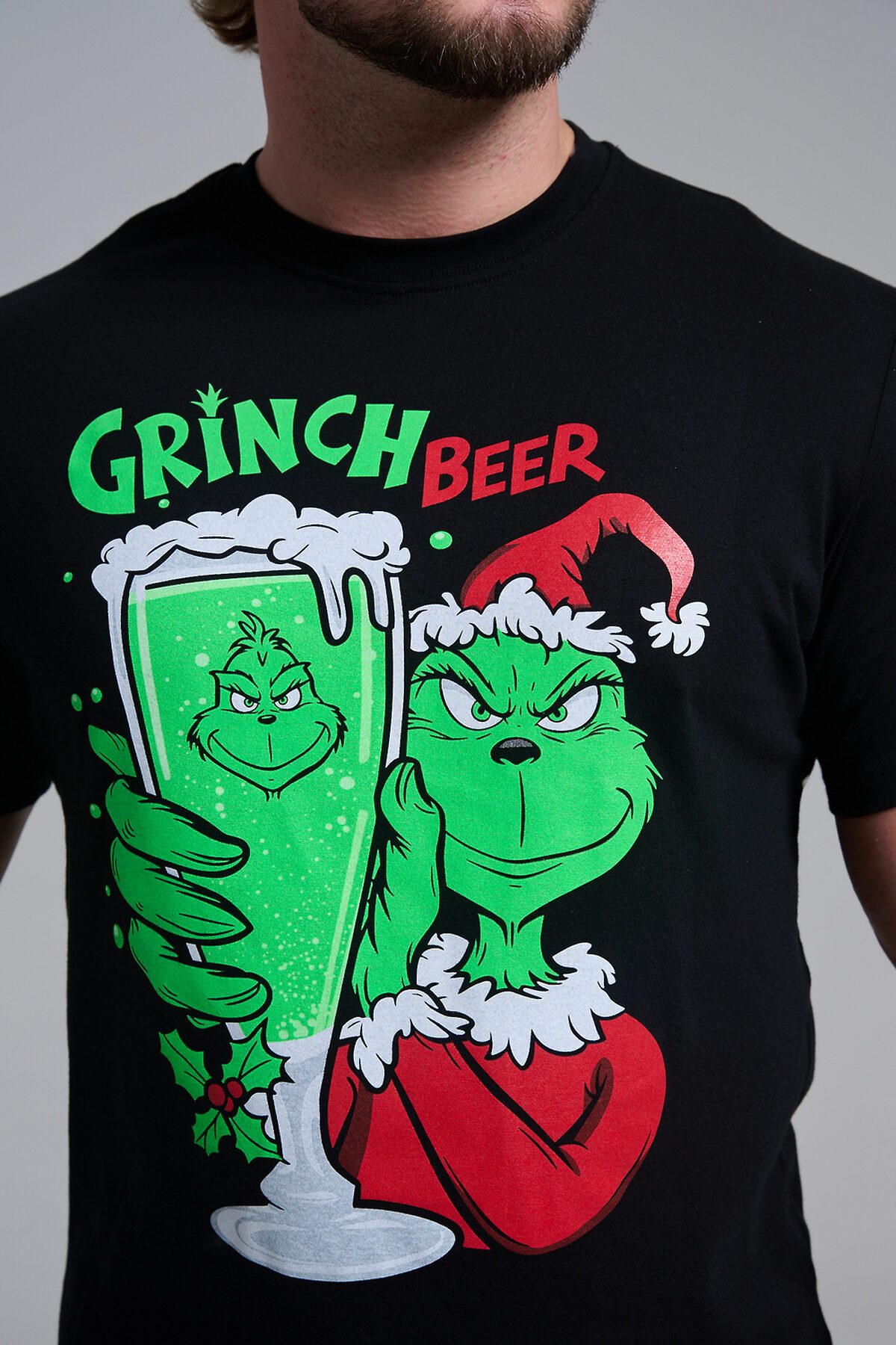 Чёрная хлопковая футболка с забавным принтом: Гринч в красной шапке держит большой бокал пива с пеной! Надпись Grinch Beer сверху, яркий зелёно-красный дизайн для новогоднего юмора. Мягкий 100% хлопок, унисекс, размеры 46-64. Идеально для вечеринок, баров или casual-носки. Добавит иронии фанатам Гринча!