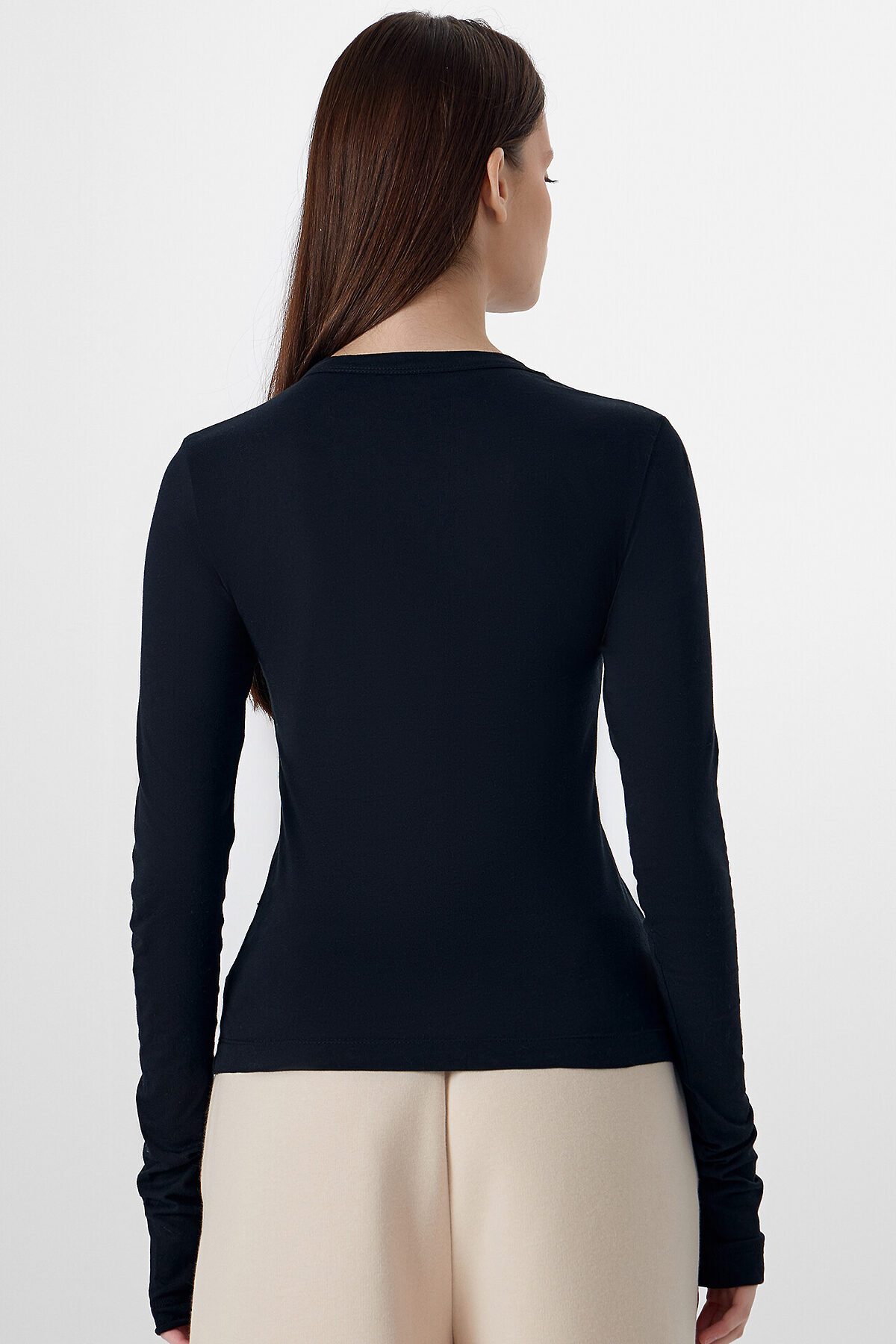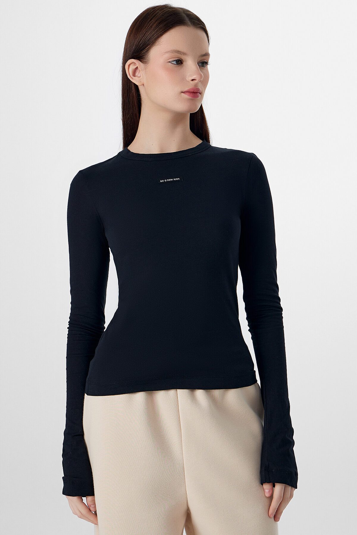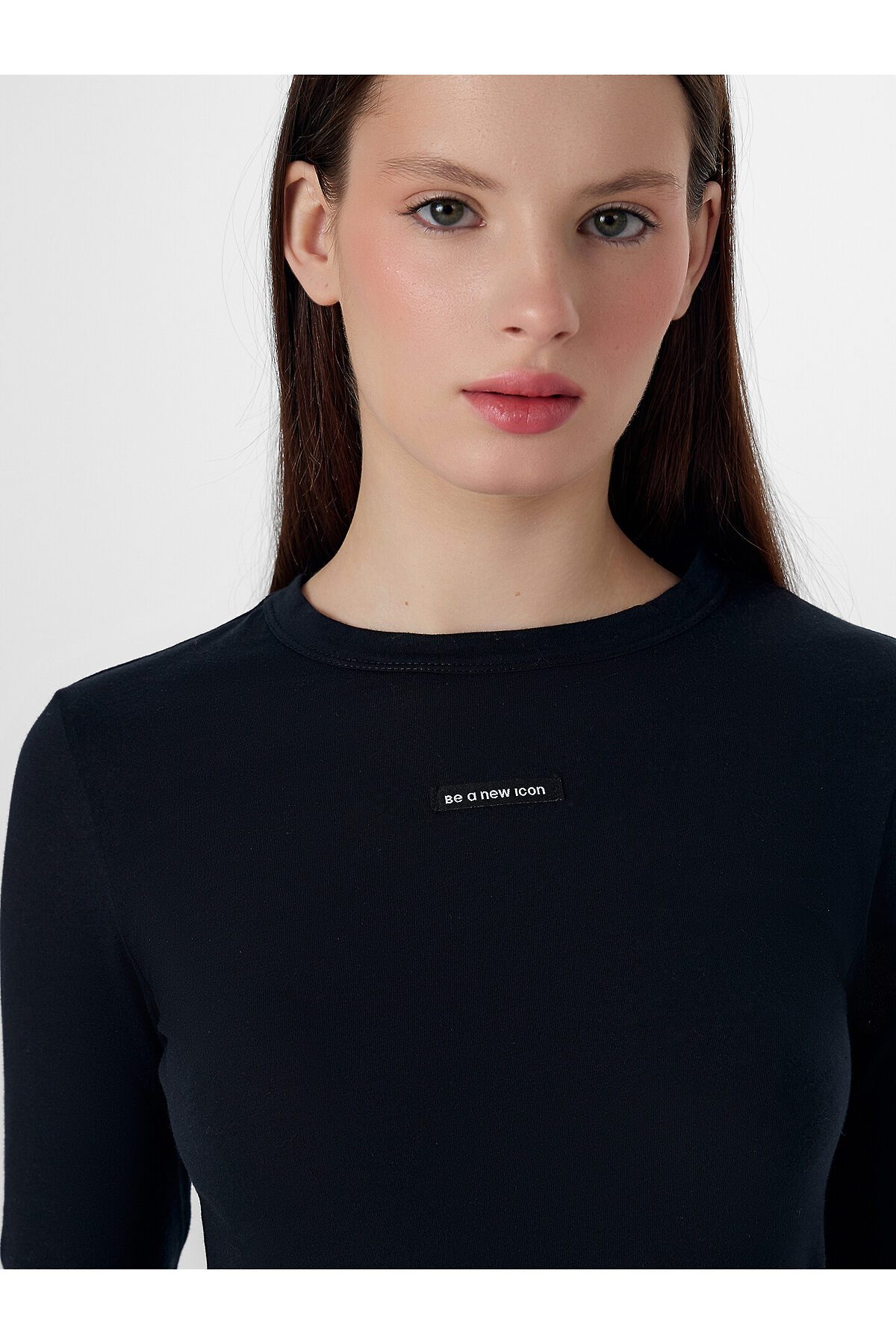 Круглая горловина аккуратно обработана для сохранения формы. Надпись выполнена в виде нашивки, подчеркивая индивидуальность и неформальный стиль. Длинные рукава и классическая длина по низу обеспечивают комфорт при носке.