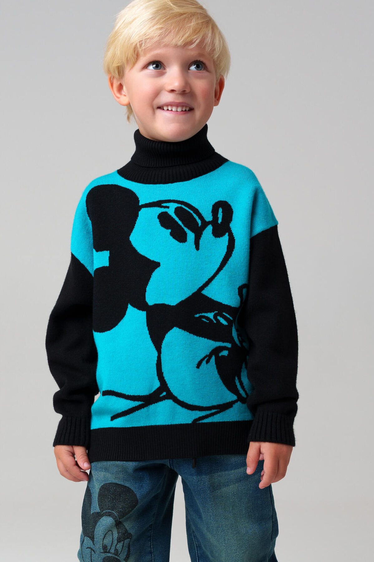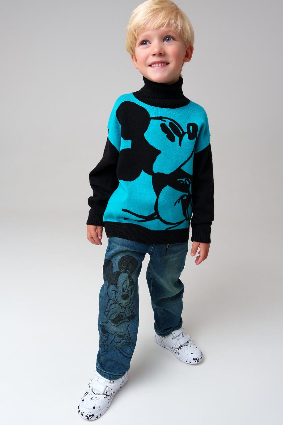 Детский свитер с лицензионным принтом Микки Мауса для мальчика от PlayToday — яркая и запоминающаяся модель для маленьких модников. Свитер выполнен из мягкой и эластичной пряжи, которая дарит комфорт в течение всего дня и хорошо держит форму даже после многочисленных стирок. Преимущества модели: + вискоза в составе — приятна к телу, обладает дышащими свойствами + нейлон — прочность и устойчивость к растяжению + высокий ворот — дополнительная защита шеи от ветра + яркий лицензионный принт Disney — стильный акцент в гардеробе + мягкая плотная вязка — комфорт в прохладное время года Советы по стилю: Этот свитер легко сочетается с базовыми джинсами, спортивными или утеплёнными брюками. Яркий цвет отлично освежает образ, а узнаваемый принт Disney добавляет игривости и индивидуальности. Для выхода на прогулку можно добавить жилет, куртку или пуховик. Когда и как носить: Оптимален для осенне-зимнего сезона, подходит для детского сада, школы, семейных выходов и прогулок на свежем воздухе. Высокий ворот заменит шарф в тёплую погоду, а сама модель легко надевается и не сковывает движений — удобно для активных детей. Размеры: 98-122 подойдет для мальчиков дошкольного младшего школьного возраста. Свитер детский с Микки Маусом для мальчика от PlayToday — тепло, комфорт и любимый герой рядом каждый день!