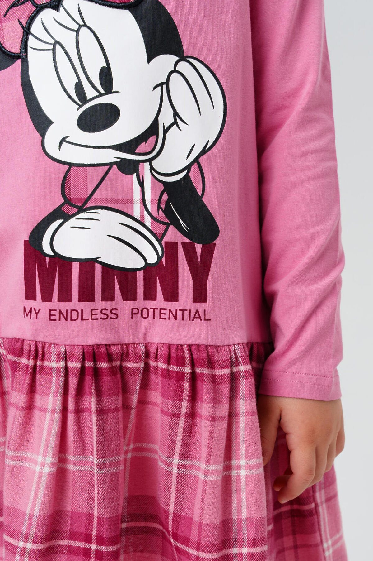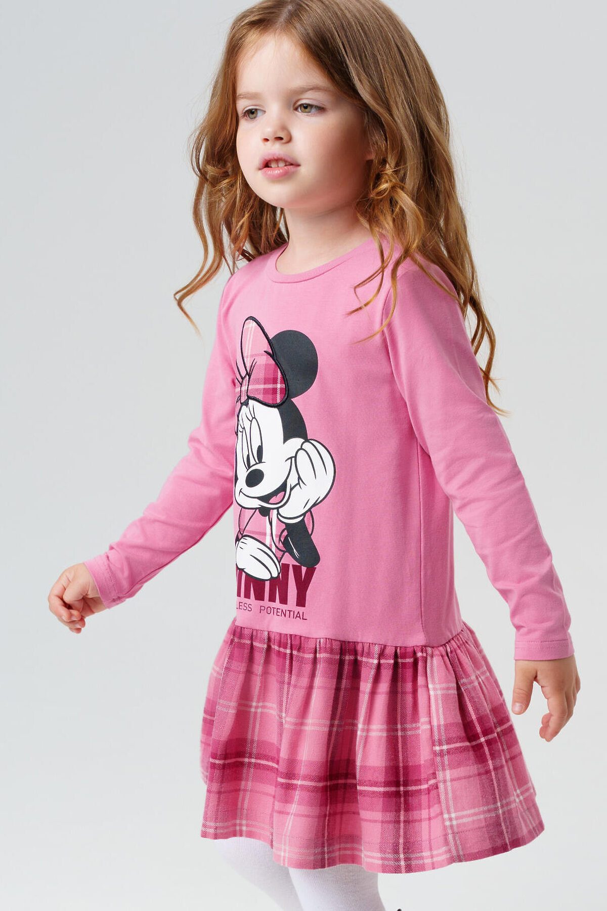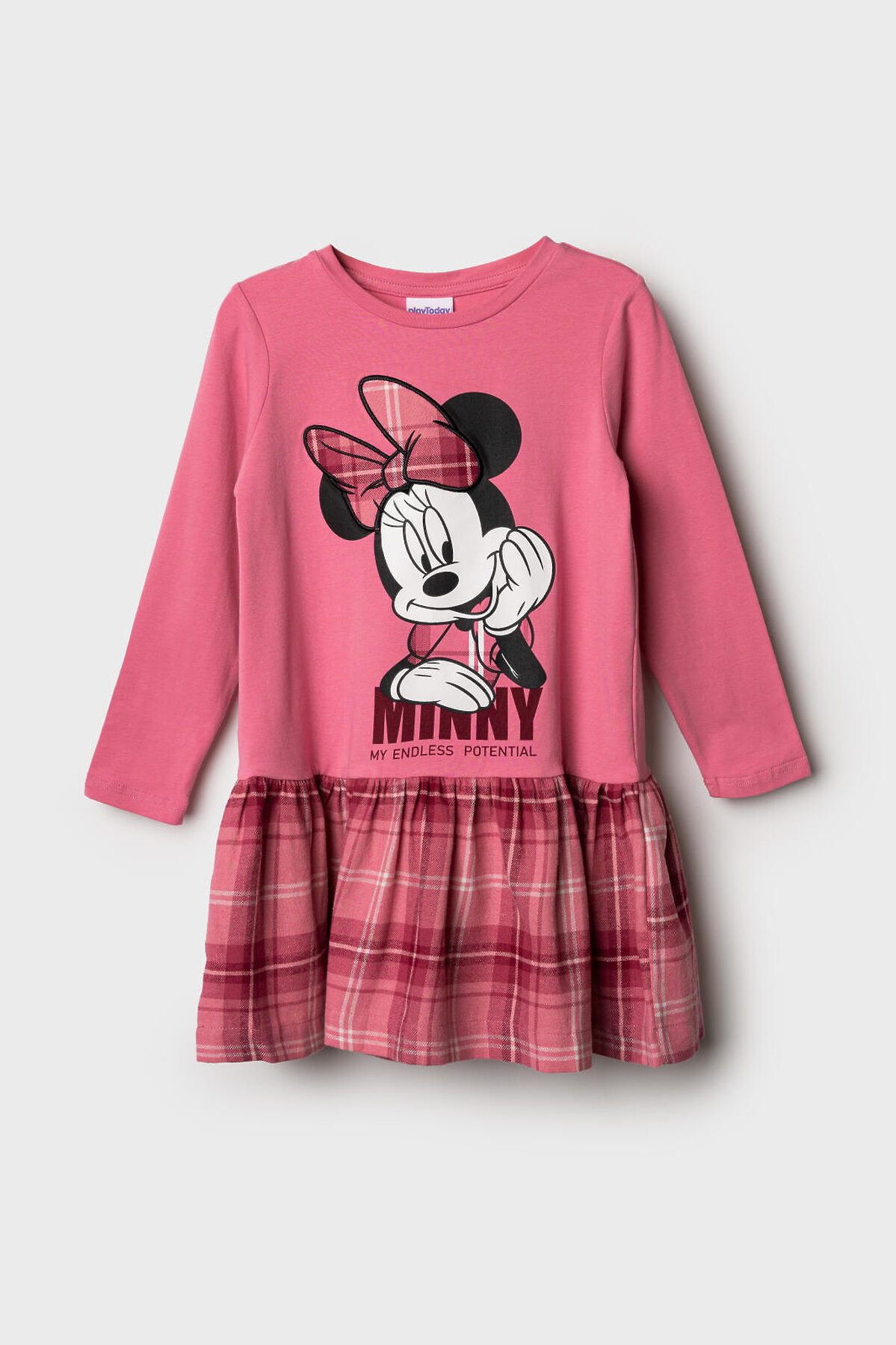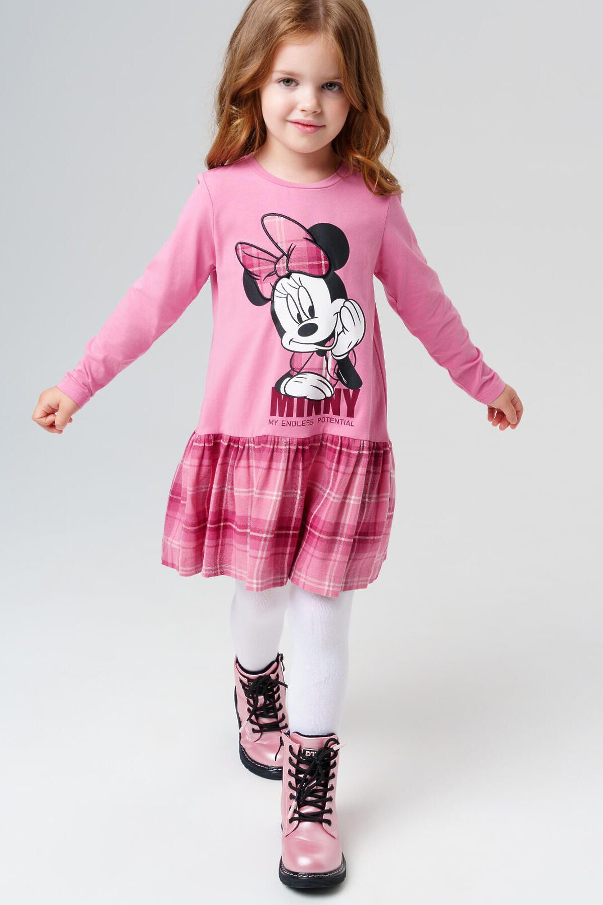 Детское трикотажное платье для девочки от PlayToday с принтом Минни Маус — стильное и удобное решение для сада, праздников и прогулок. Верх выполнен из мягкого хлопкового трикотажа с эластаном, низ — из клетчатой фланели, что создаёт эффектный контраст и делает образ более нарядным. Преимущества модели: + хлопковый трикотаж с эластаном — дышащий материал, комфортный для кожи ребенка + клетчатая юбка из мягкой фланели — трендовый элемент и уютный вариант для прохладного сезона + застёжка на кнопки — легко надевать даже самым маленьким девочкам + яркий принт с Минни Маус — любимый персонаж, который дарит настроение + удобный крой — не сковывает движений, подходит для школы и повседневных дел Когда и как носить: Такое платье отлично подойдёт для детского сада, школы, прогулок и праздников. С колготками и ботинками получится удобный повседневный образ, а с балетками или туфельками — нарядный комплект. Совет по стилю: Сочетайте платье с плотными колготками и кардиганом PlayToday для прохладных дней. Размеры: 98, 104, 110, 116, 122 см подходит для девочек от 3 до 7 лет, как для сада, так и для младшей школы. Модное трикотажное платье для девочки с принтом Минни Маус от PlayToday — яркий образ для школы, сада и прогулок.