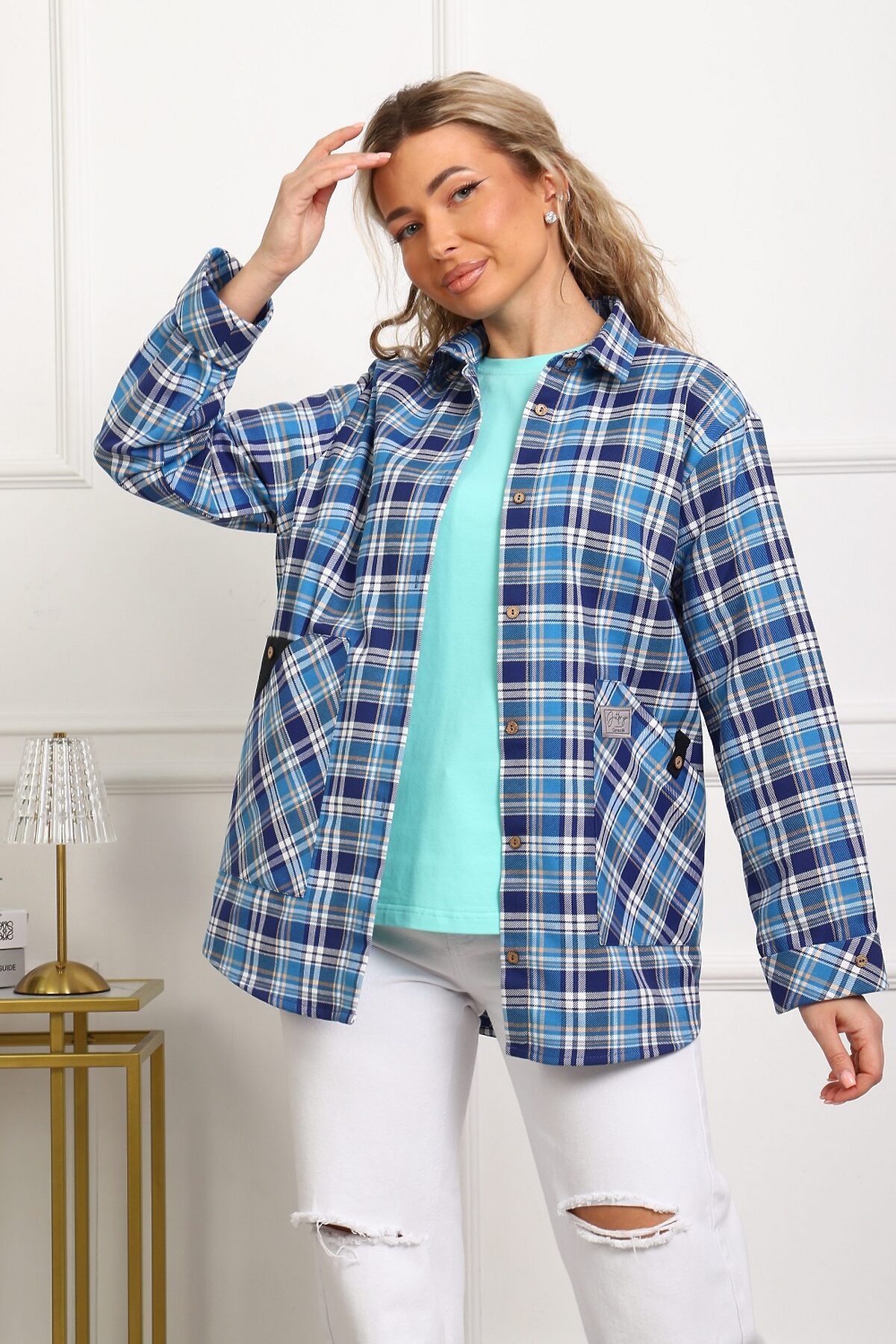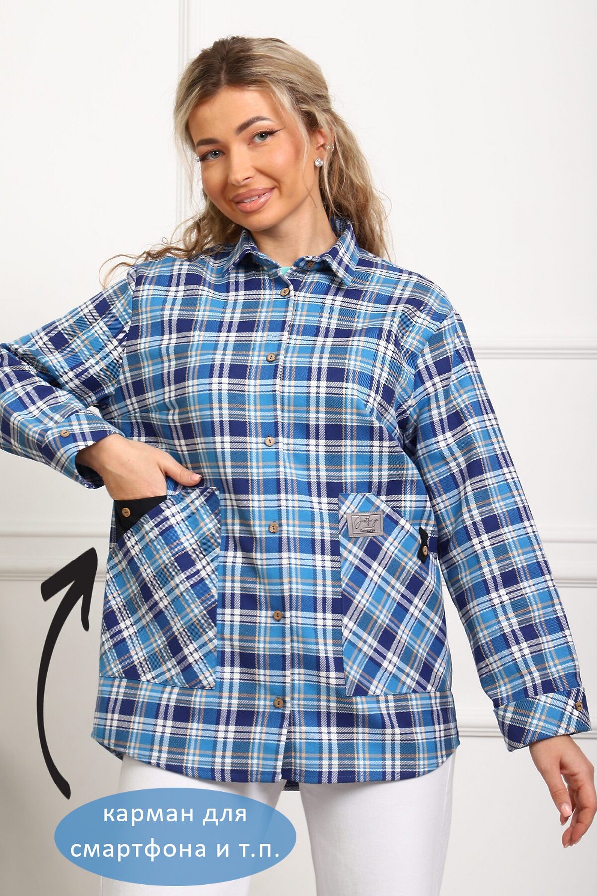 Женская теплая рубашка с очень удобными карманами-кенгуру и специальным акцентным чёрным карманом для смартфона (пластиковых карт, ручек, очков и т.п.), один из карманов-кенгуру можно застегивать петелькой на пуговицу. Рукава с манжетом, который подгибается - благодаря этому длина рукава регулируется в пределах 5 см (можно сделать чуть короче, чуть длинне). Крой рубашки очень комфортный, изделие не сковывает движений. Прямой силуэт стройнит. Ткань - фуле (относительно плотный материал, с небольшим начёсом с изнанки), 100% хлопок. Фуле легко утюжится, относительно не сильно мнётся, ткань устойчива к износу. Замечательный выбор для отдыха и работы. Наверняка, станет Вашей любимой рубашкой. Обратите, пожалуйста, внимание на рубашку аналогичного кроя, но из ткани шотландки - артикул 1072.