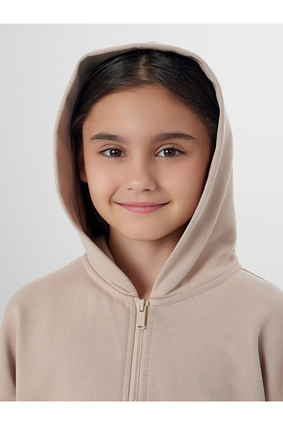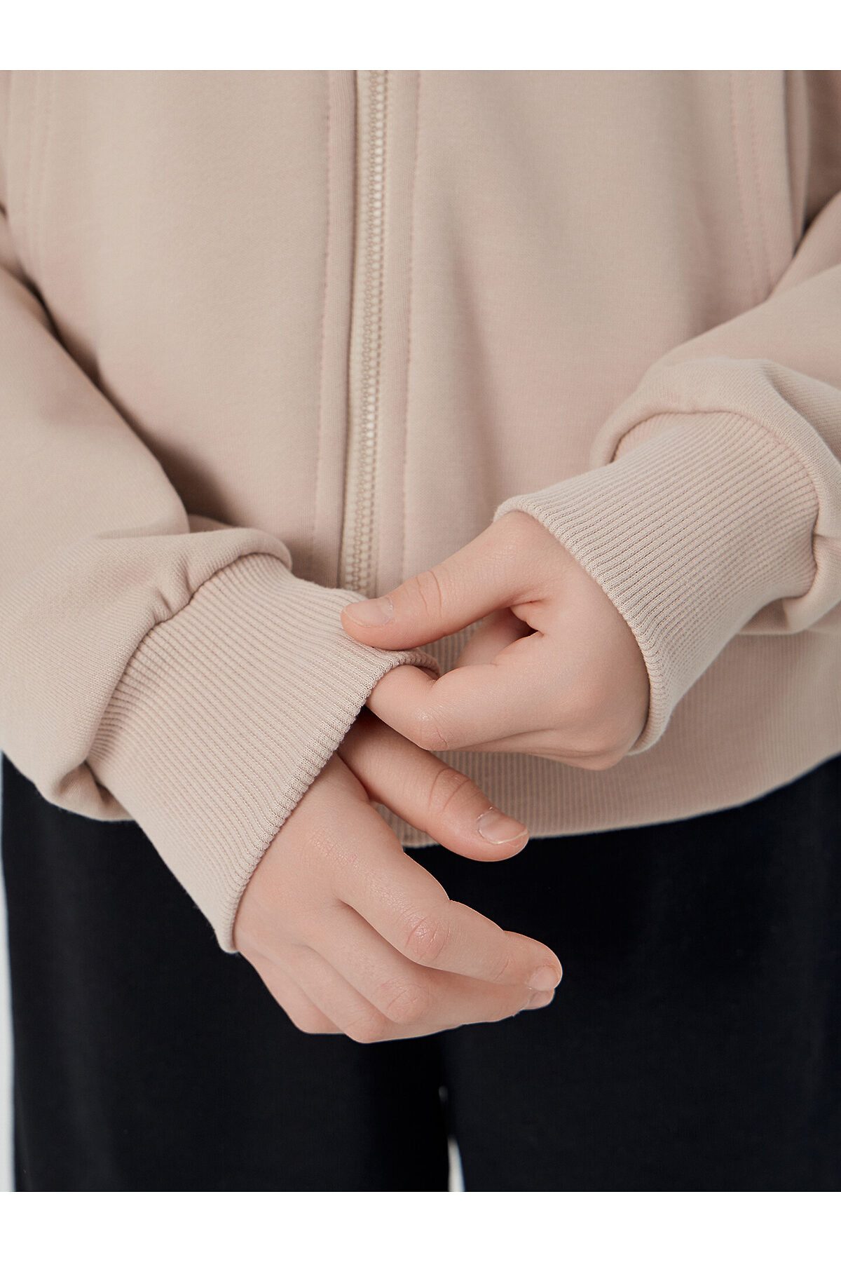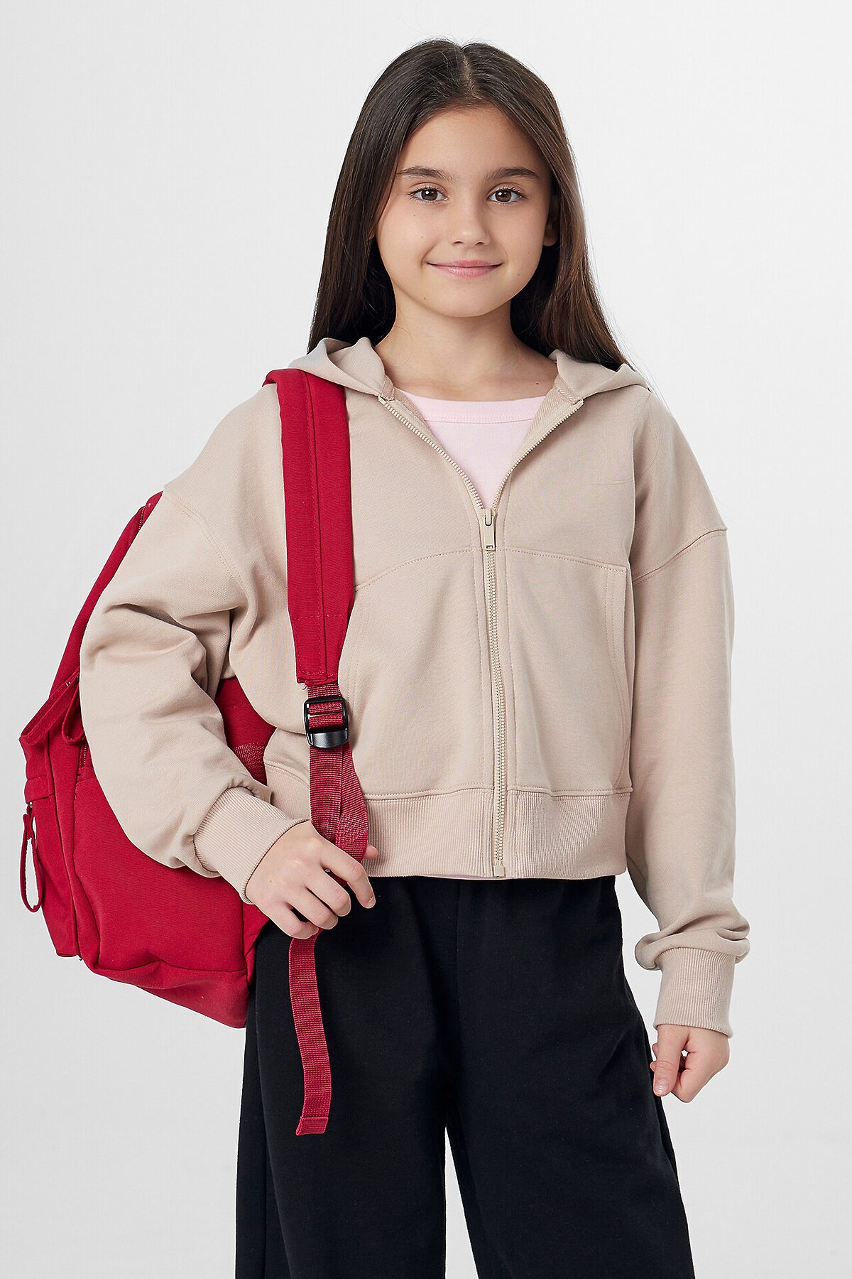 Толстовка для девочек прямого силуэта с капюшоном. Капюшон на подкладке из основного полотна. Шов втачивания капюшона закрыт х/б тесьмой. Рукава втачные, линия плеча спущена. Притачные манжеты по низу рукавов и притачной пояс из рибаны. По переду застежка молния, карман кенгуру.