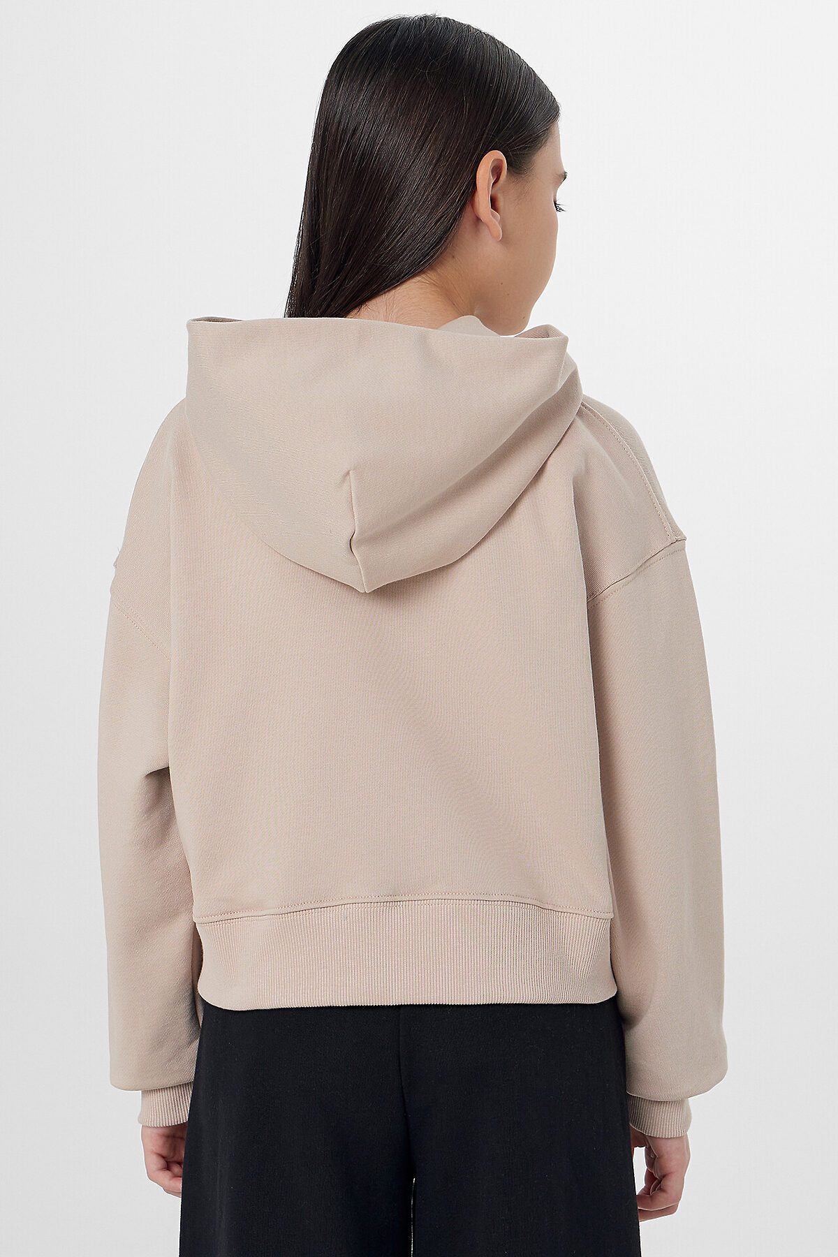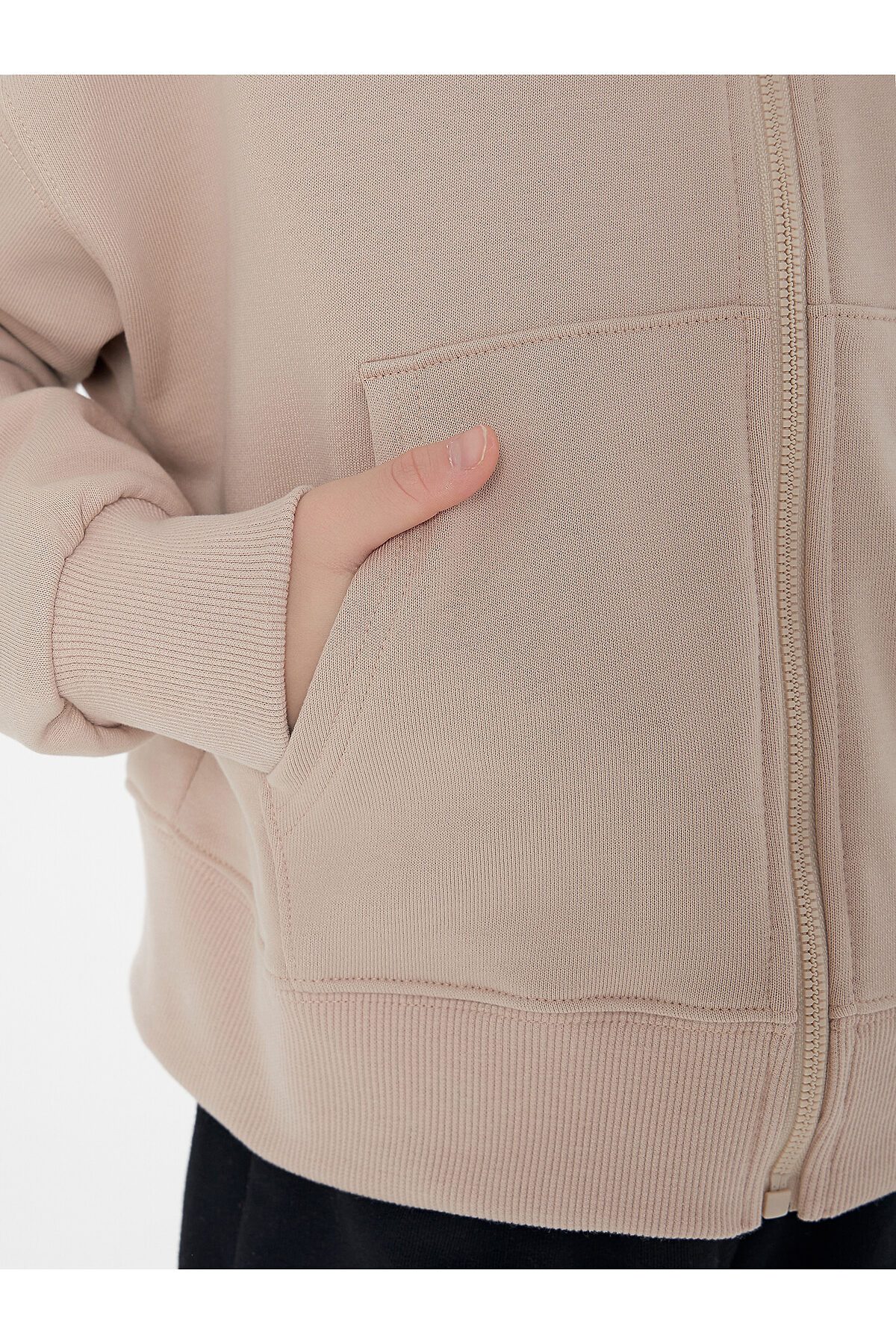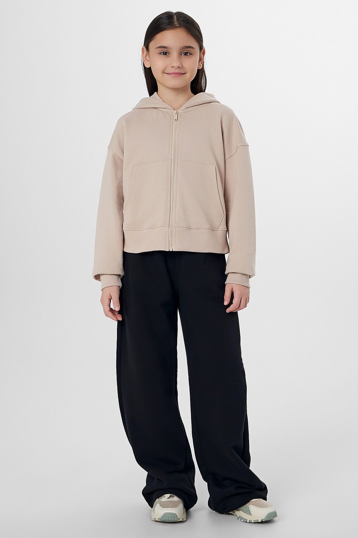 Толстовка для девочек прямого силуэта с капюшоном. Капюшон на подкладке из основного полотна. Шов втачивания капюшона закрыт х/б тесьмой. Рукава втачные, линия плеча спущена. Притачные манжеты по низу рукавов и притачной пояс из рибаны. По переду застежка молния, карман кенгуру.