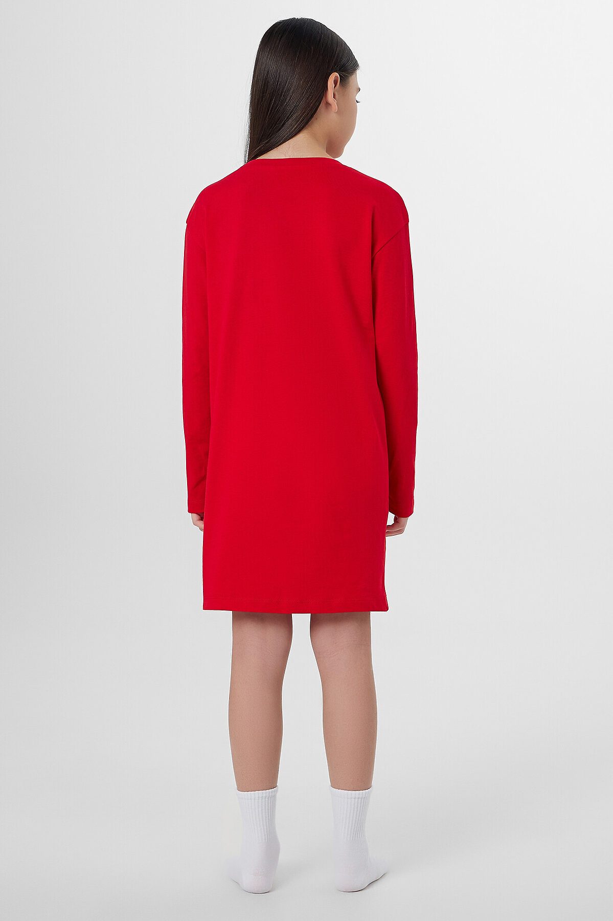 Сорочка для девоччки прямого свободного силуэта. Горловина круглой формы, обработана обтачкой из основного полотна. Рукава втачные длинные, линия плеча спущена. Низ изделия и рукавов обработан на 2-х игольной плоскошовной машине швом в подгибку.