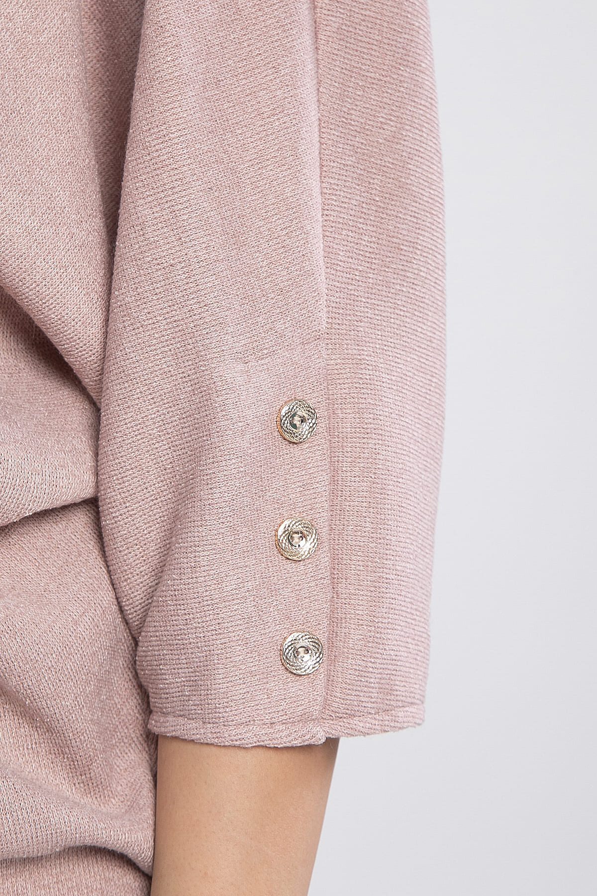 Этот уютный трикотажный джемпер с рукавами летучая мышь в пудровом цвете — идеальное сочетание комфорта и стиля. Благодаря свободному крою и мягкому материалу он создает ощущение легкости и свободы движений, а V-образный вырез добавляет нотку элегантности и женственности. Идеальный выбор для прохладных дней, когда хочется выглядеть стильно и чувствовать себя уютно в любой ситуации. Рукава цельнокроеные, украшенные тремя пуговицами с каждой стороны. Есть притачной пояс по низу изделия.