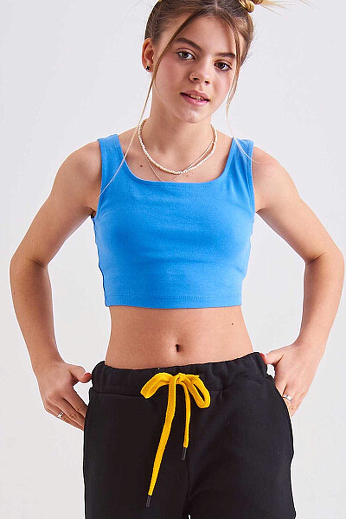 Удобный базовый облегающий топ для девочки, укороченный, с широкими лямками. Выполнен из эластичного трикотажного полотна. Топ будет прекрасным дополнением к моделям из джинсовой и летней коллекции SMENA.