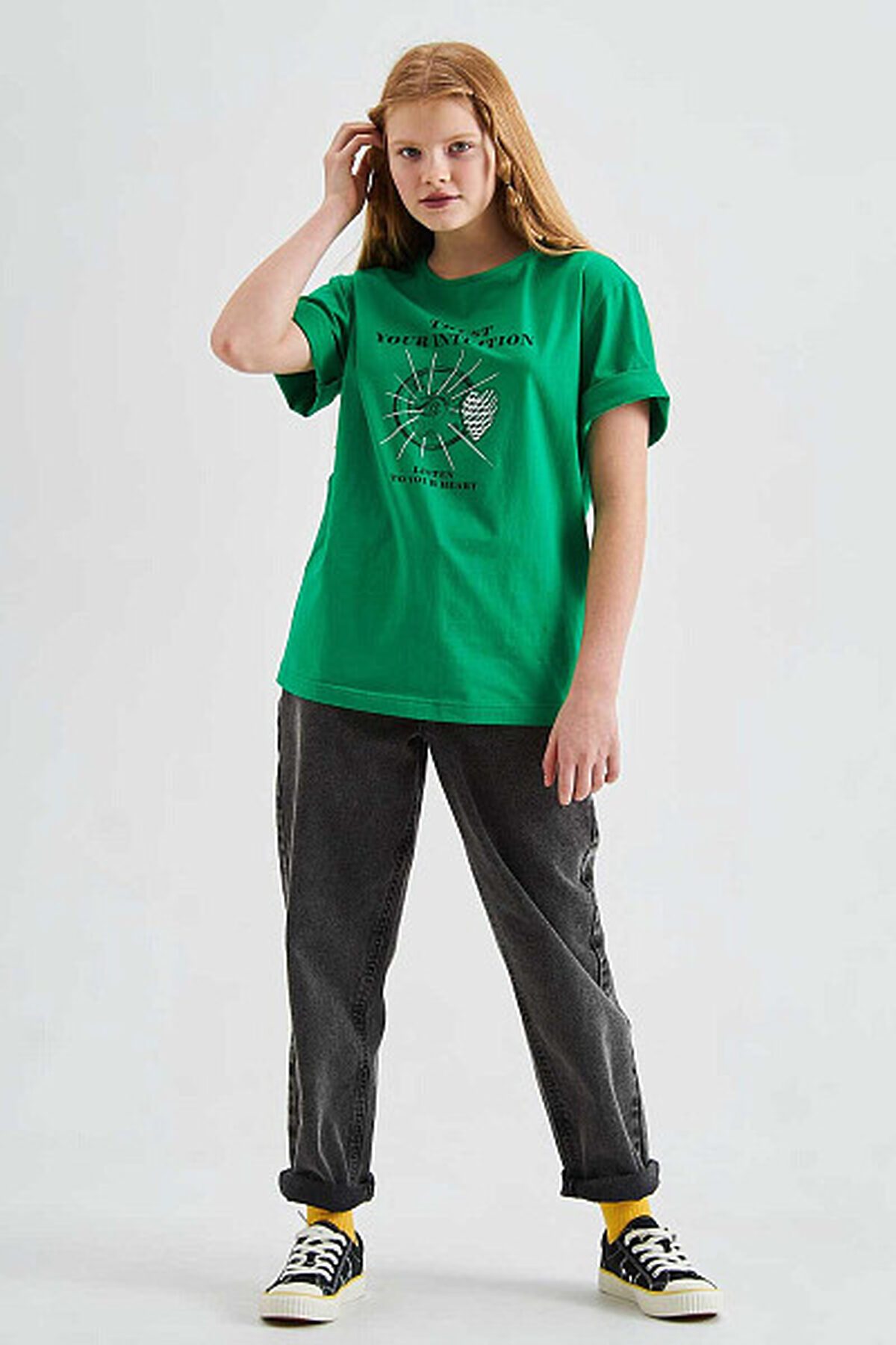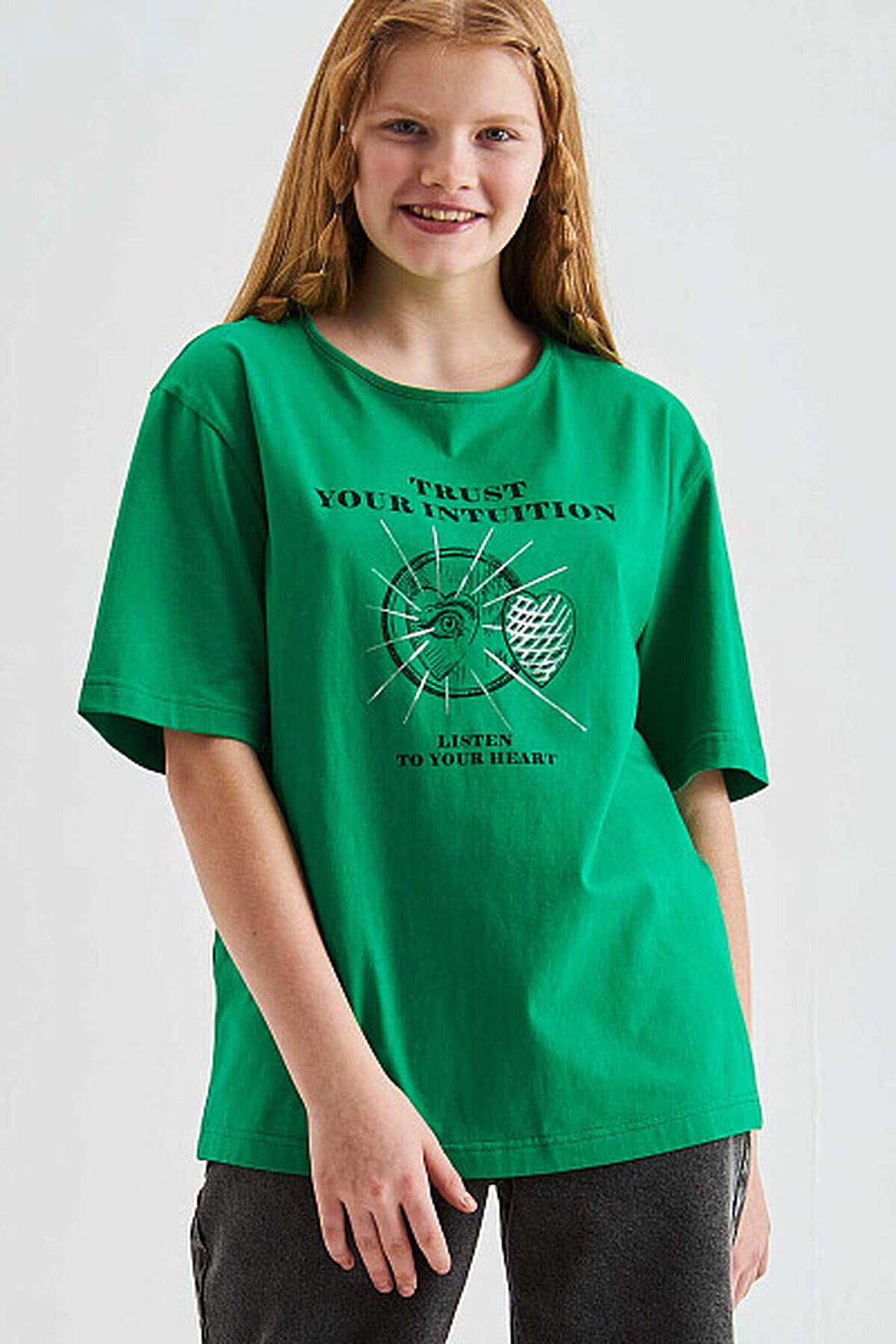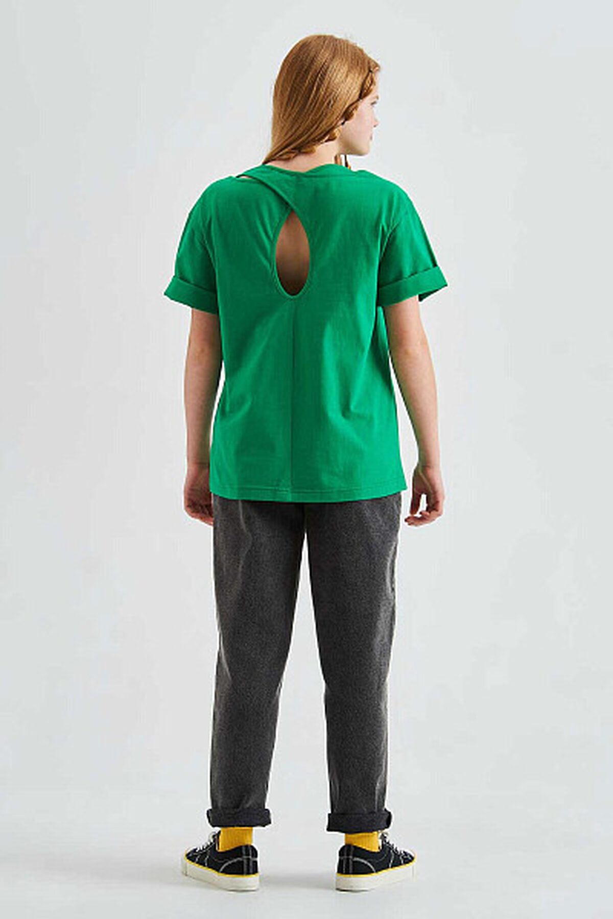 Трикотажная футболка свободного силуэта с принтом и фигурным вырезом по спинке изделия.