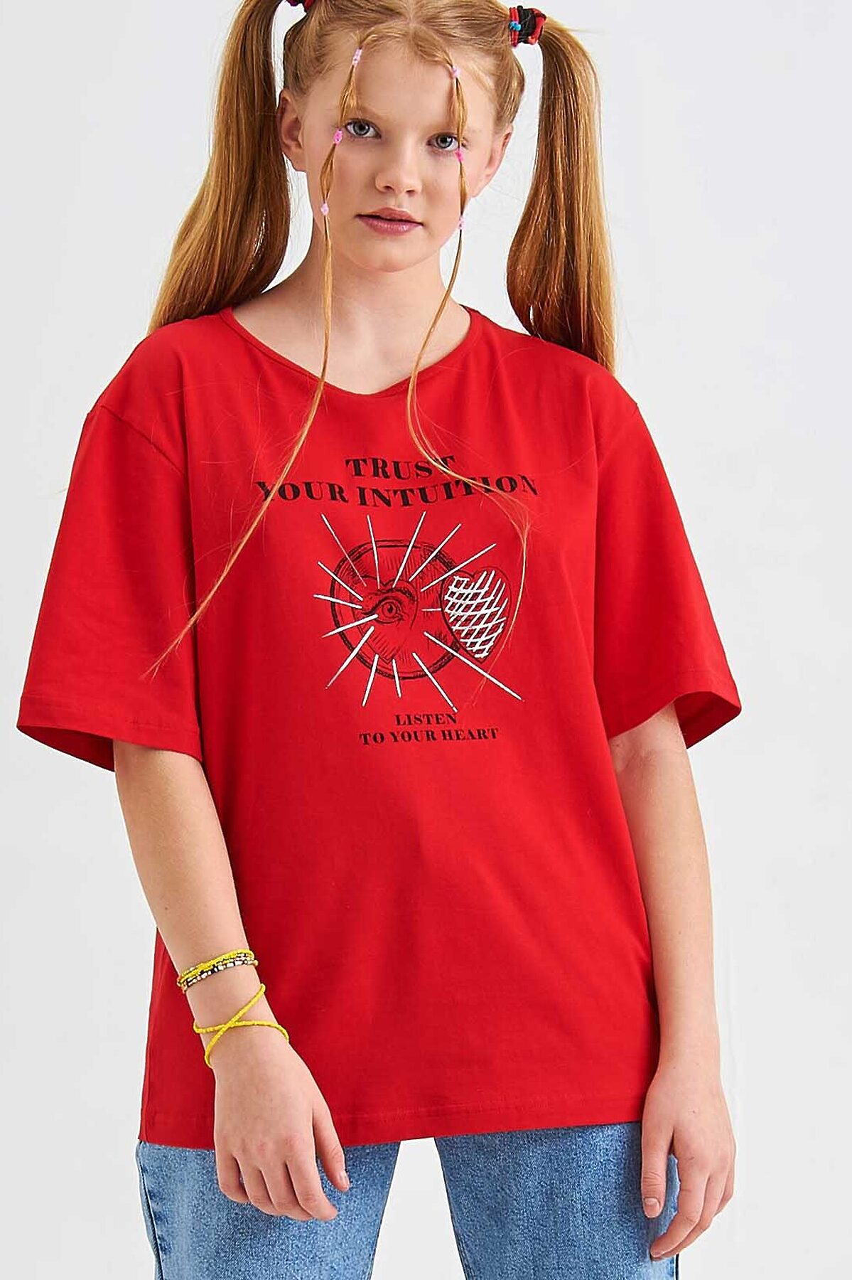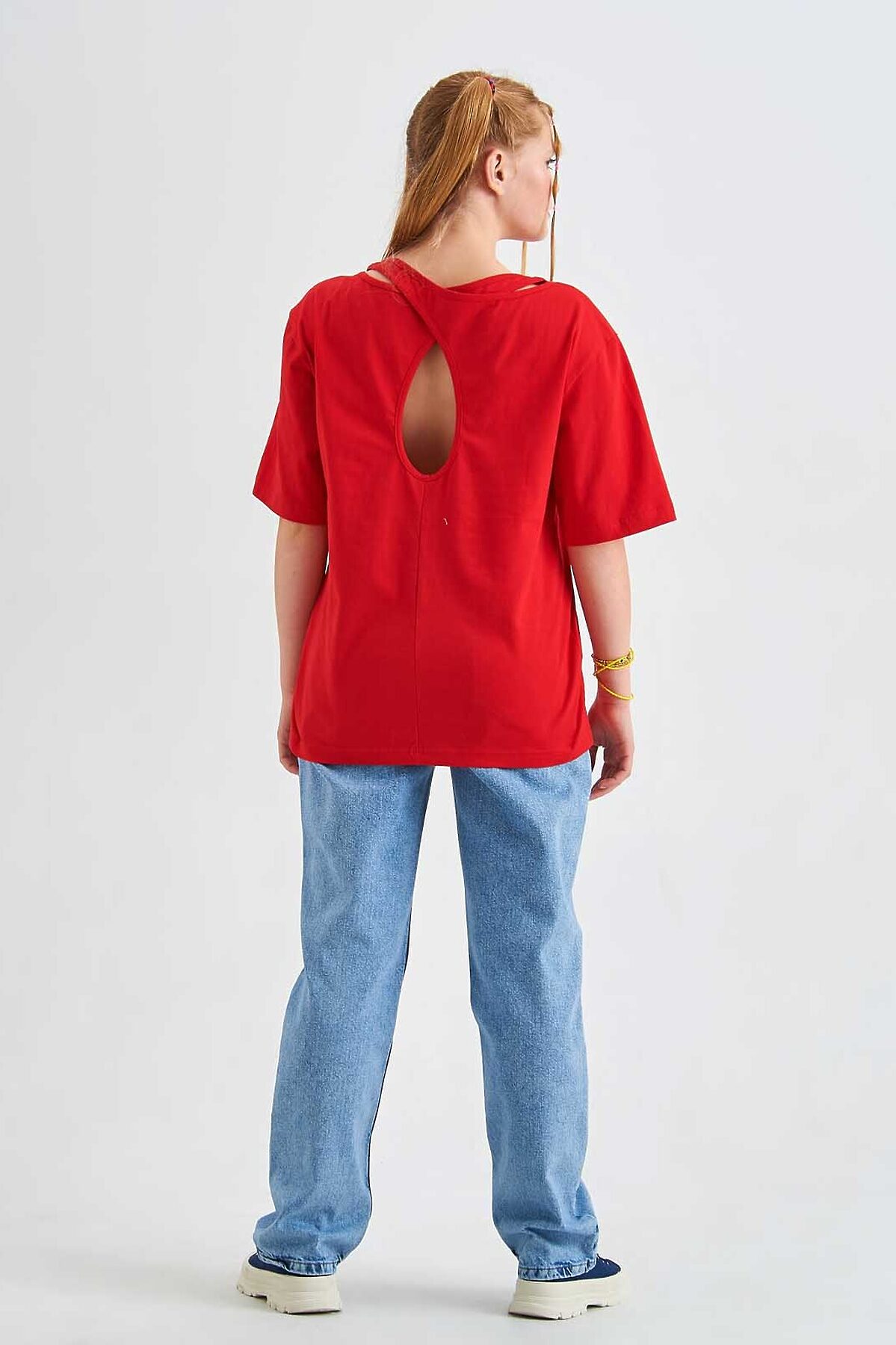 Трикотажная футболка свободного силуэта с принтом и фигурным вырезом по спинке изделия.