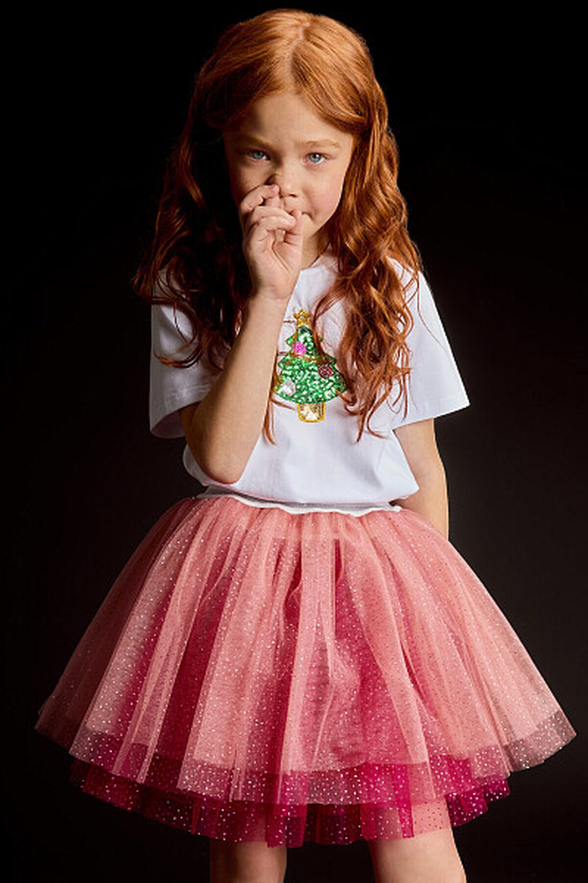 Стильная белая футболка для девочек свободного силуэта, которая подойдет для любого зимнего торжества. Она идеально сочетается как с брюками, так и с юбкой. Футболка изготовлена из мягкого и нежного хлопка, который прекрасно сидит на фигуре и не сковывает движения во время активных игр. Оригинальная аппликация из блестящих пайеток придаст образу оригинальности и яркости.