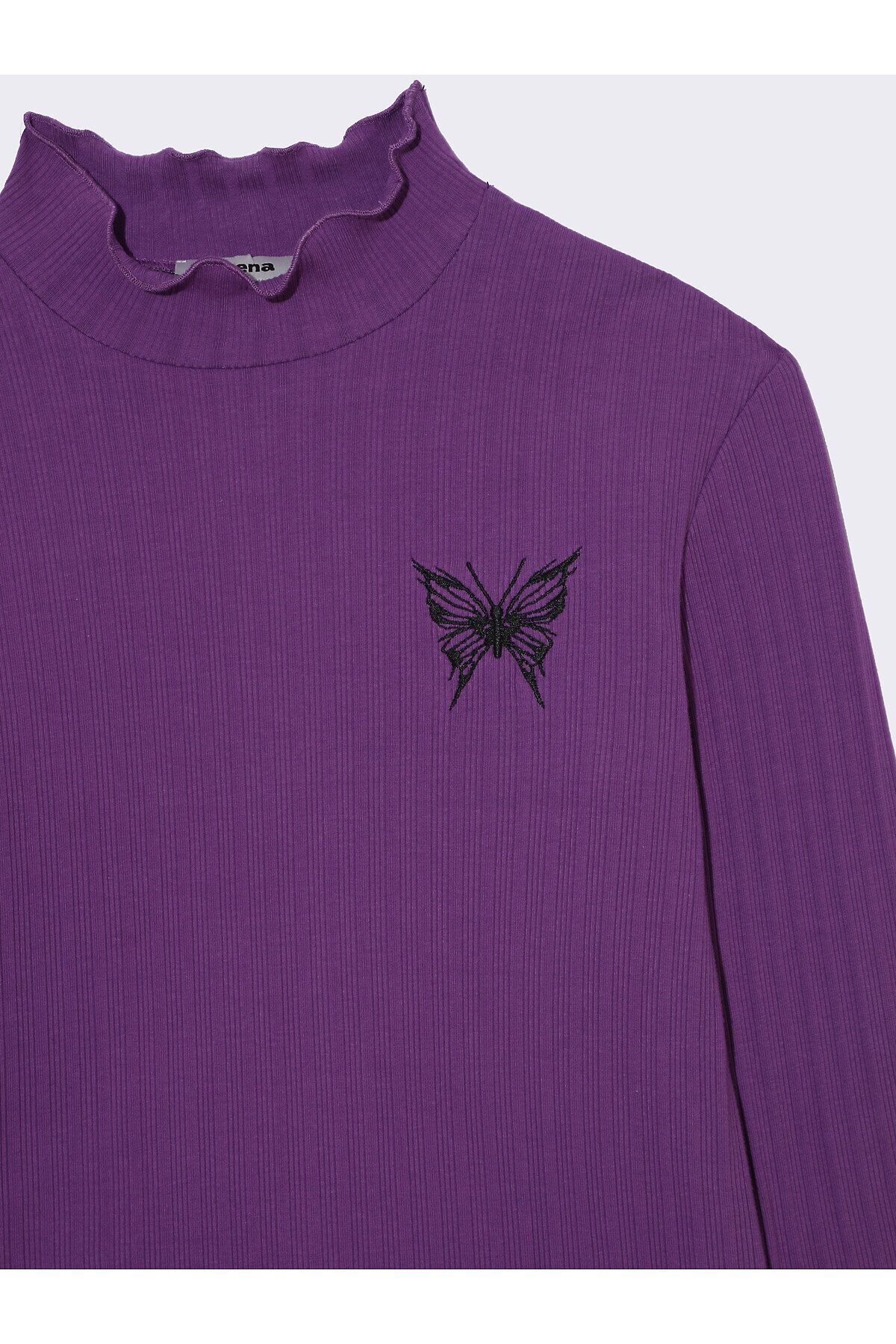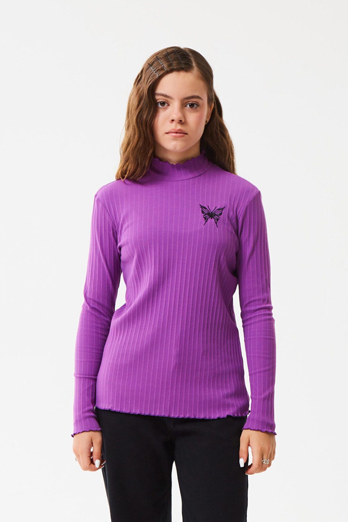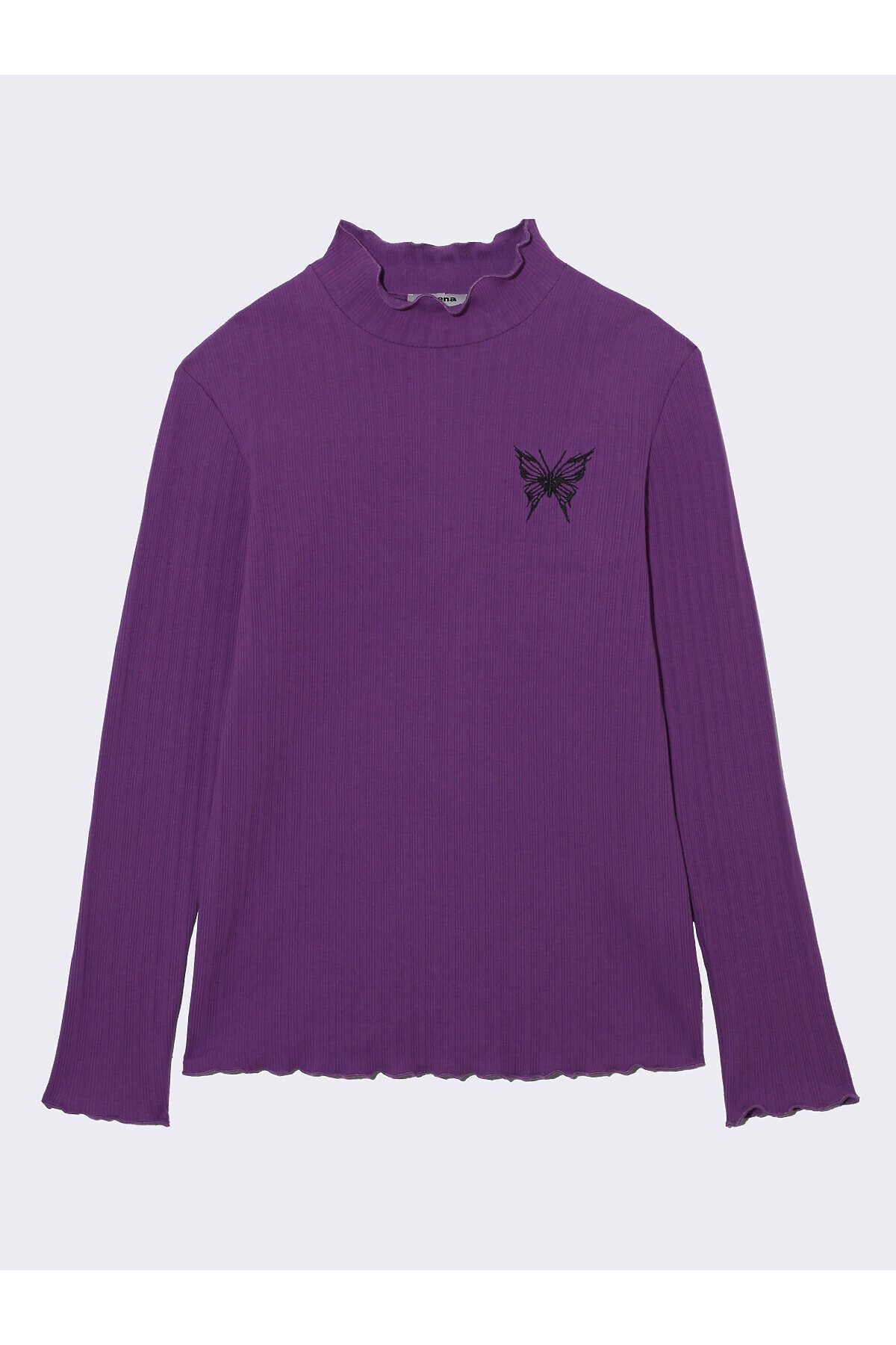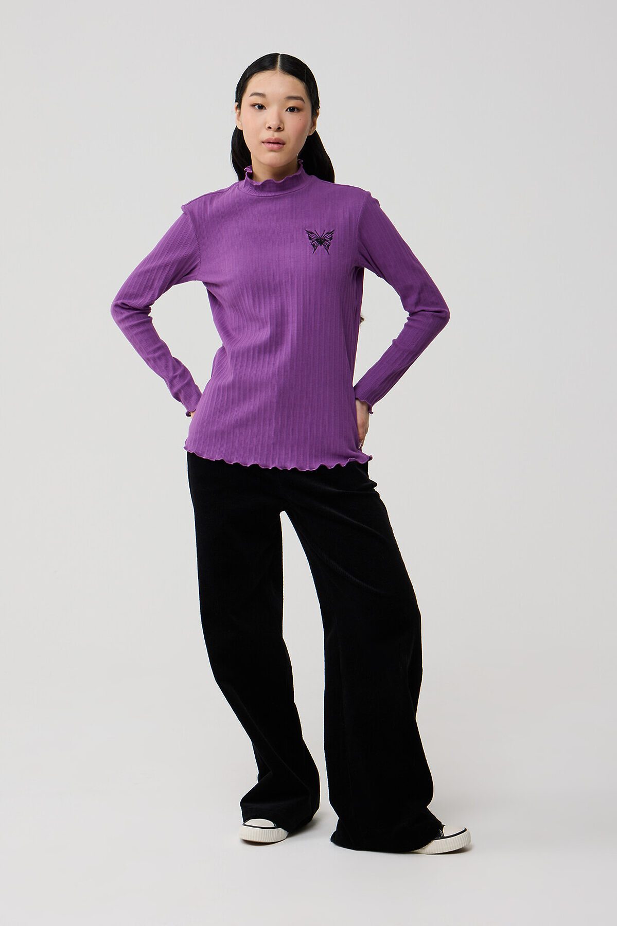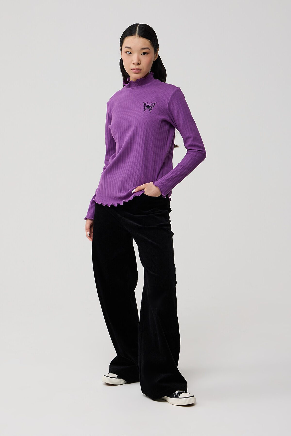 Трикотажная водолазка с длинным рукавом. Высокий воротник-стойка обеспечит дополнительное тепло в прохладное время года. Изделие дополнено трендовая вышивкой на груди. Низ изделия, а также рукава оформлены волнистым краем. Подходит для повседневных образов. Доступна в 2 расцветках.
