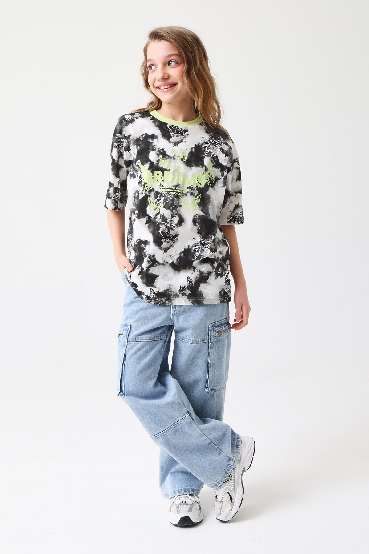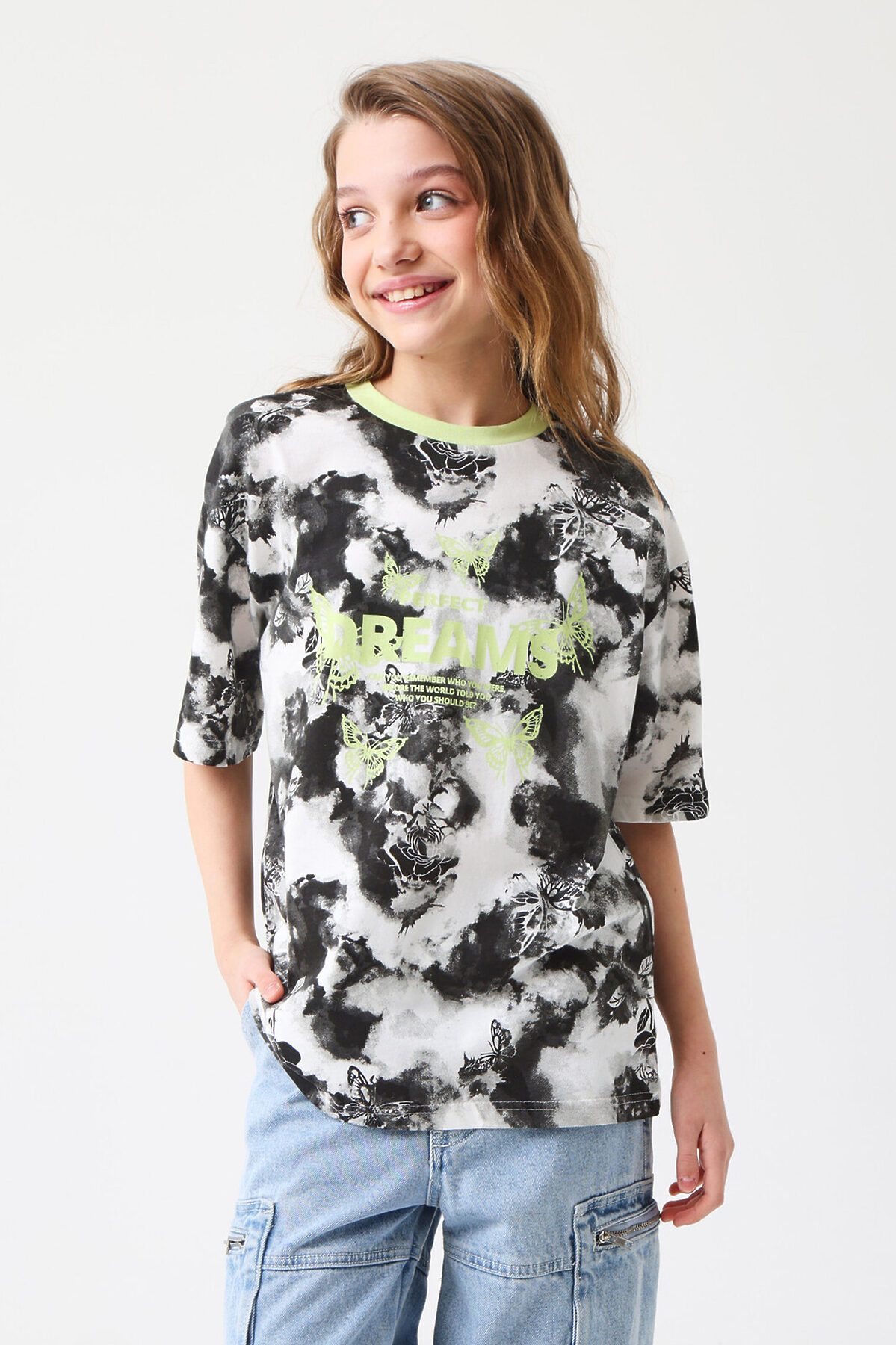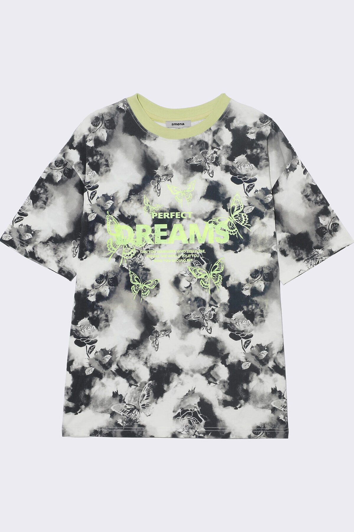 Футболка свободного кроя с короткими рукавами. Модель в трендовом оверсайз силуэте с эффектом "тай-дай" также дополнена большим креативным принтом с яркой надписью на груди. Воротник футболки оформлен контрастной трикотажной резинкой. Отлично подойдет для активного отдыха и повседневной носки. Доступна в 2 цветах.
