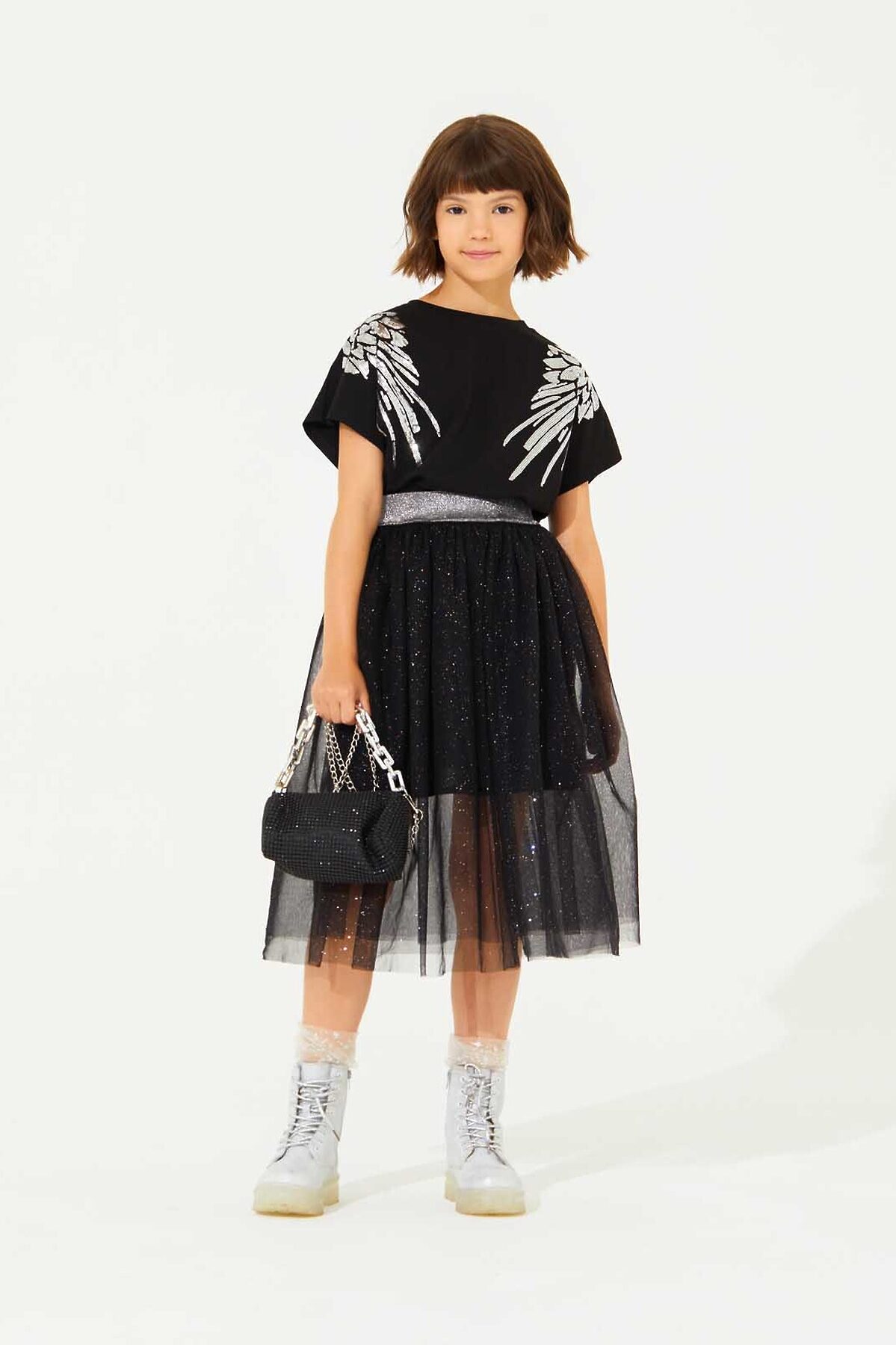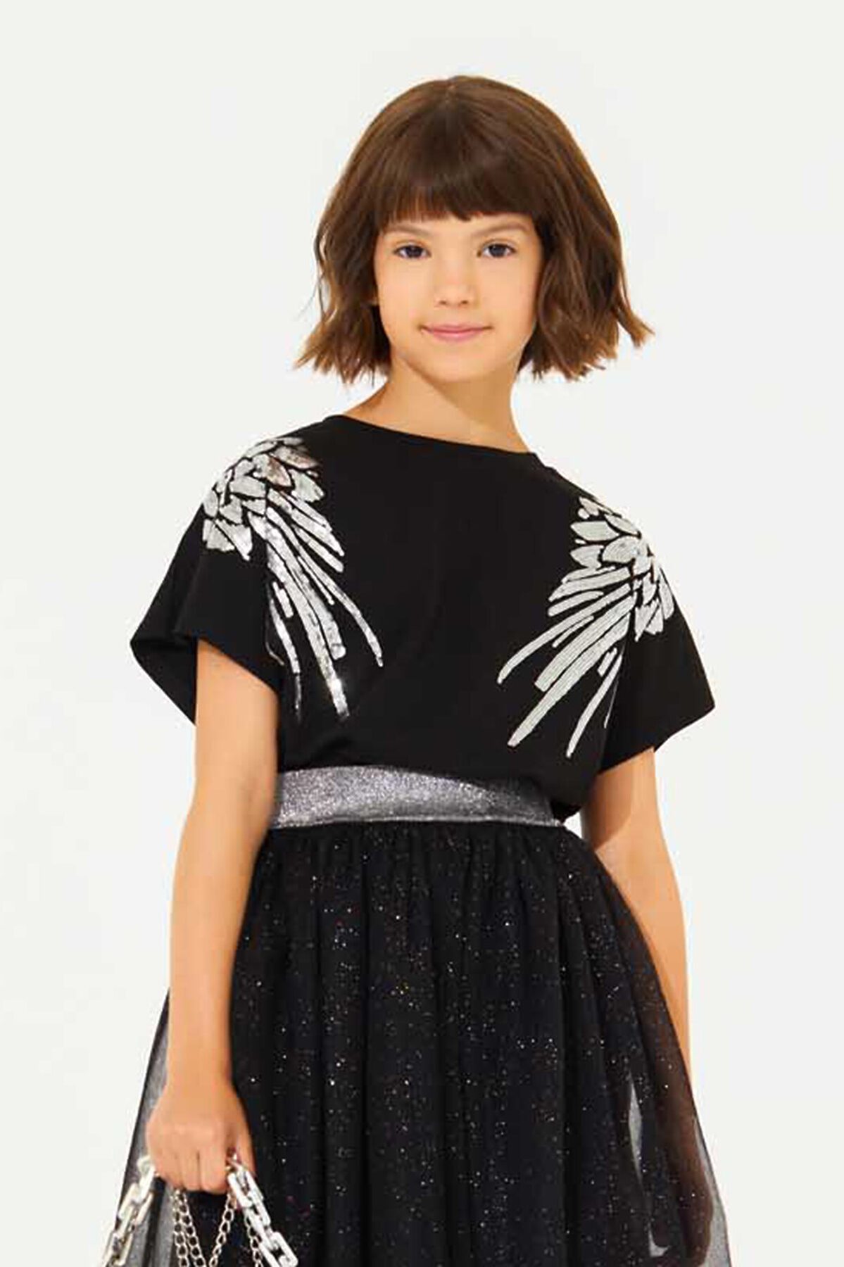Стильная футболка для девочек свободного силуэта, которая подойдет для любого праздника. Она идеально сочетается как с брюками, так и с юбкой. Футболка изготовлена из мягкого и нежного трикотажа, который прекрасно сидит на фигуре и не сковывает движения. Оригинальная аппликация из блестящих пайеток в виде крыльев ангела придаст образу оригинальности и яркости.