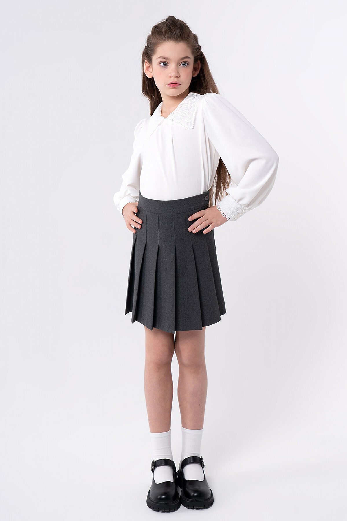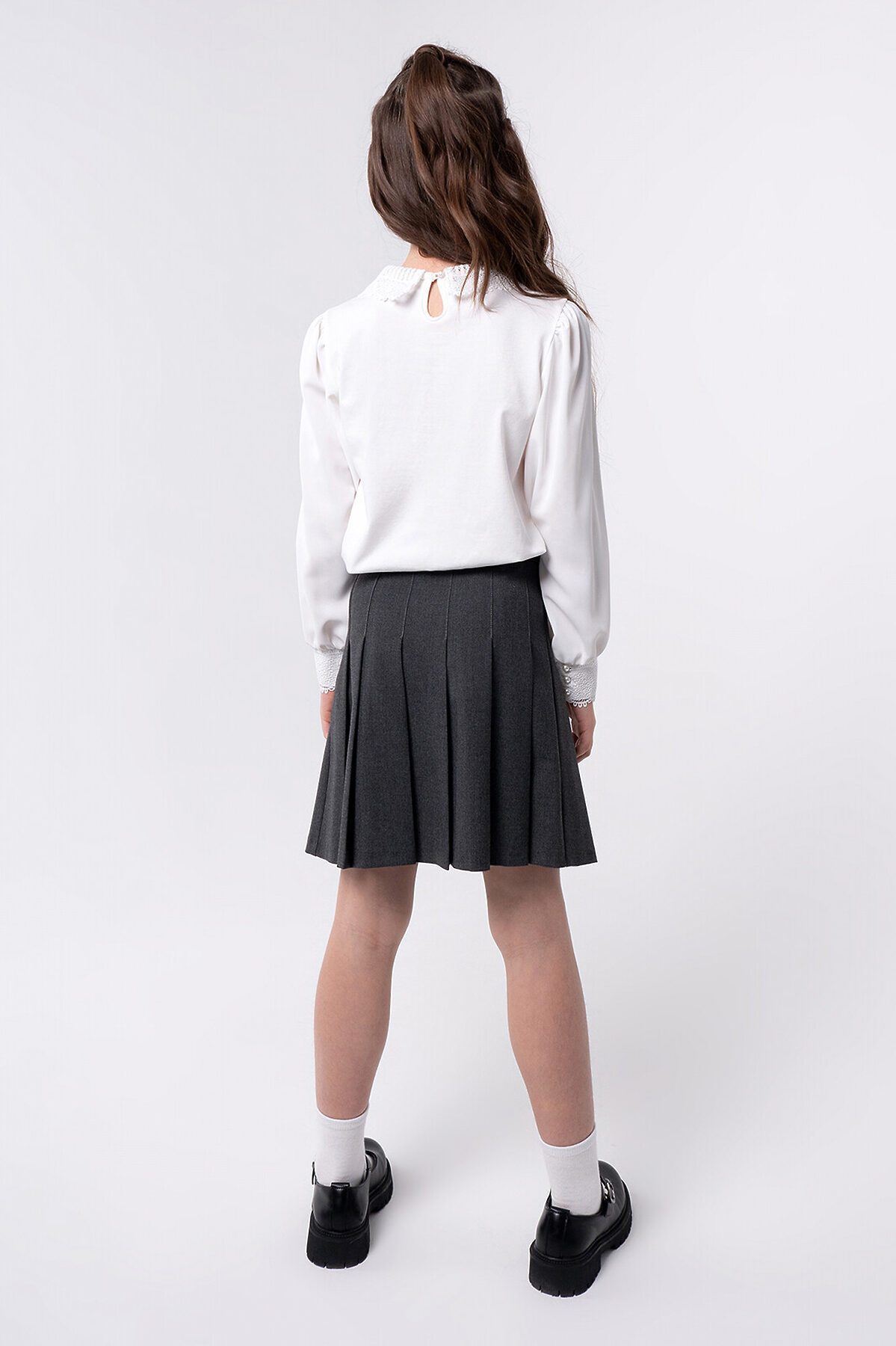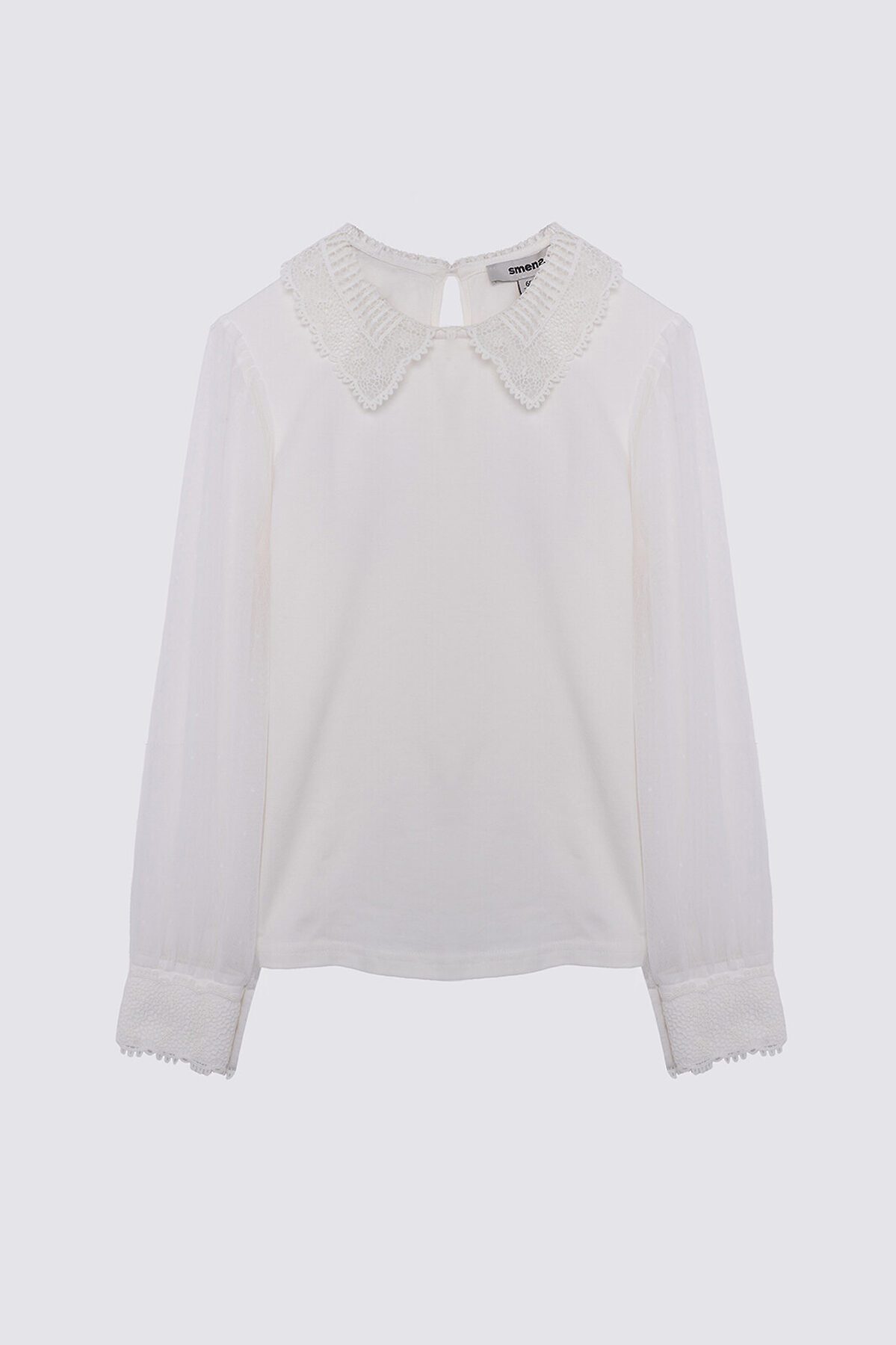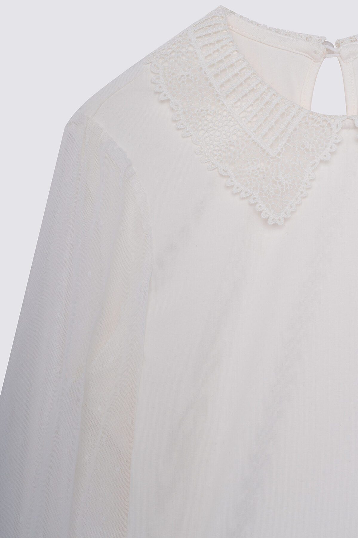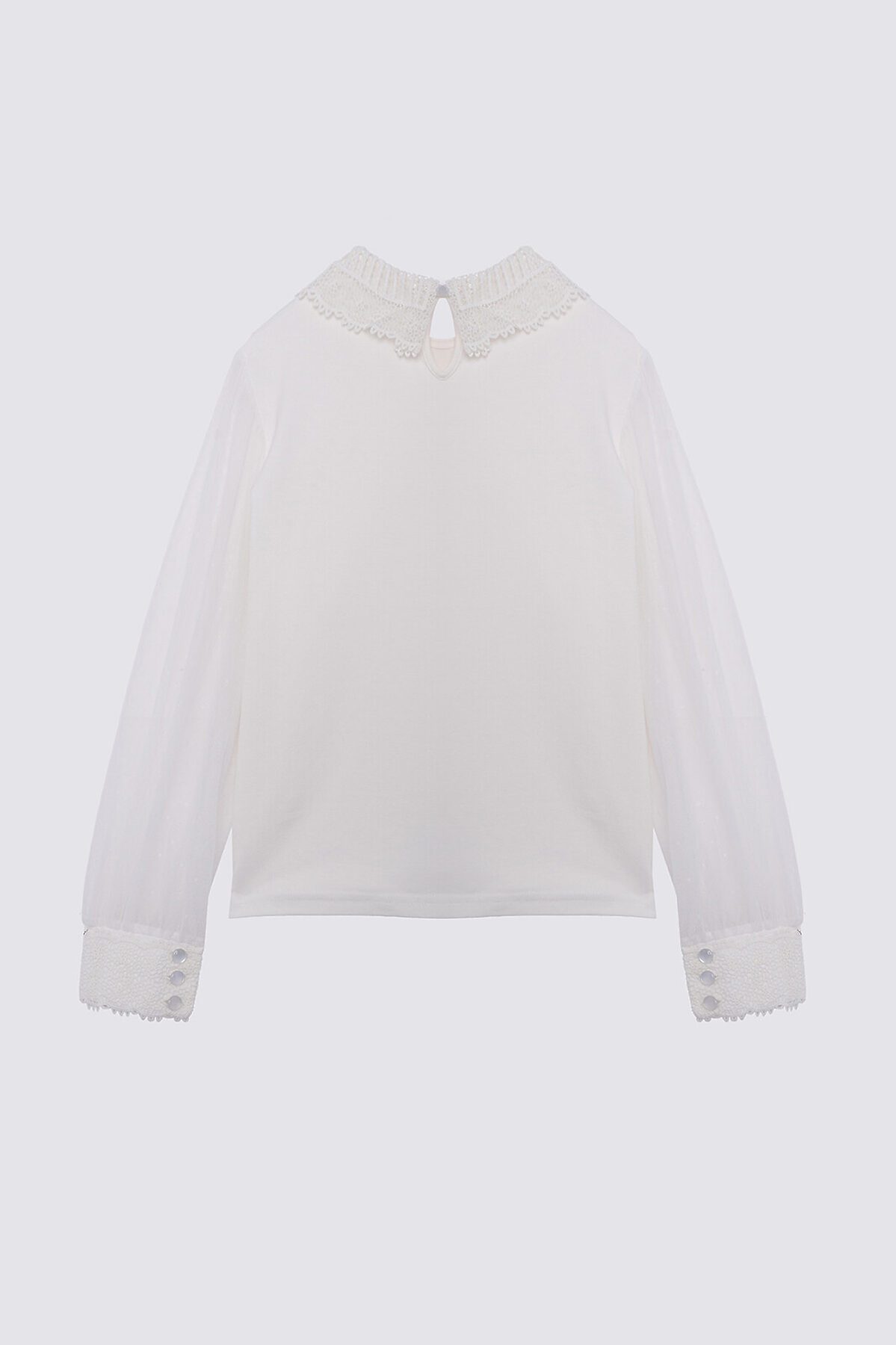 Трикотажная блузка с рукавами из шифона. Воротник и манжеты украшены изящным кружевом. Застежка на спинке на пуговицу.