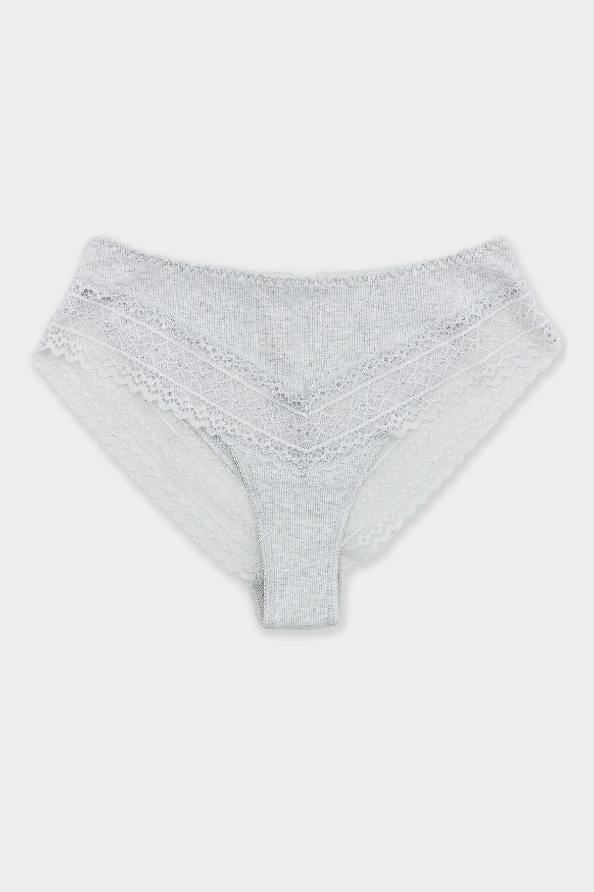 Трусы женские силуэта слип со средней посадкой из рибаны. По талии эластичная тесьма с зубом настрочена на 4-укольном зигзаге. Ножки обработаны узким кружевом шириной, на передней и задней частях со средним швом. Подкладка ластовицы из кулирной глади. Срезы ластовицы обработаны эластичной тесьмой с зубом на п/ш с изнаночной стороны.