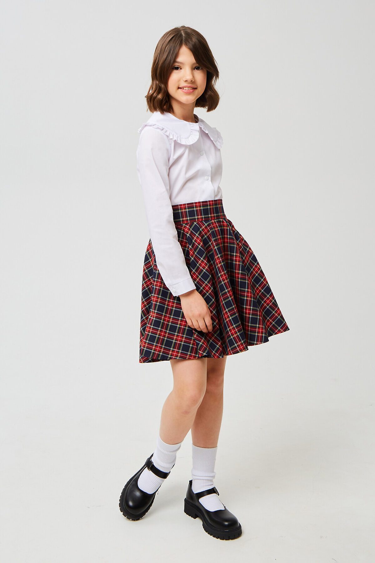 Изящная юбка-солнце для девочки из износостойкой поливискозы с добавлением эластичных волокон, обеспечивающих комфорт в движении. Застёгивается на потайную молнию в боковом шве и две пуговицы на втачном поясе.Пояс с регулируемой резинкой обеспечивает удобную посадку и комфорт в ежедневной носке. Благодаря свойствам ткани юбка отлично держит форму. Длина - чуть выше колена. Отличный вариант на каждый день.