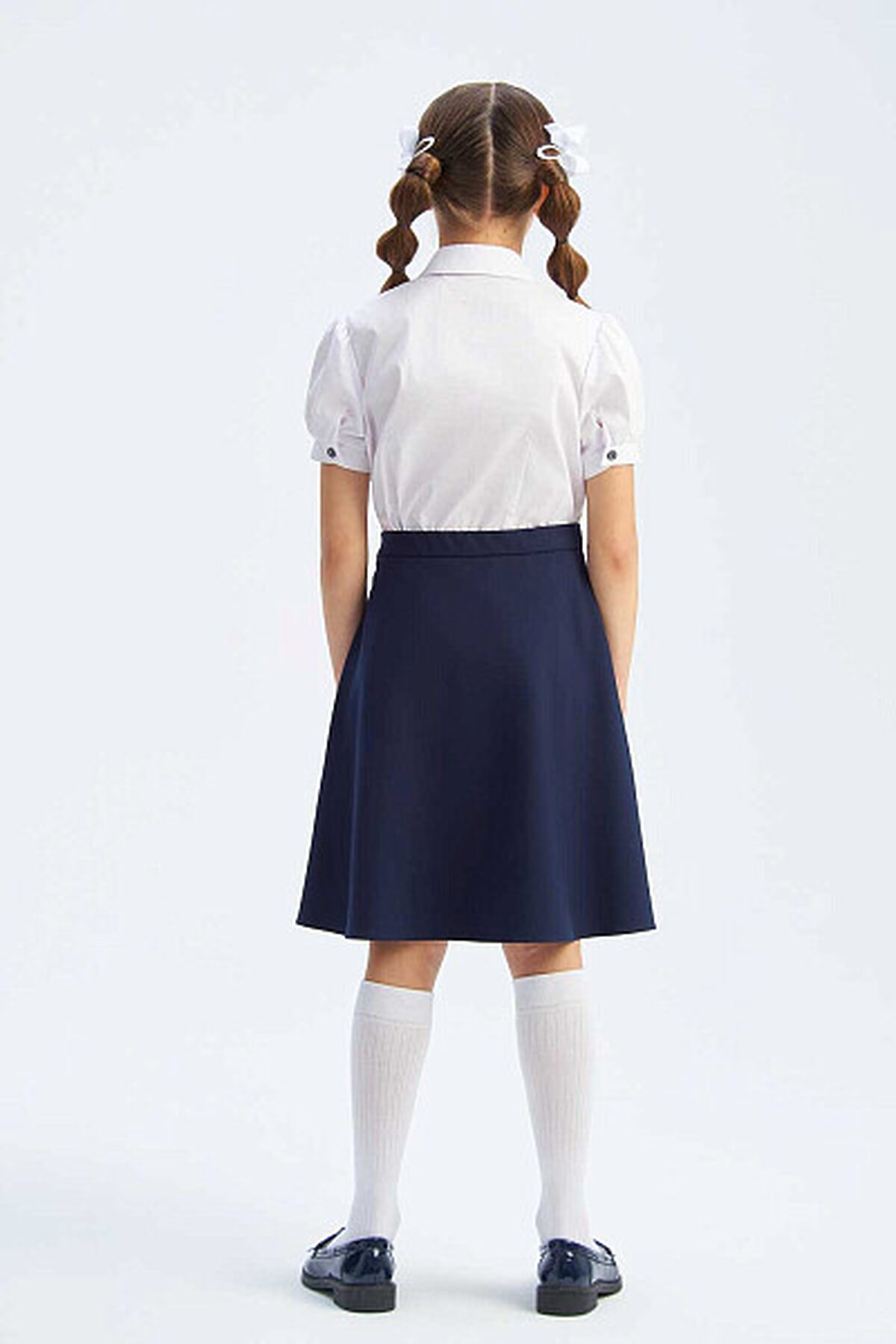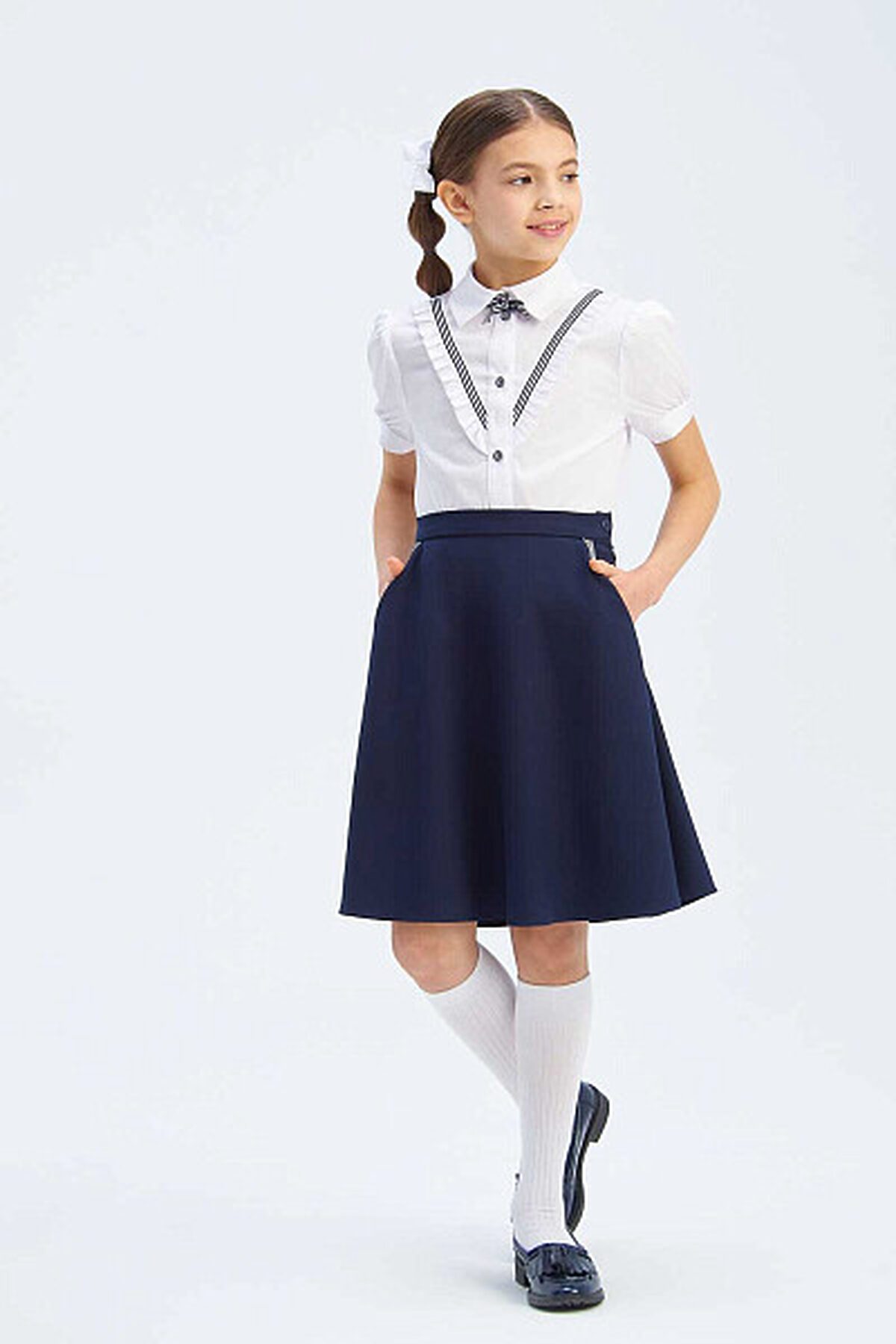 Элегантная юбка А-силуэта из костюмной поливискозы. На переднем полотнище юбки расположены боковые карманы, декорированные лентой в контрастную бело-синюю полоску. Застёгивается на потайную молнию в боковом шве и пуговицу на втачном поясе. Пояс с регулируемой резинкой обеспечивает удобную посадку и комфорт в ежедневной носке.
