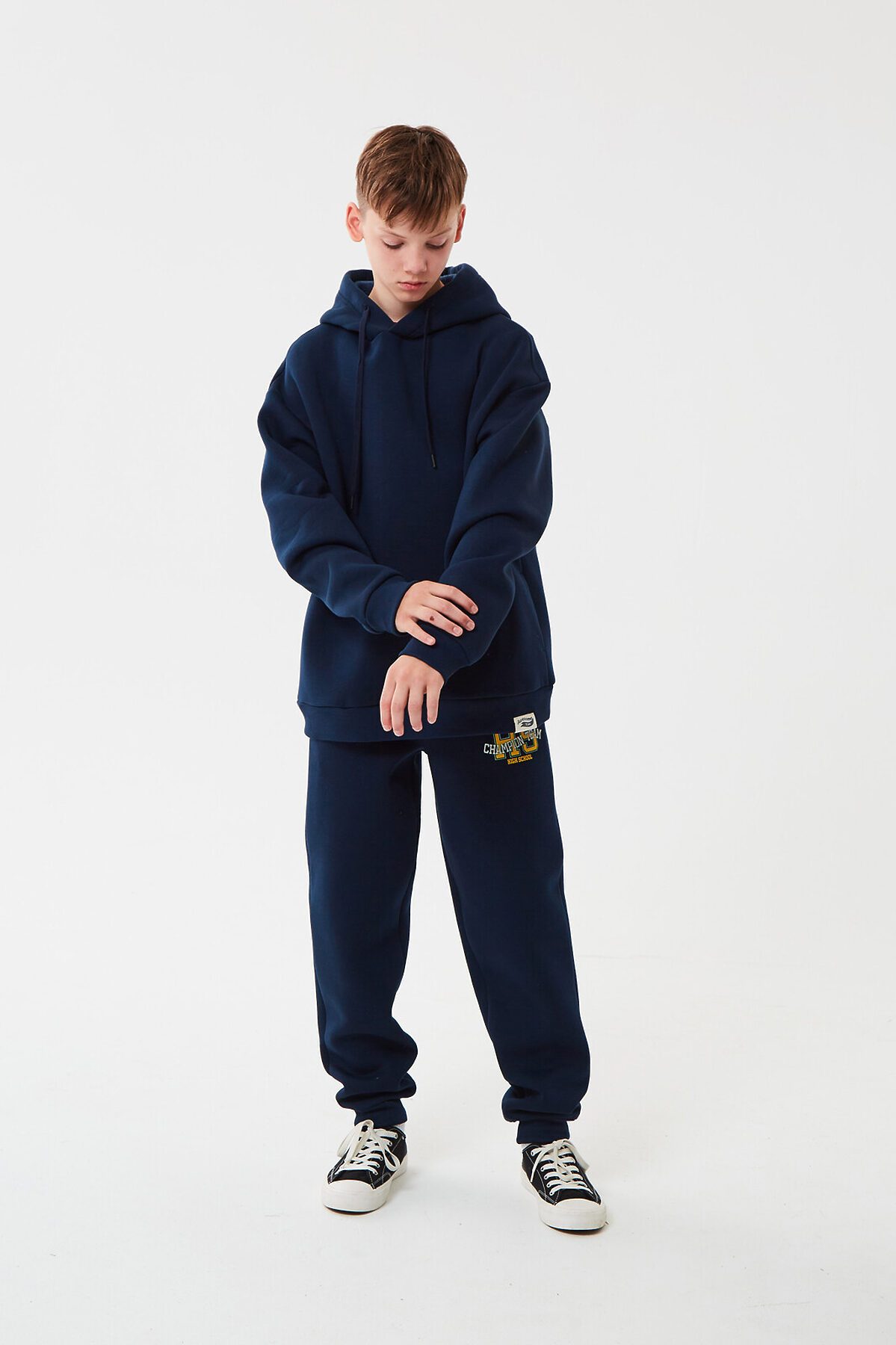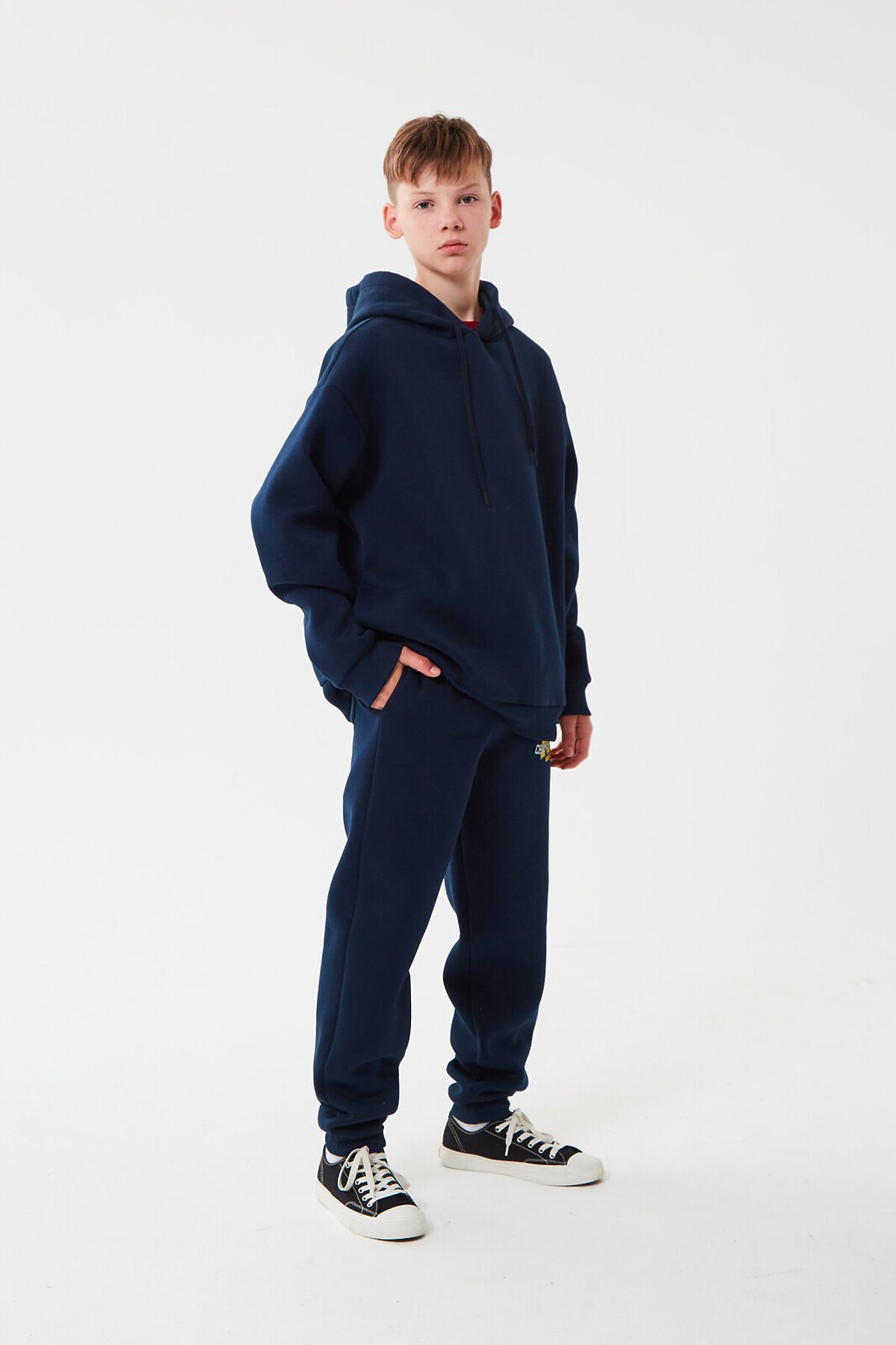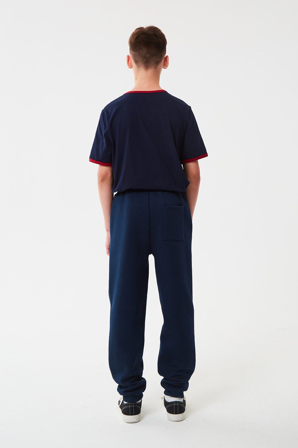 Стильные удобные брюки-джоггеры для мальчиков на широких манжетах. Модель прямого силуэта с поясом на резинке и шнуром для утяжки по талии. Выполнены из теплого футера и дополнены задним карманом. Брюки подходят на тренировку и на прогулку обеспечивают комфорт и стиль. Небольшая печать — лаконичный акцент модели.
